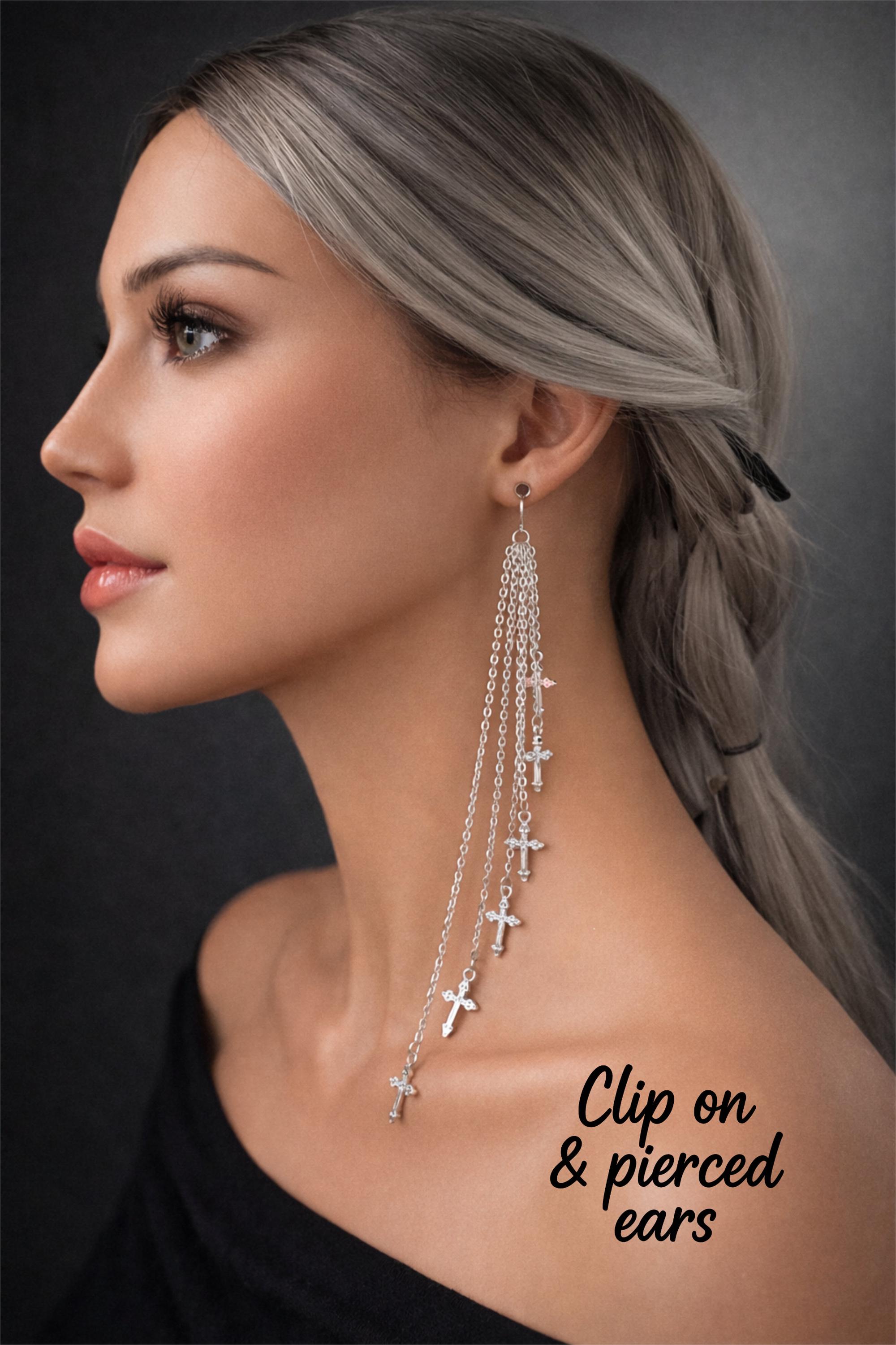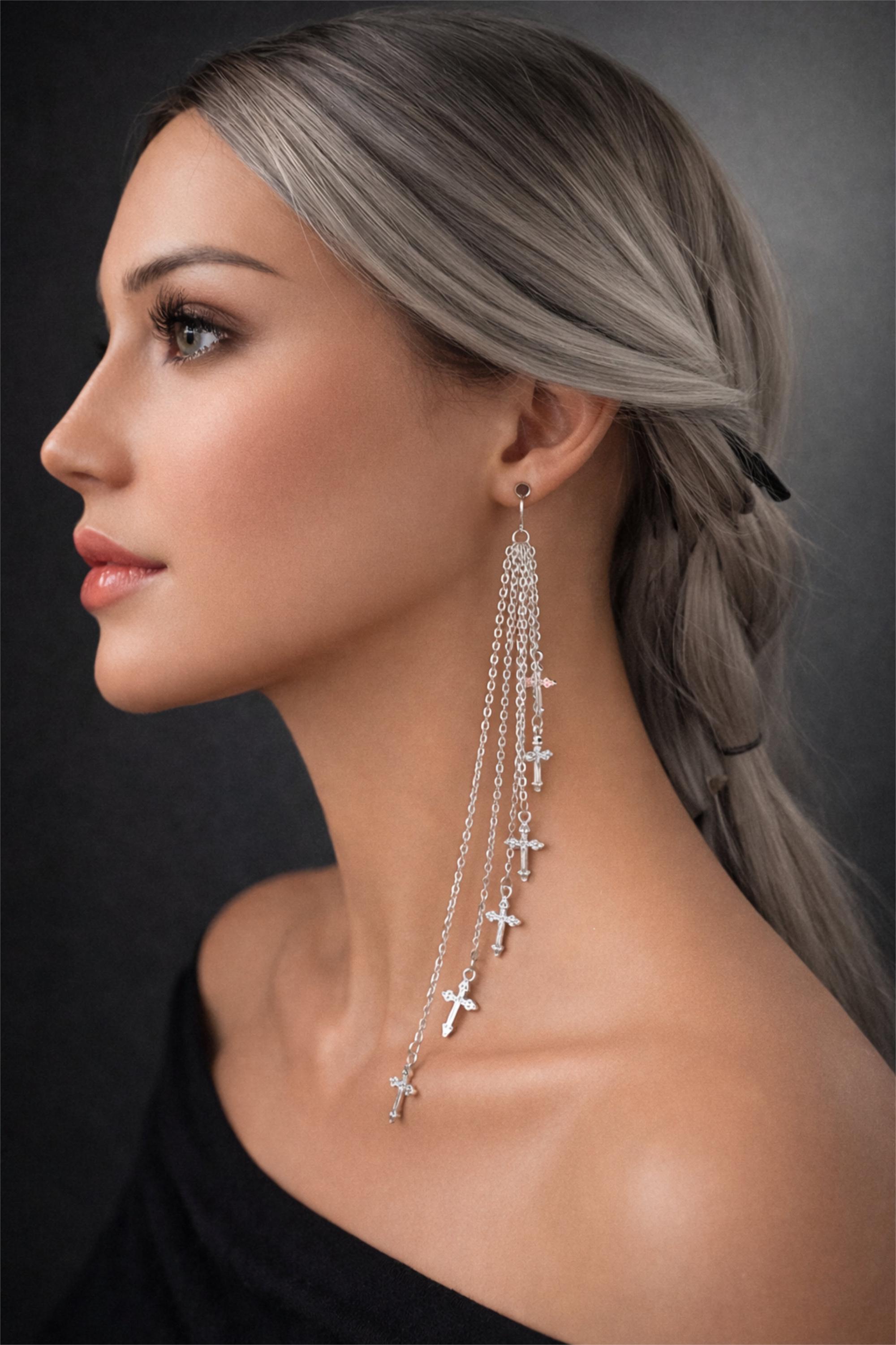 These striking silver cross chain drop earrings feature multiple fine chains finished with delicate cross charms for a bold yet elegant statement look.
