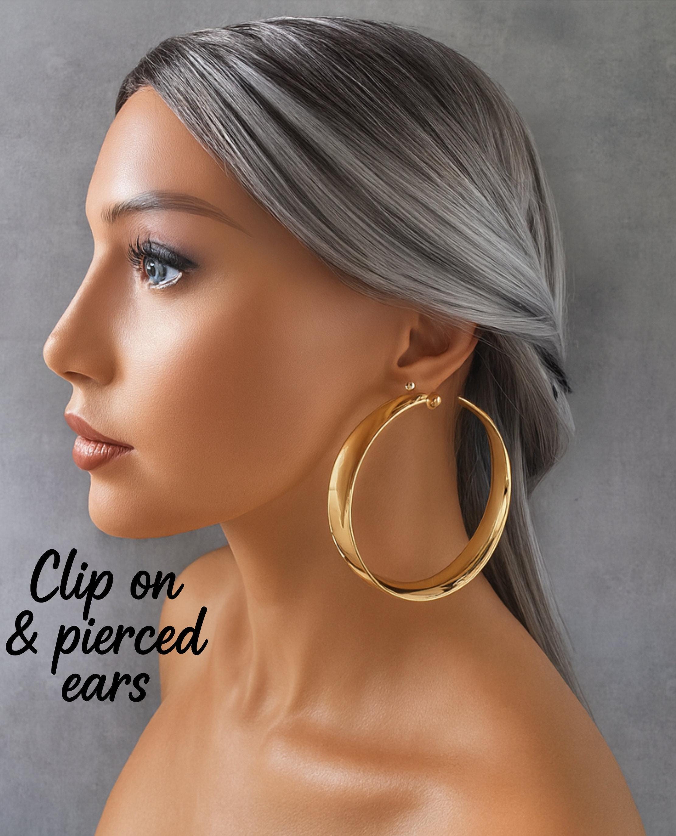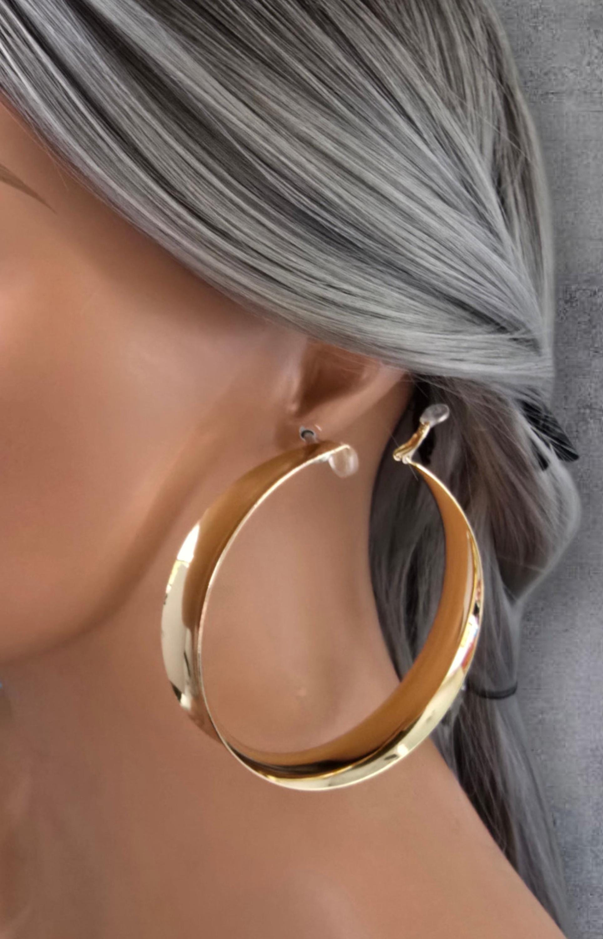 These stunning oversized gold hoops are the perfect statement pair for anyone who loves big, bold earrings, comfortable, and beautifully eye-catching, they add instant glamour to any outfit — day or night. Wide concave tubes.