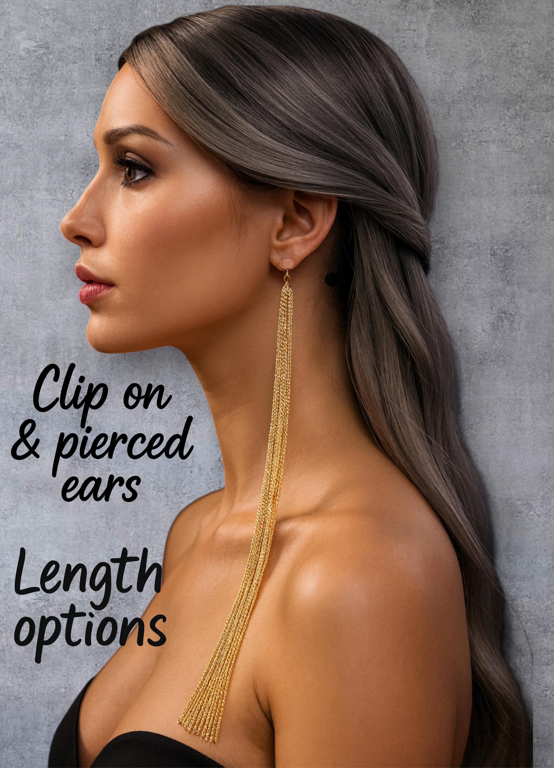 Stunning extra-long chain drop earrings available for both clip-on and pierced ears.