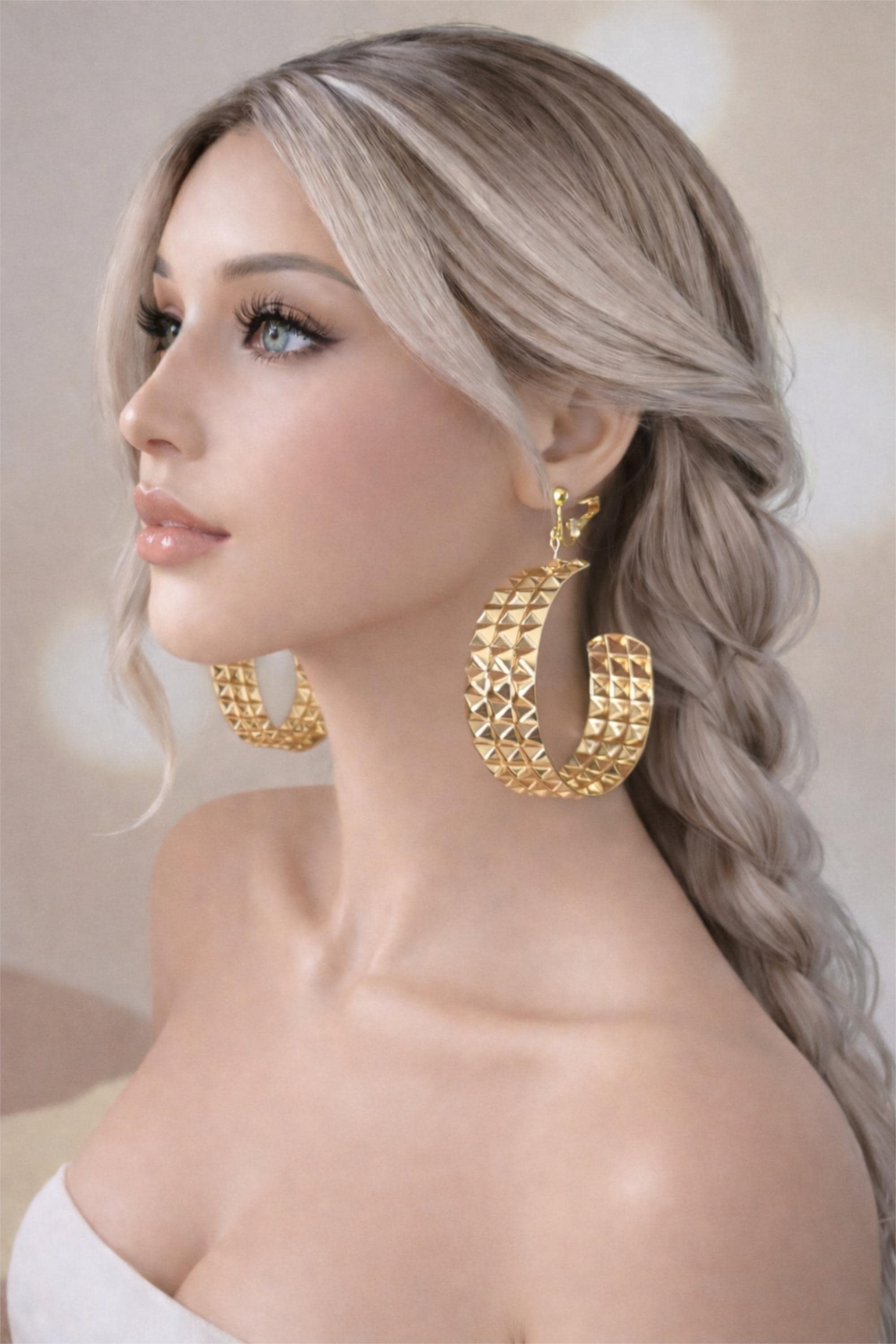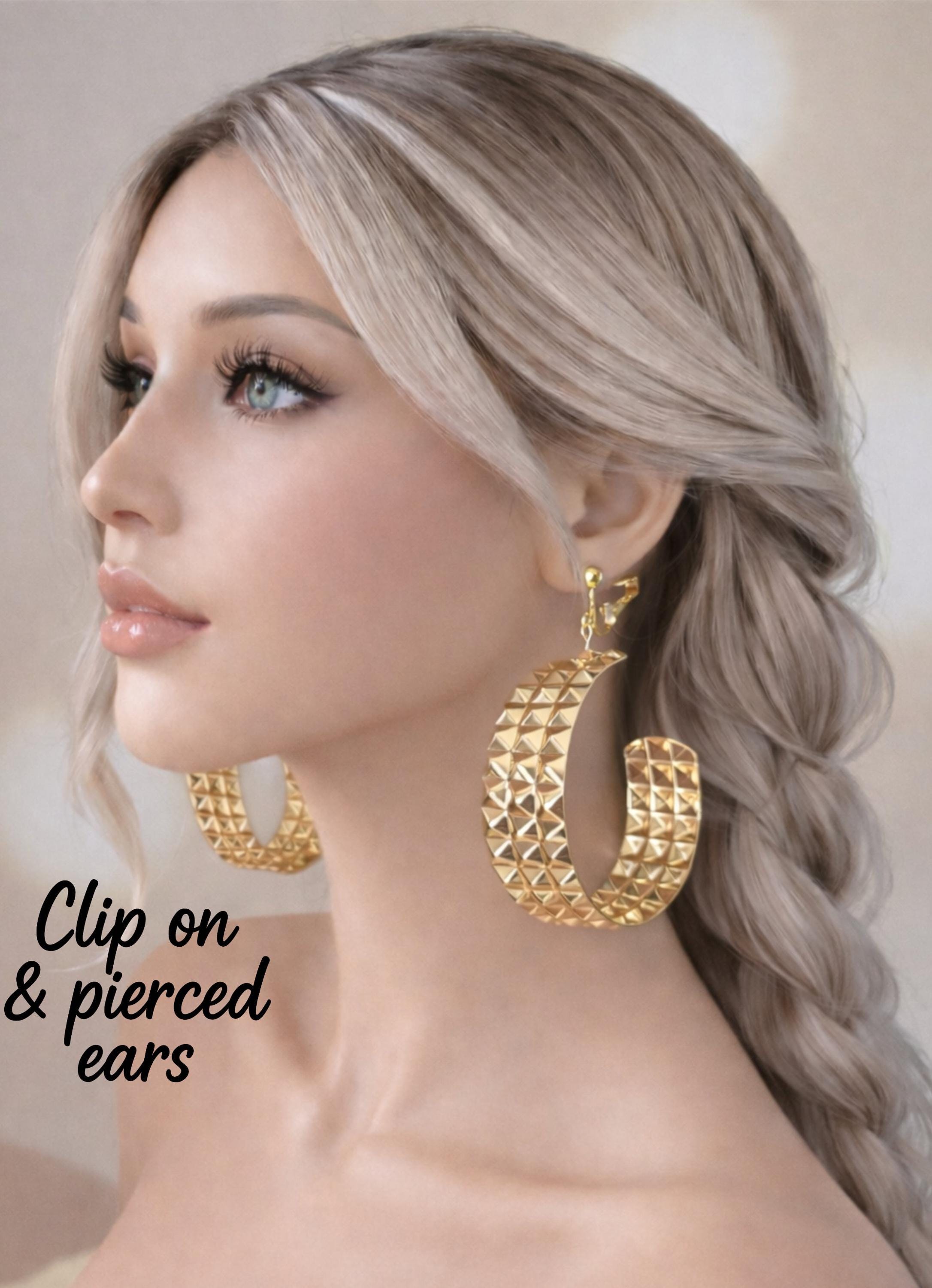 These bold gold tone textured C shape hoop earrings feature a stunning pyramid-stud design that catches the light beautifully from every angle. The faceted detailing gives them a luxe, high-impact look