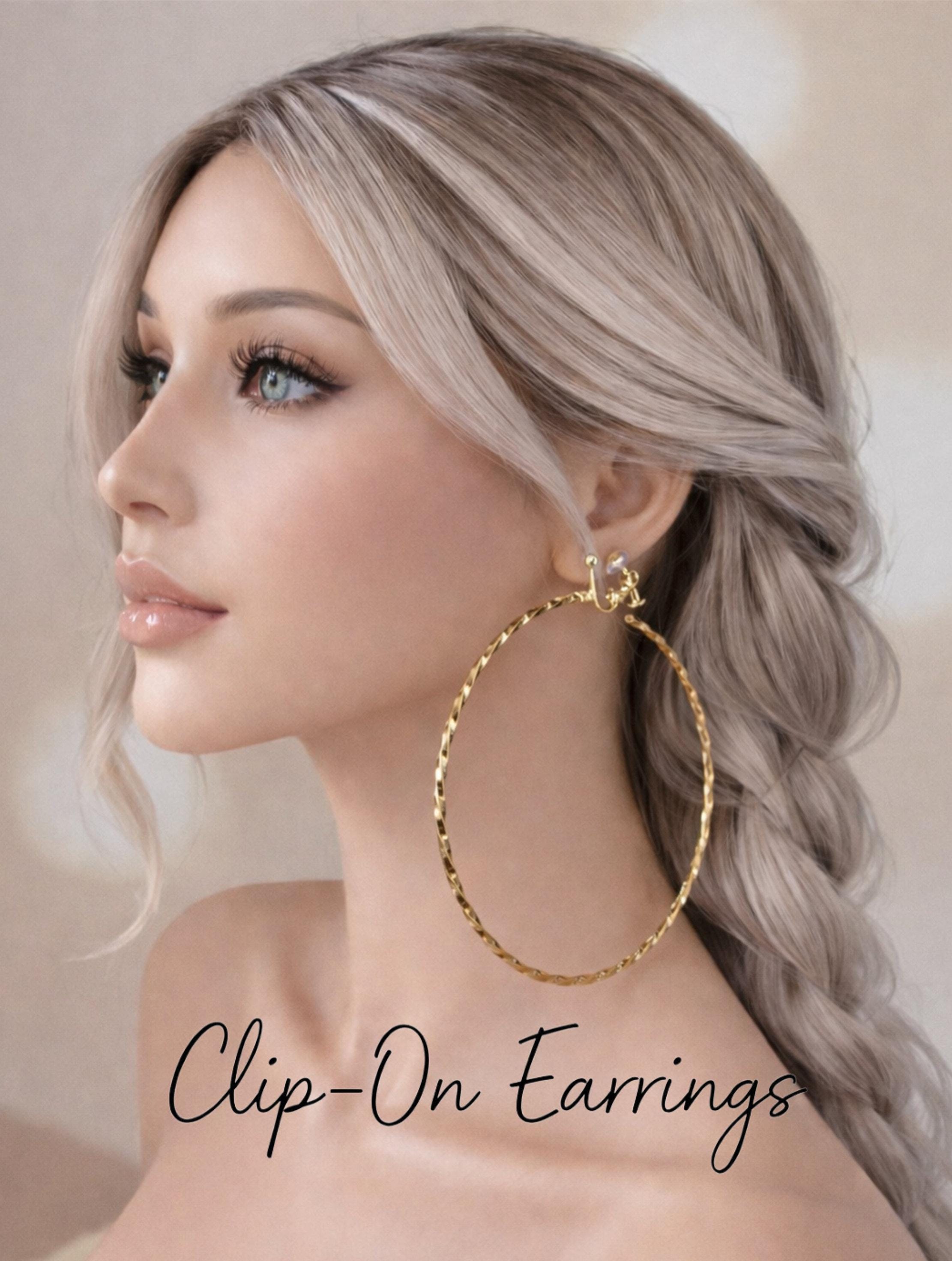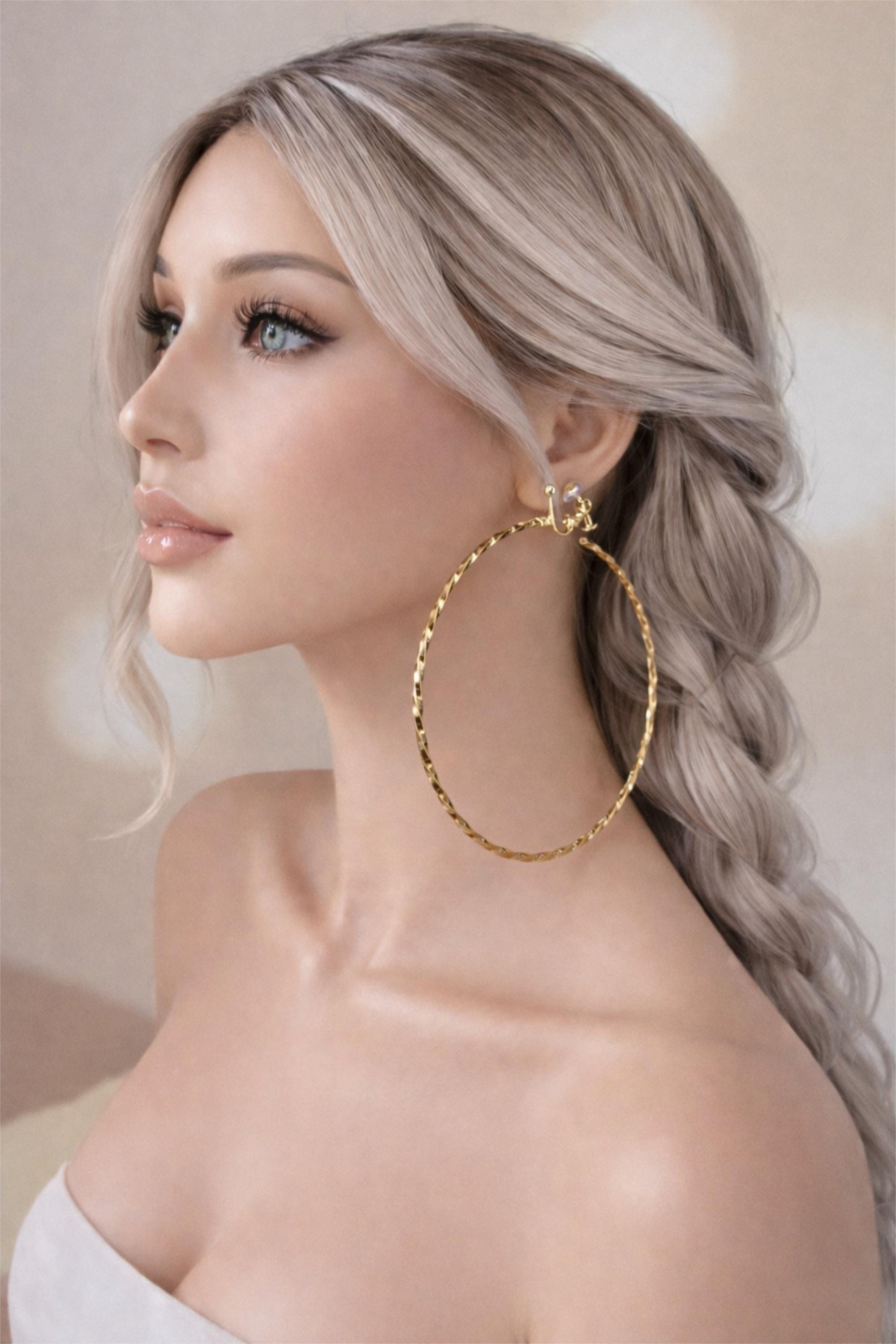 These large gold tone hoops feature a beautiful twisted finish that catches the light from every angle, adding depth and shine. The clip-on fastening allows you to enjoy the look of big statement hoops without needing pierced ears, sitting securely and comfortably on the lobe.