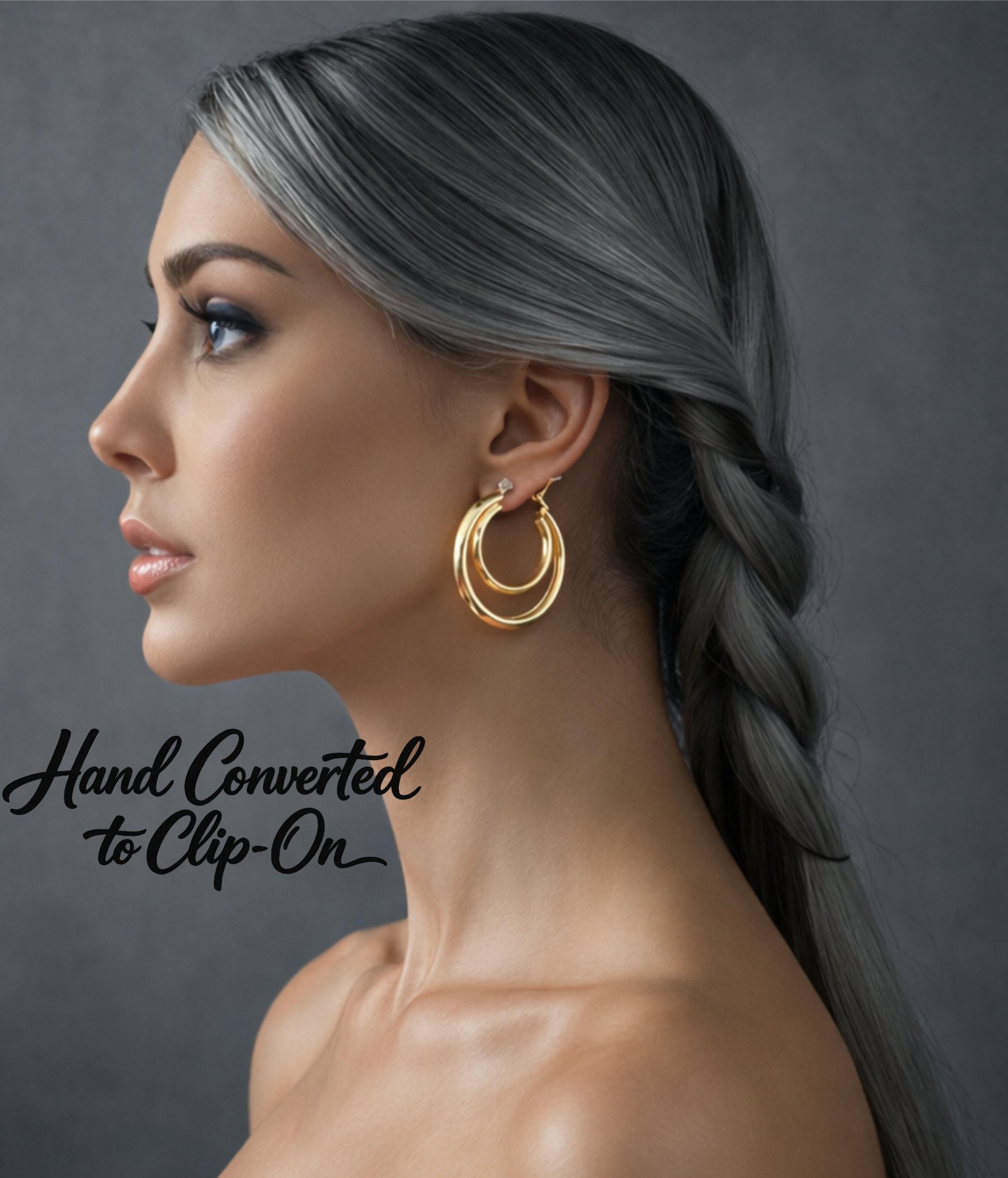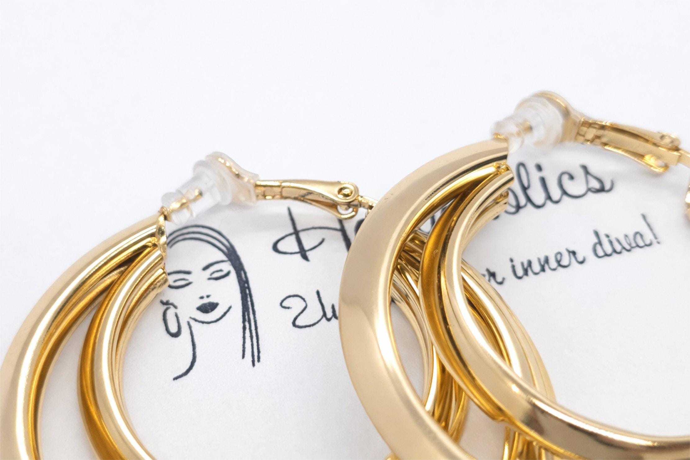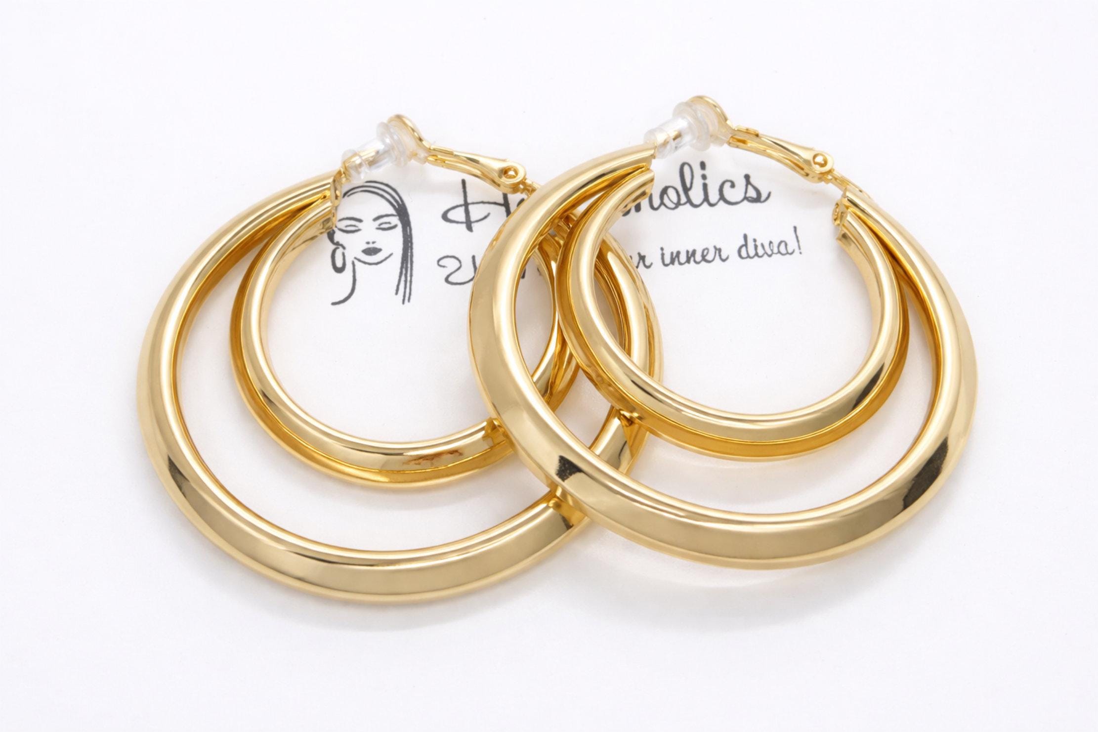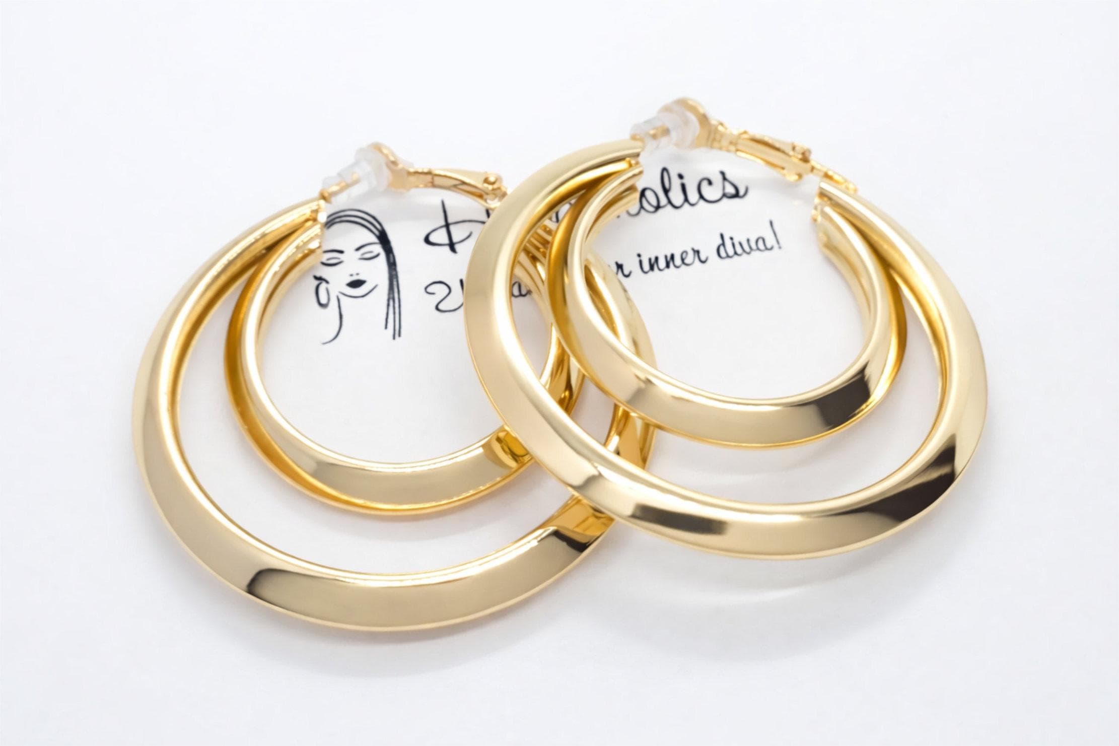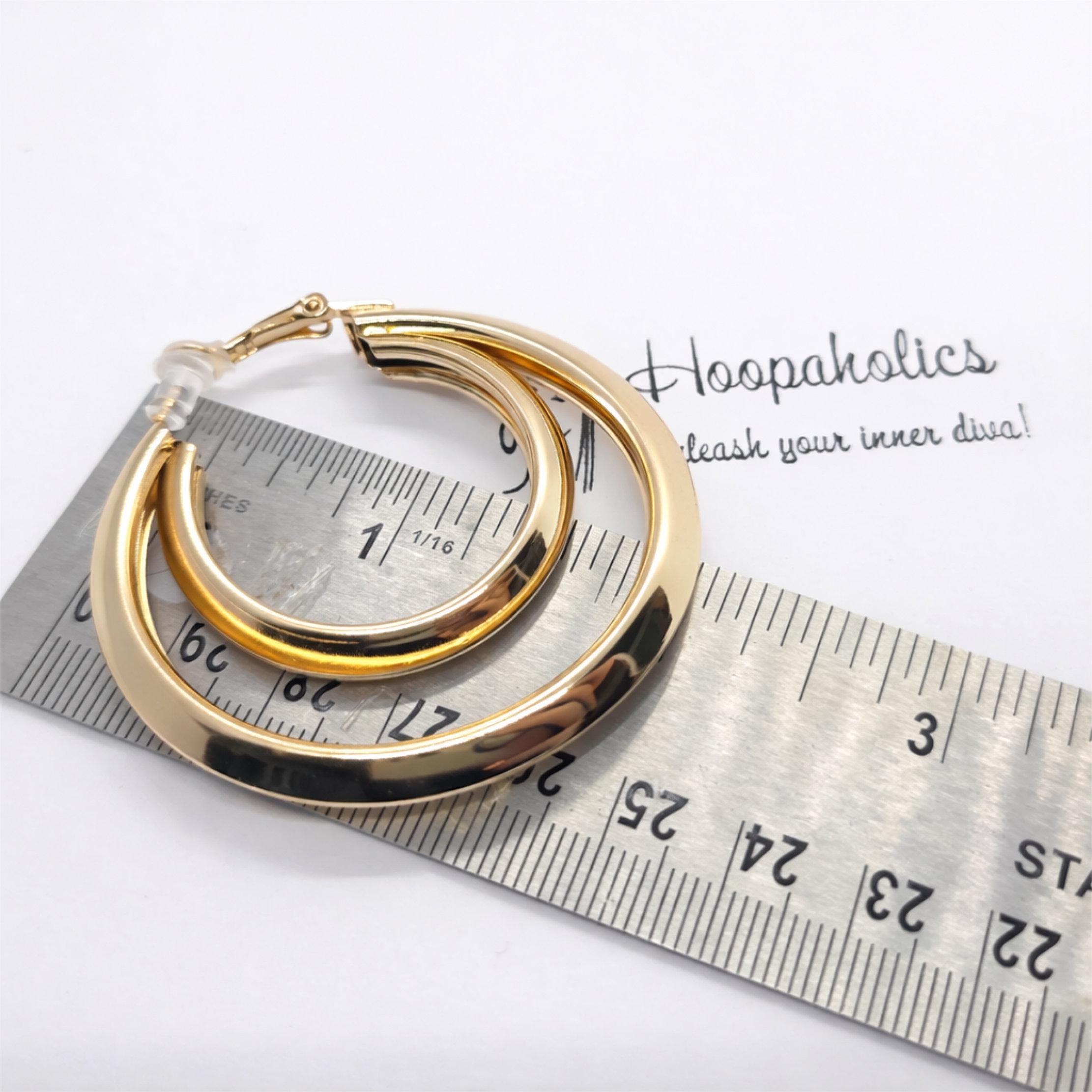 These large gold-tone clip-on hoop earrings feature a bold double-layer hoop design that delivers maximum impact with a comfortable, secure fit.