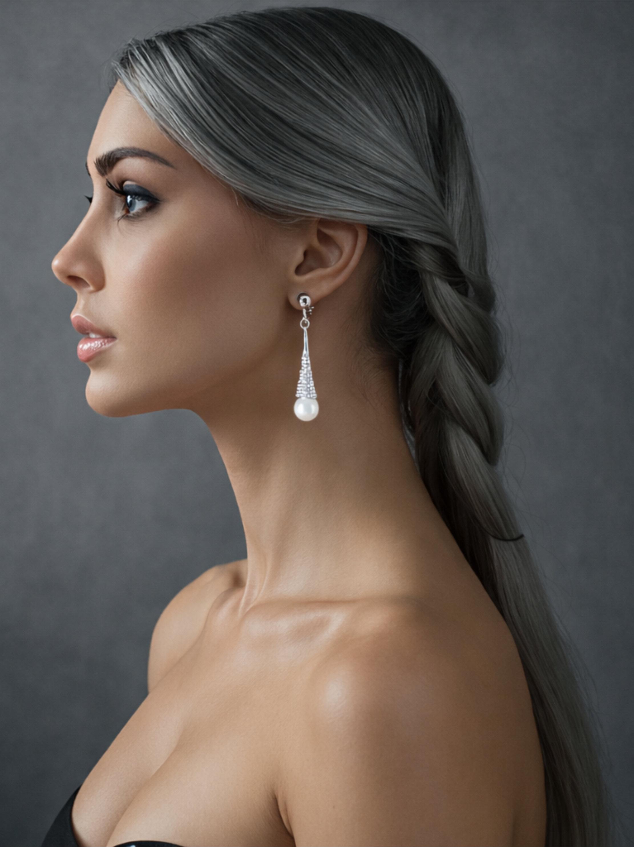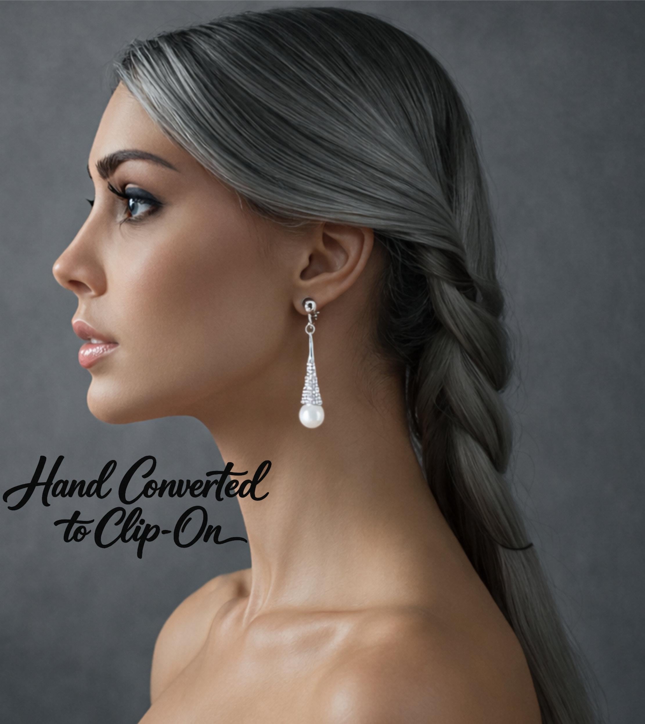 Elegant pearl drop earrings with a sleek silver-tone finish, designed to add effortless glamour without the need for pierced ears. These statement dangles feature a classic white faux pearl bead suspended from a diamante cone detail, creating a timeless yet modern look.