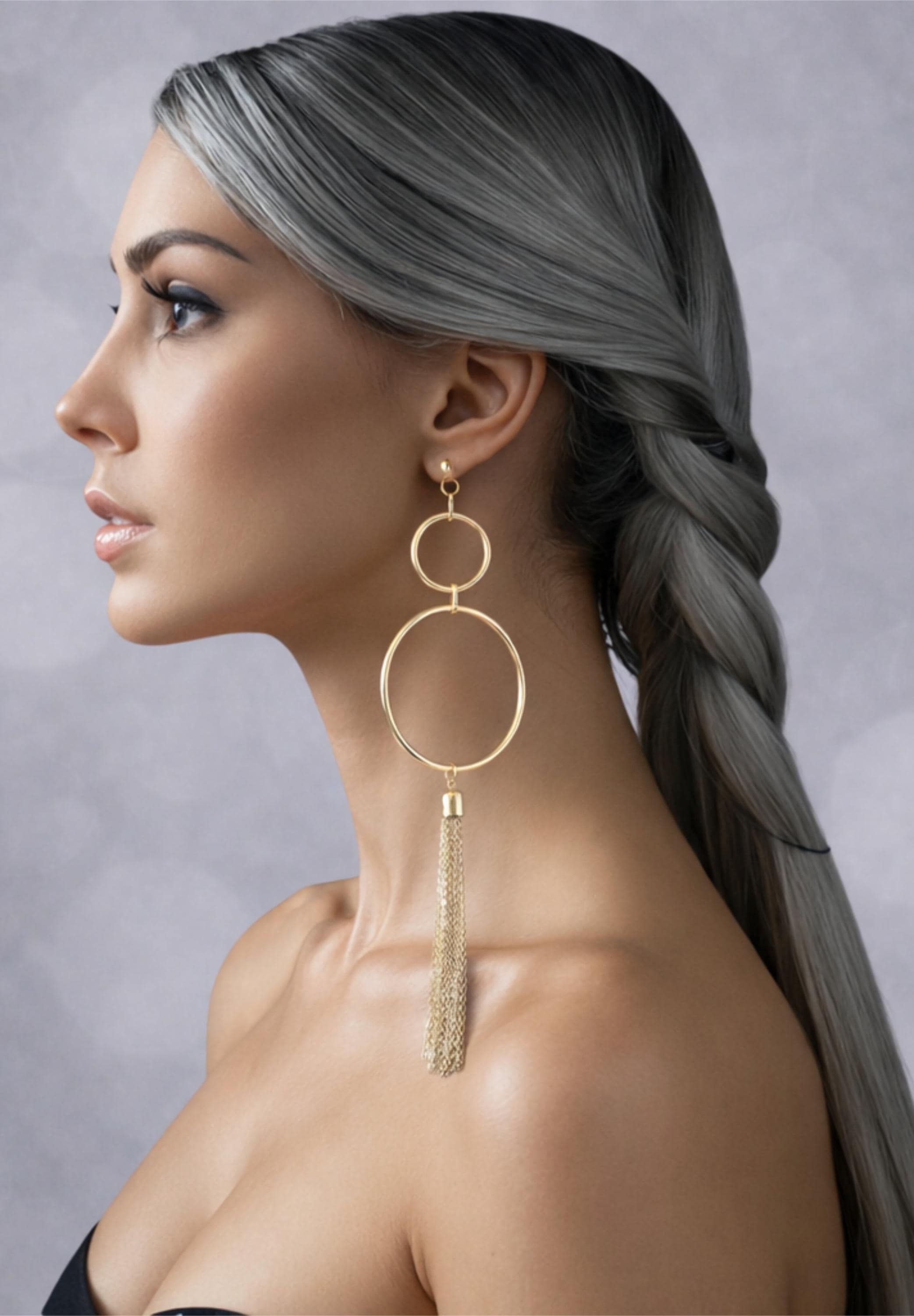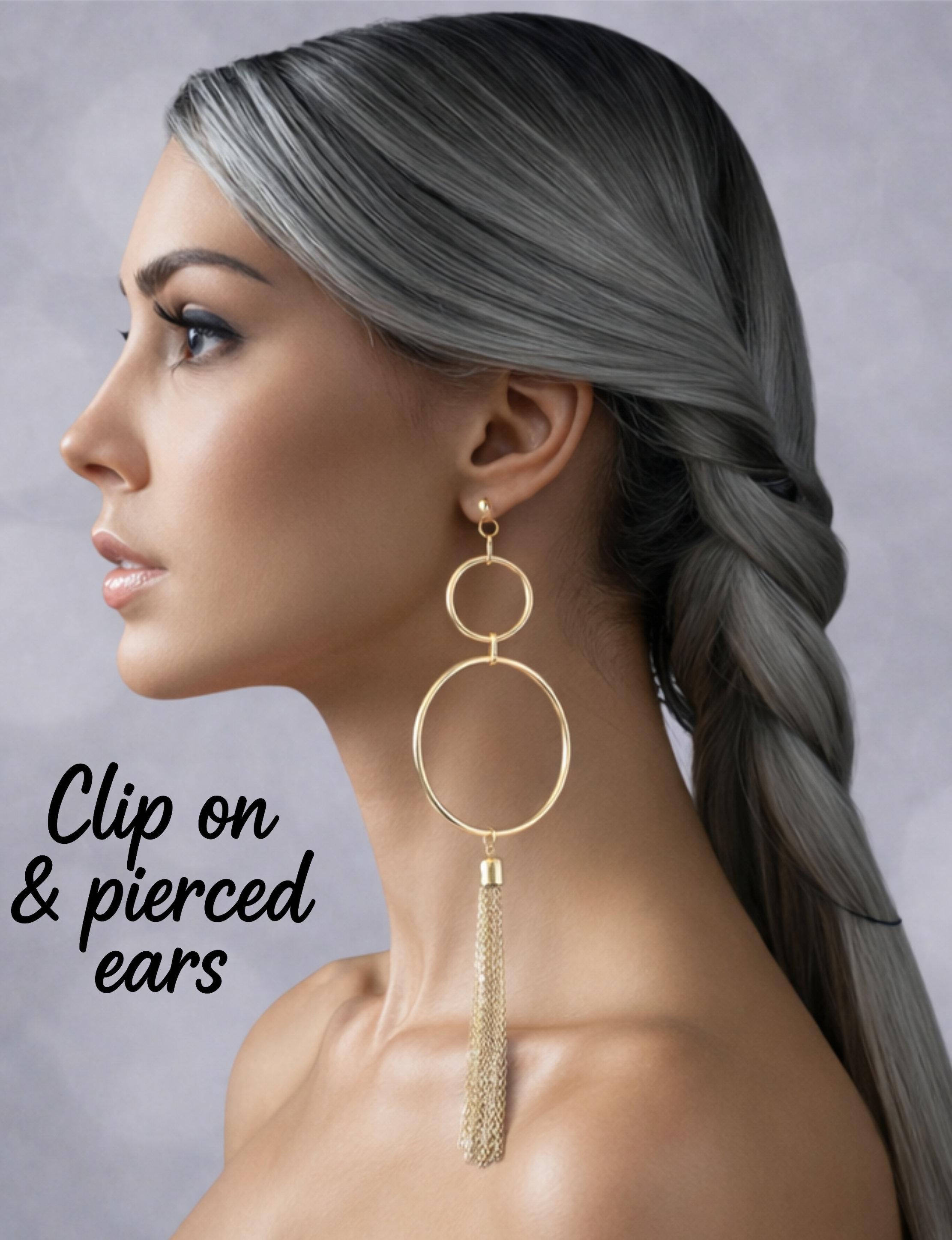 Featuring two sleek polished hoops and a flowing chain tassel, these earrings add movement, elegance and drama to any outfit — perfect for nights out, weddings, holidays or everyday glam.