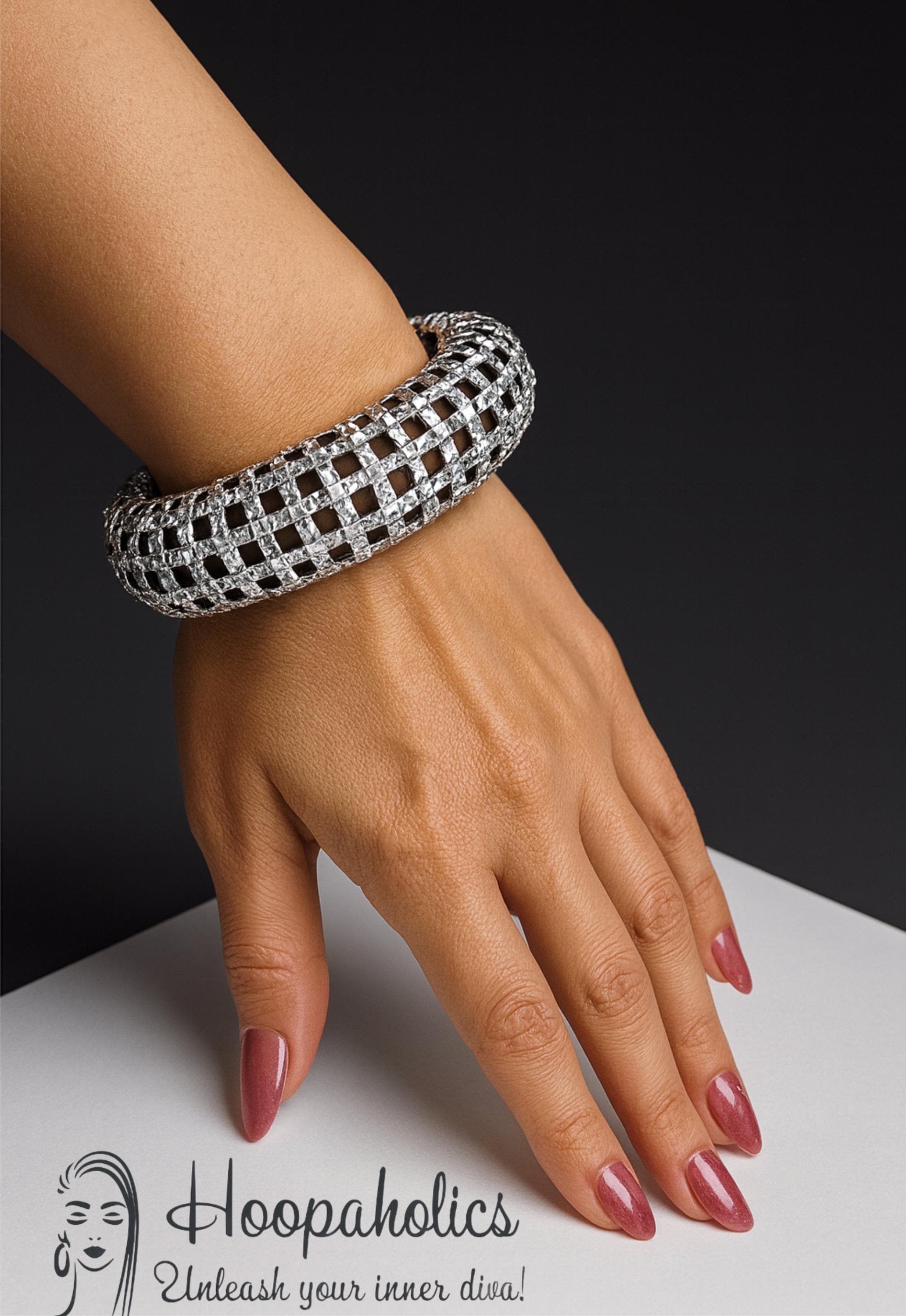 Featuring a beautifully detailed lattice-style design this wide statement cuff is both bold and elegant. The easy-open hinge makes it simple to slip on and off, offering comfort while still giving that luxurious, high-impact look.