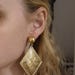 Make a statement with these eye-catching gold tone diamond shape patterned drop earrings. Perfect for any occasion, these earrings will elevate your style and add a touch of elegance to any outfit.