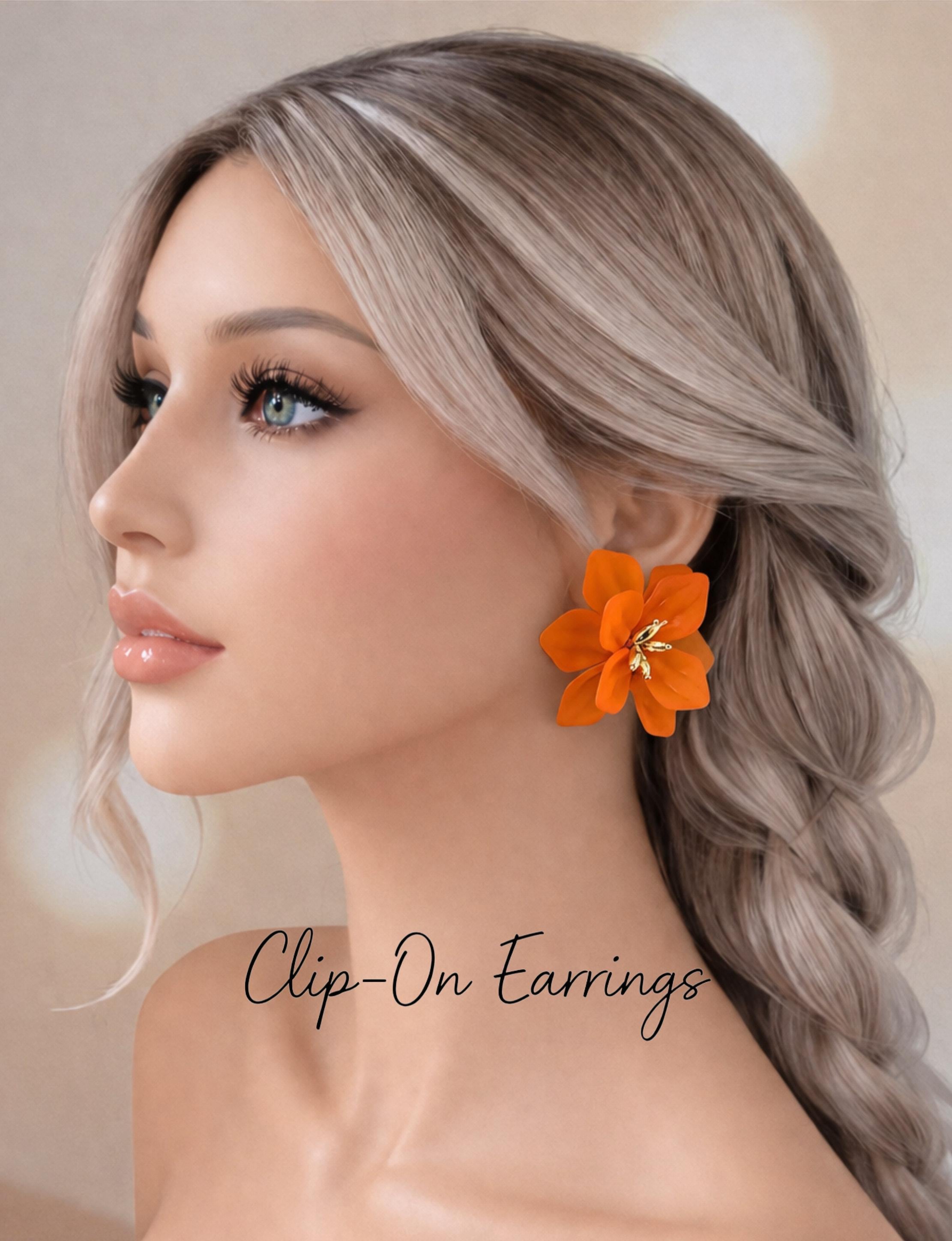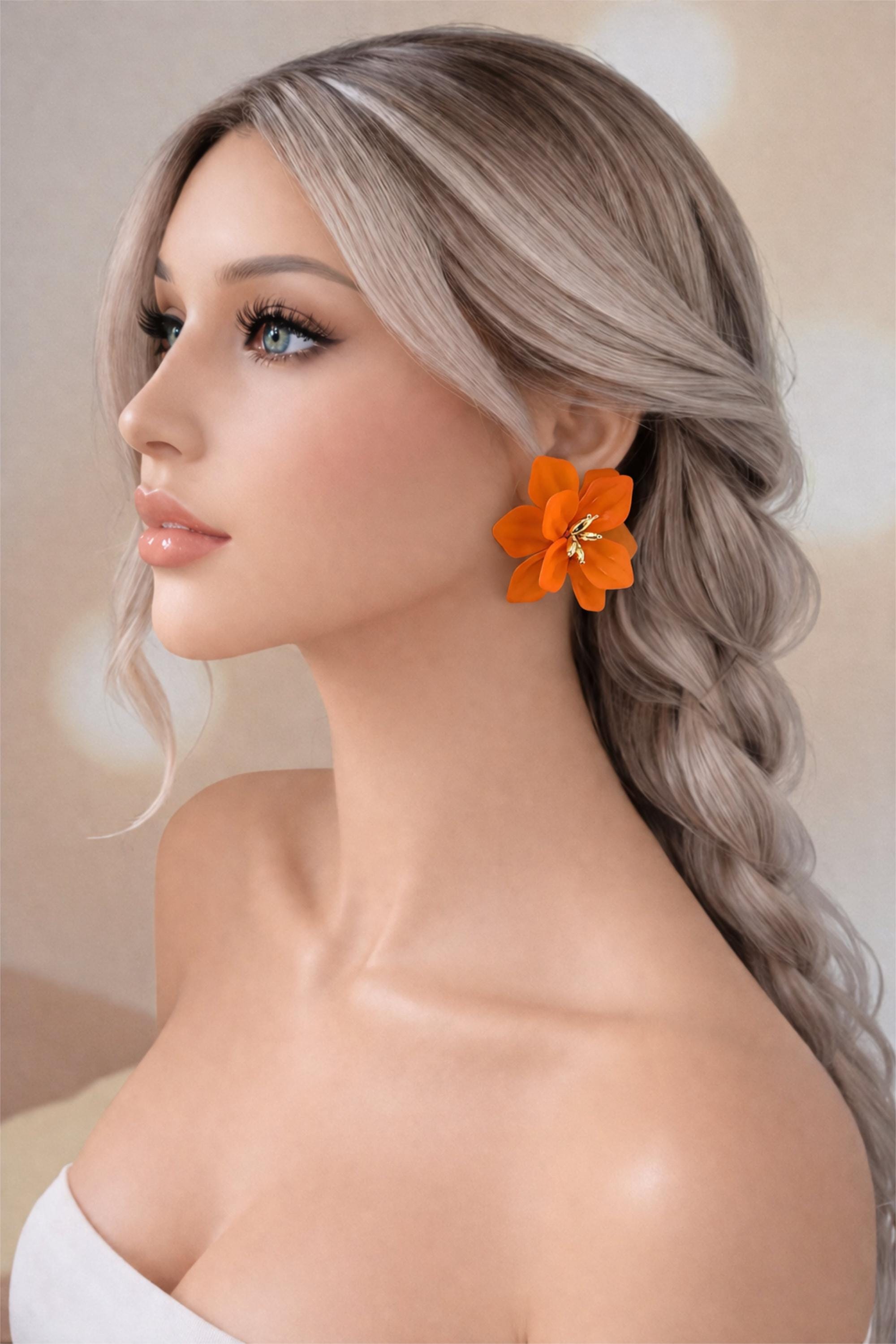 These delicate orange flower earrings feature layered, translucent orange petals with a subtle frosted finish, finished with a warm gold-tone centre for a soft, elegant contrast.