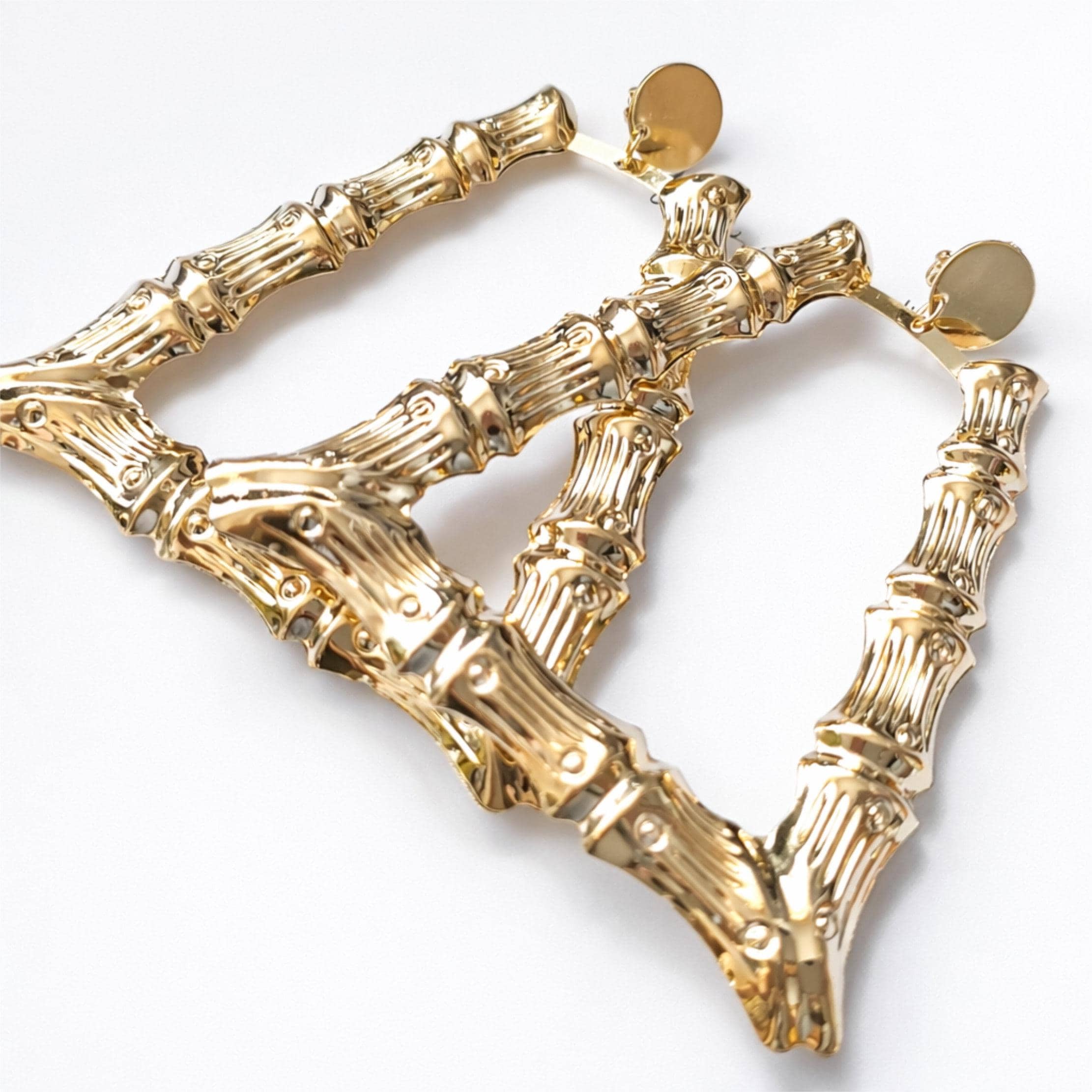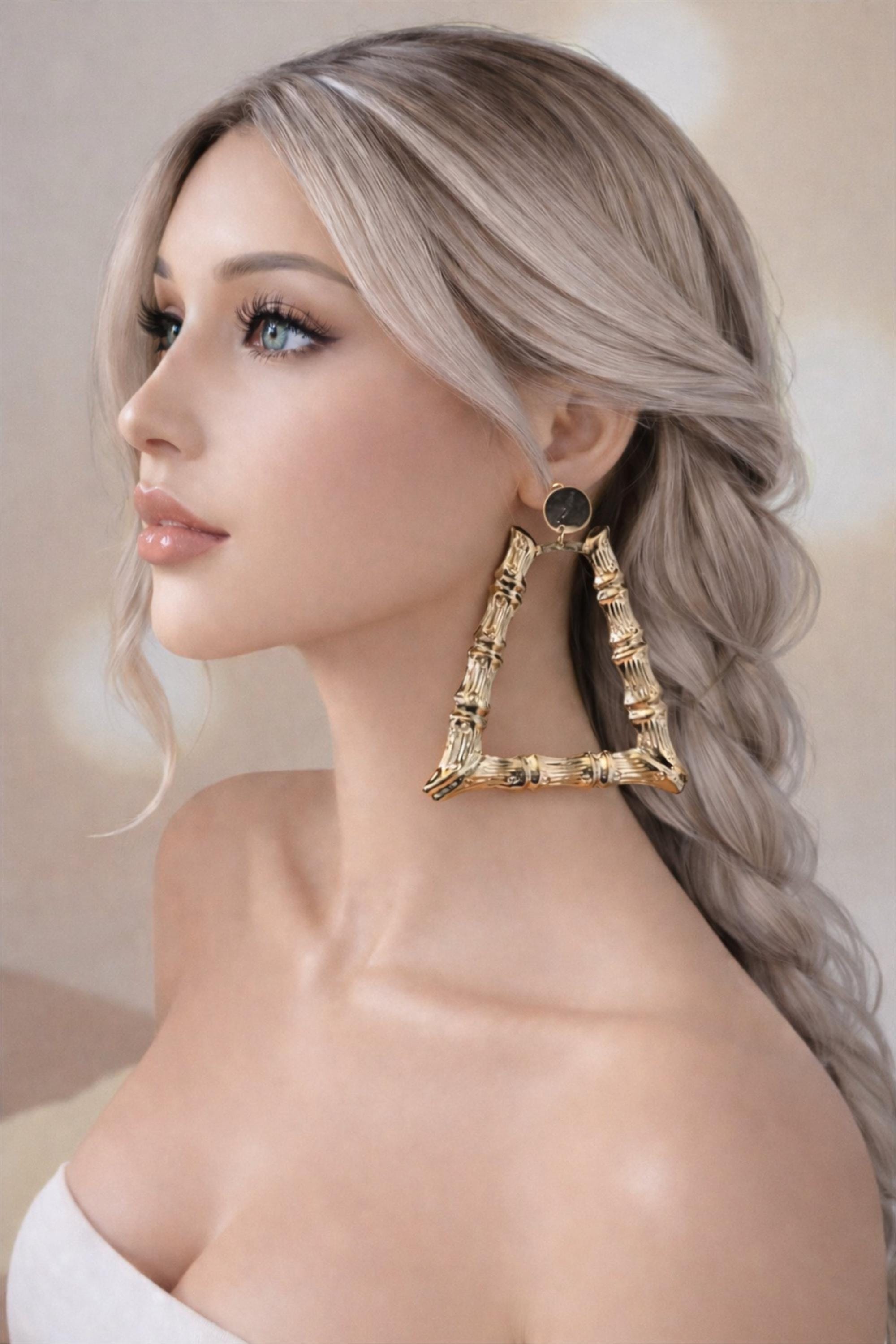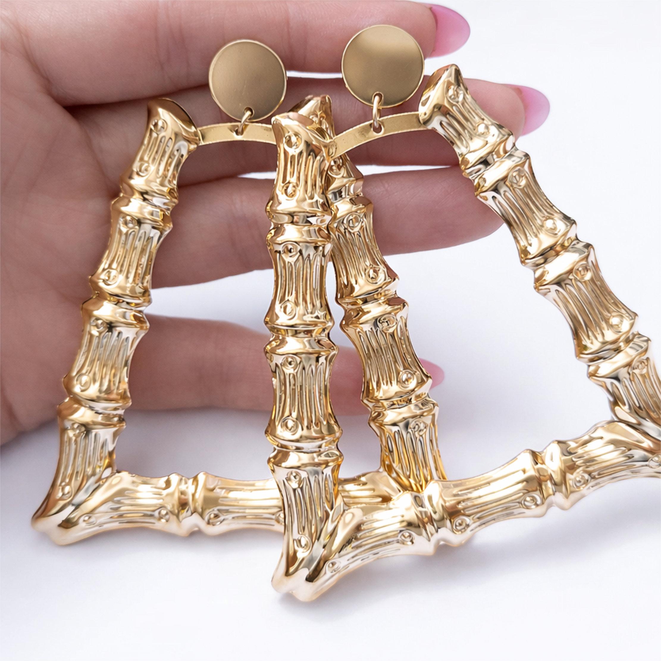 These striking geometric drops feature a sculpted bamboo effect with a gold tone finish and a distinctive triangular shape that frames the face beautifully. The open gaps between each bamboo segment are an intentional part of the design, giving the earrings depth, dimension, and that signature bamboo look — they are not faults or damage.