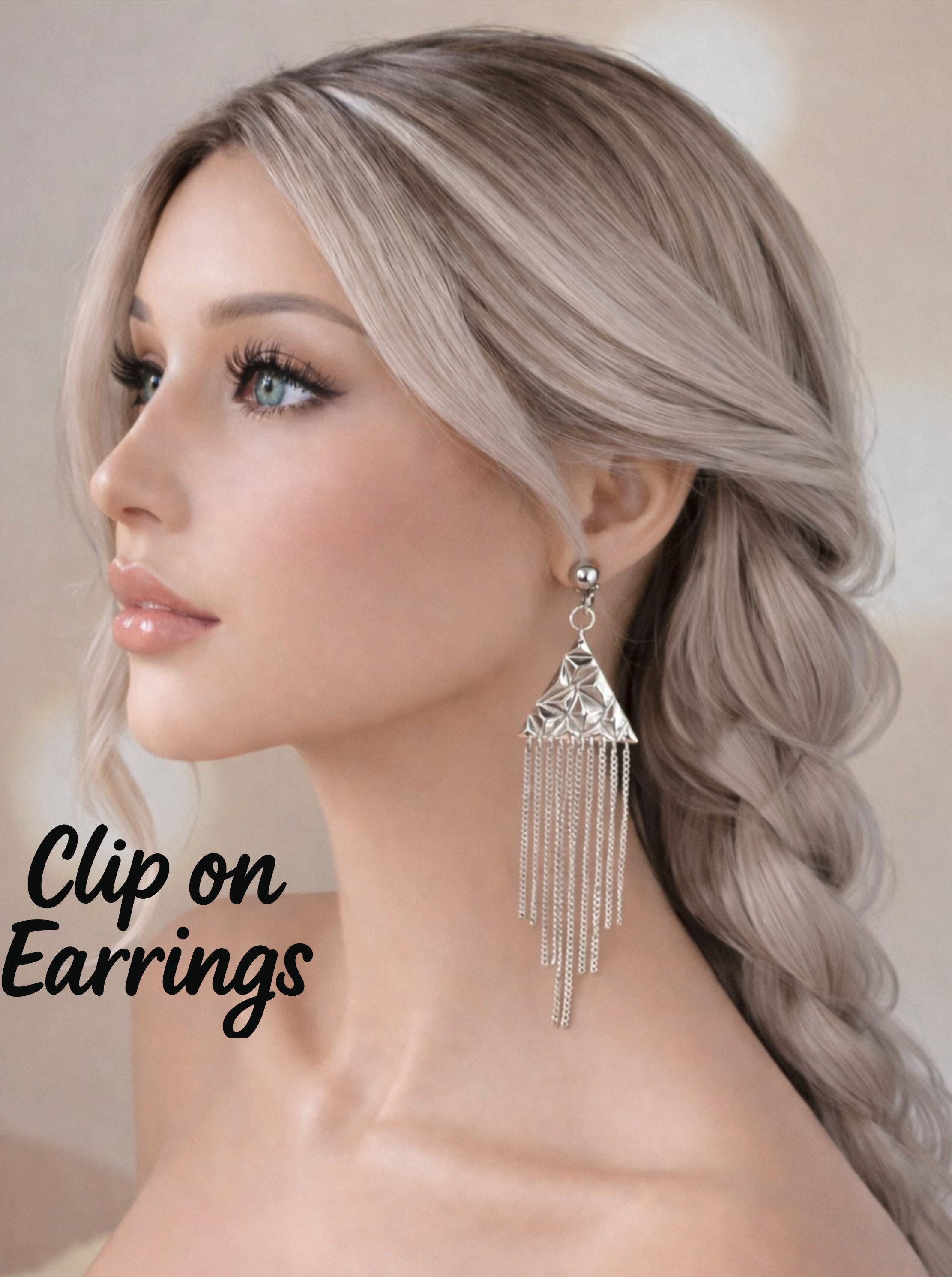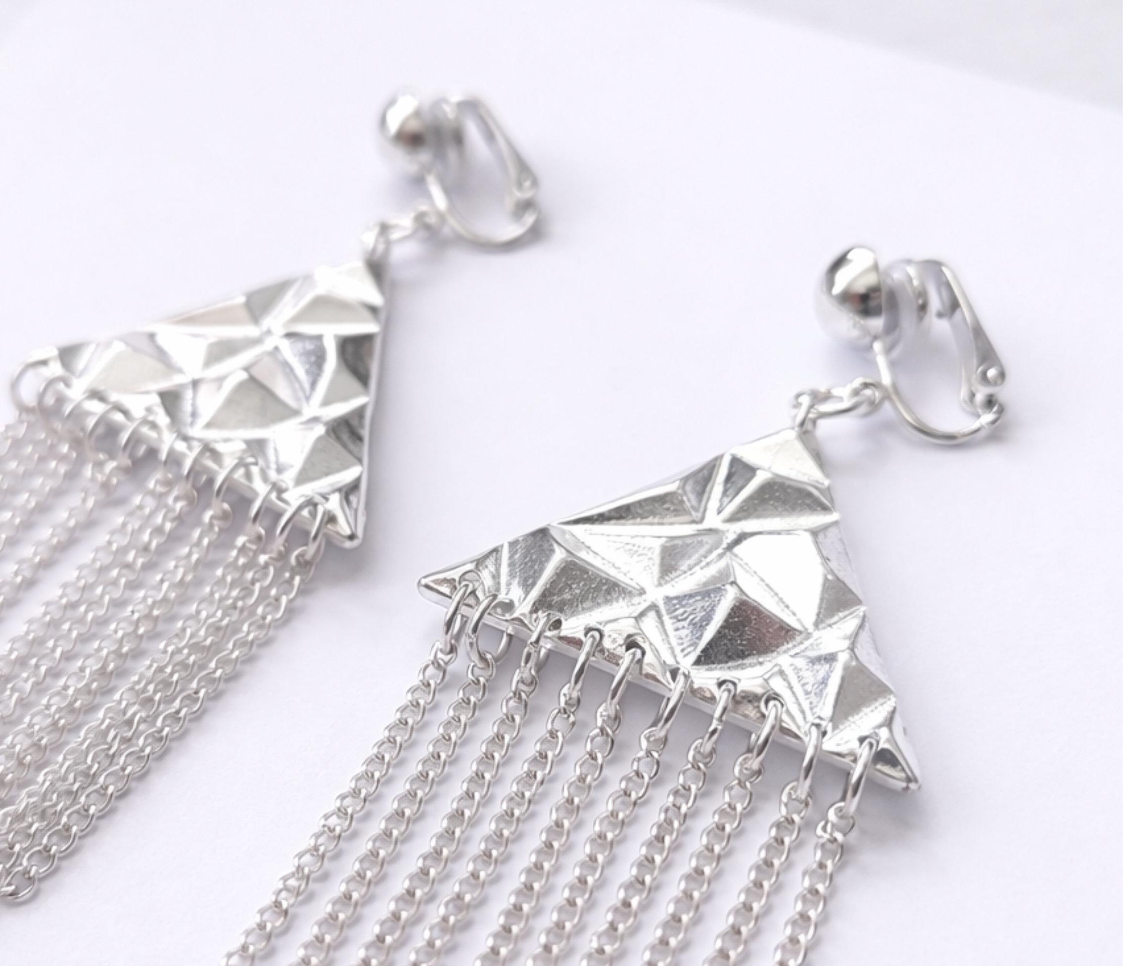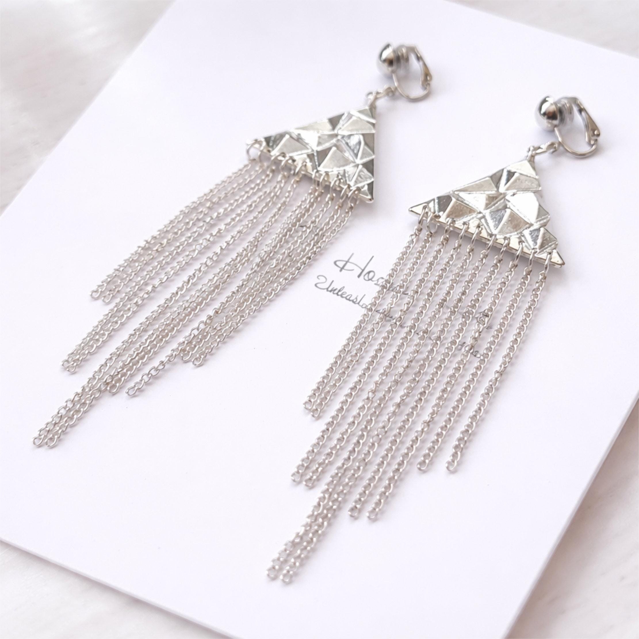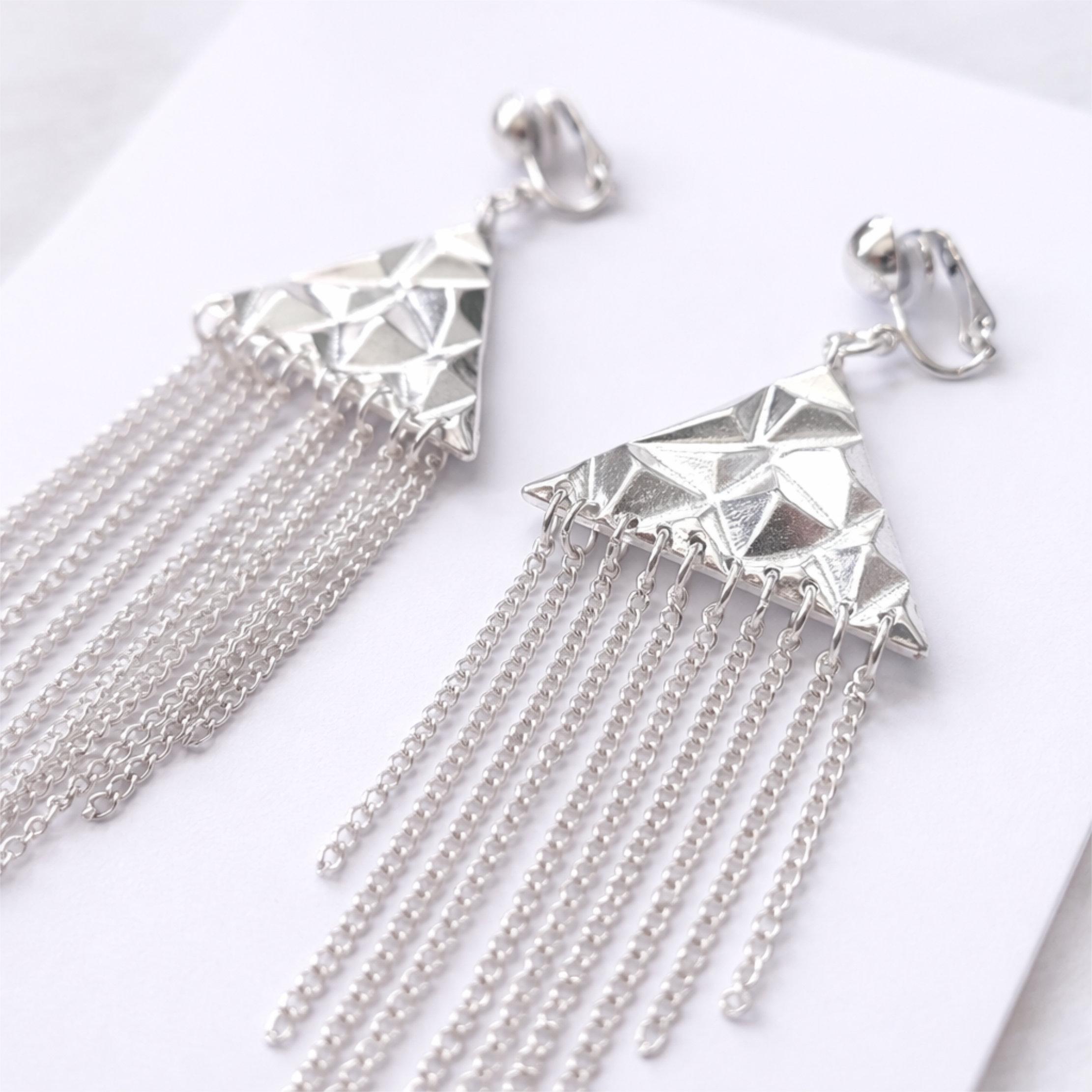Striking silver tone statement earrings featuring a textured geometric triangle top with cascading chain fringe for beautiful movement and shine.