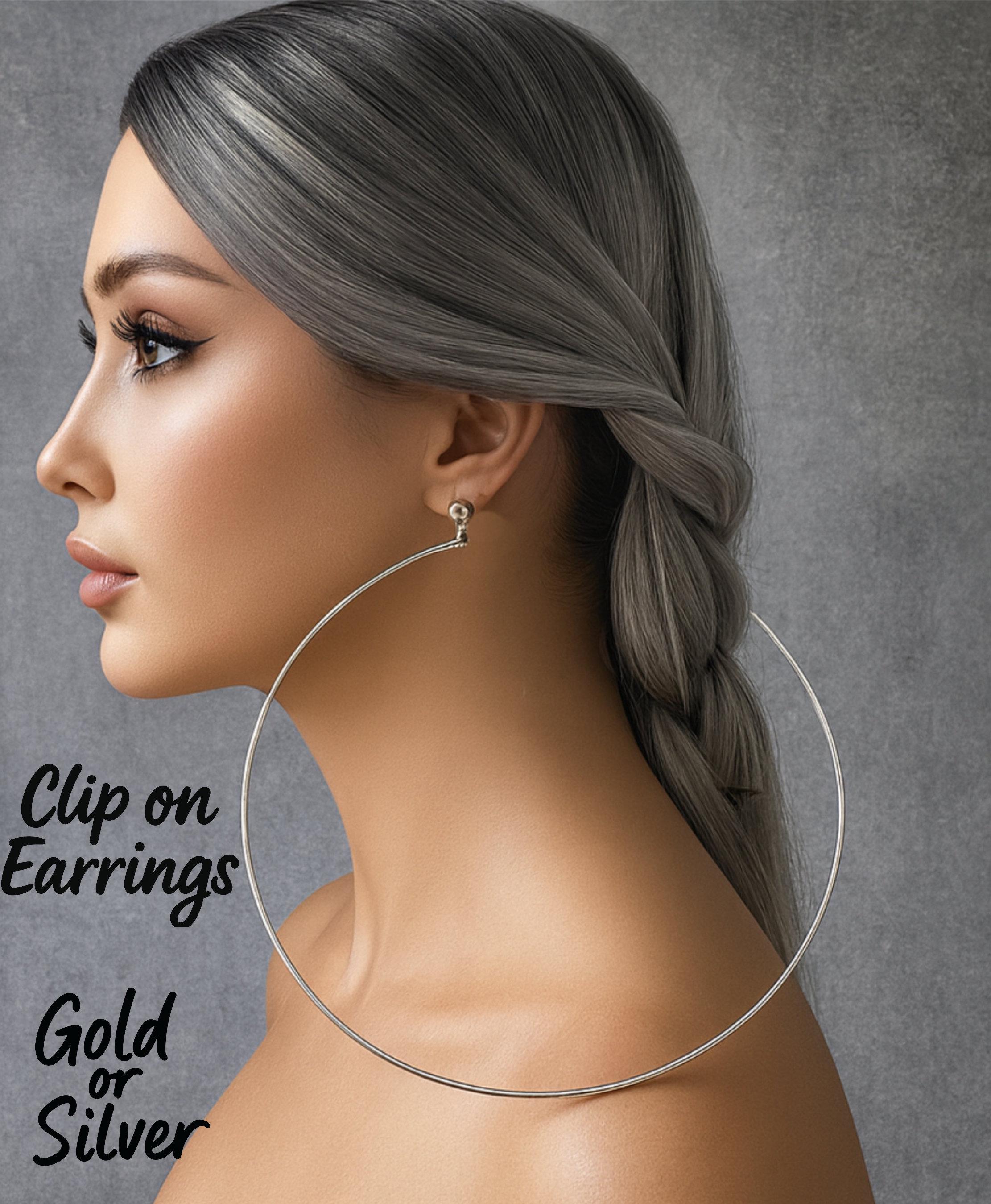 These GIANT 6.5 inch clip-on hoop earrings are perfect for anyone who loves oversized, eye-catching hoops but doesn’t have pierced ears. Made from smooth, wire in your choice of gold tone or silver tone, these C-shape hoops give a dramatic glam look - PLEASE CHECK THE SIZE!