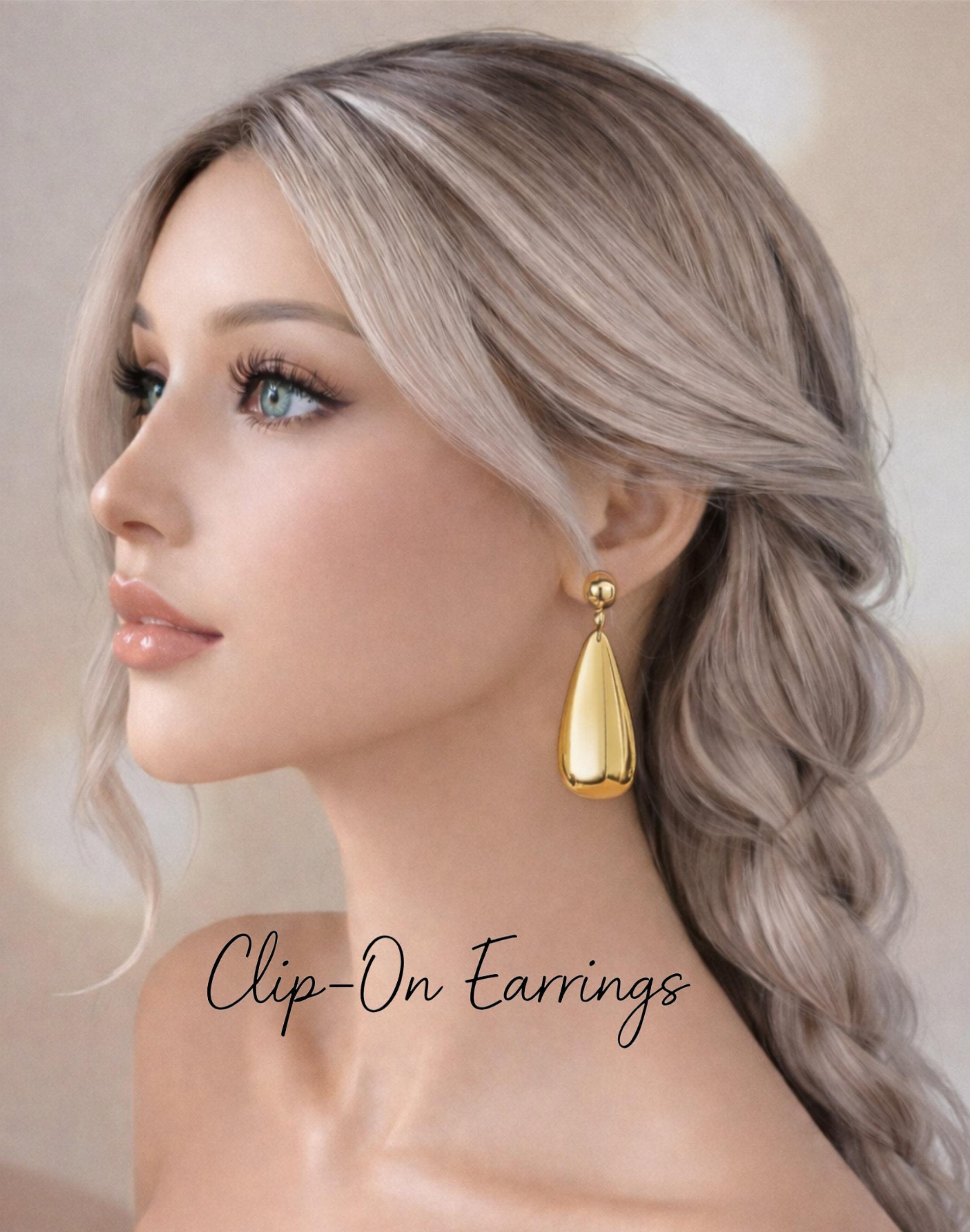 Introducing these stunning Gold Teardrop Clip On Earrings – a bold, elegant statement piece designed especially for non-pierced ears. These lightweight drops bring a gorgeous polished shine, perfect for anyone who loves oversized glamour without the discomfort.