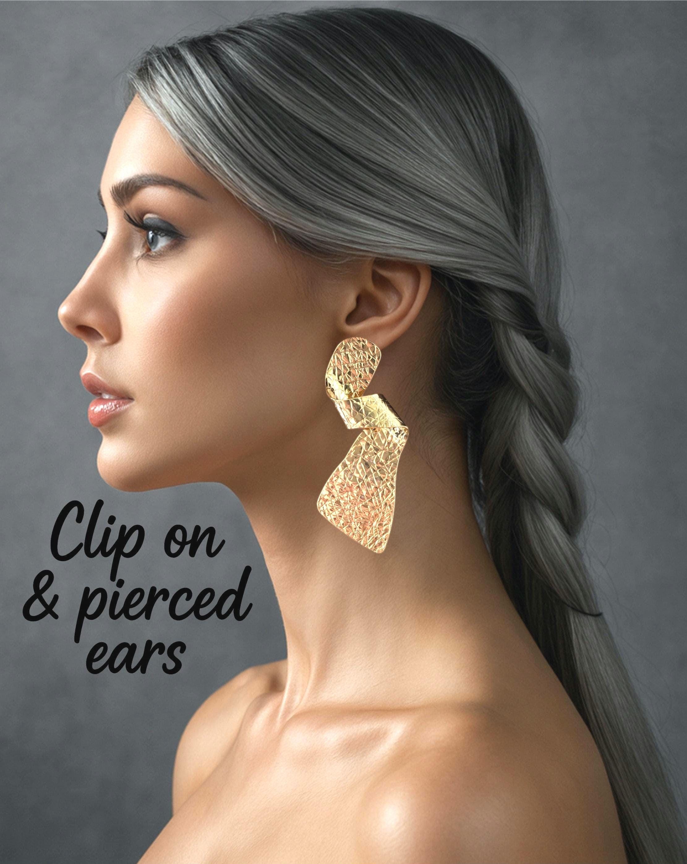 Make a seriously striking style statement with these gorgeous gold-tone abstract drop earrings. Designed with a beautifully textured, crinkled metal effect and a unique sculptural silhouette, they’re the perfect pair for anyone who loves bold, modern jewellery.