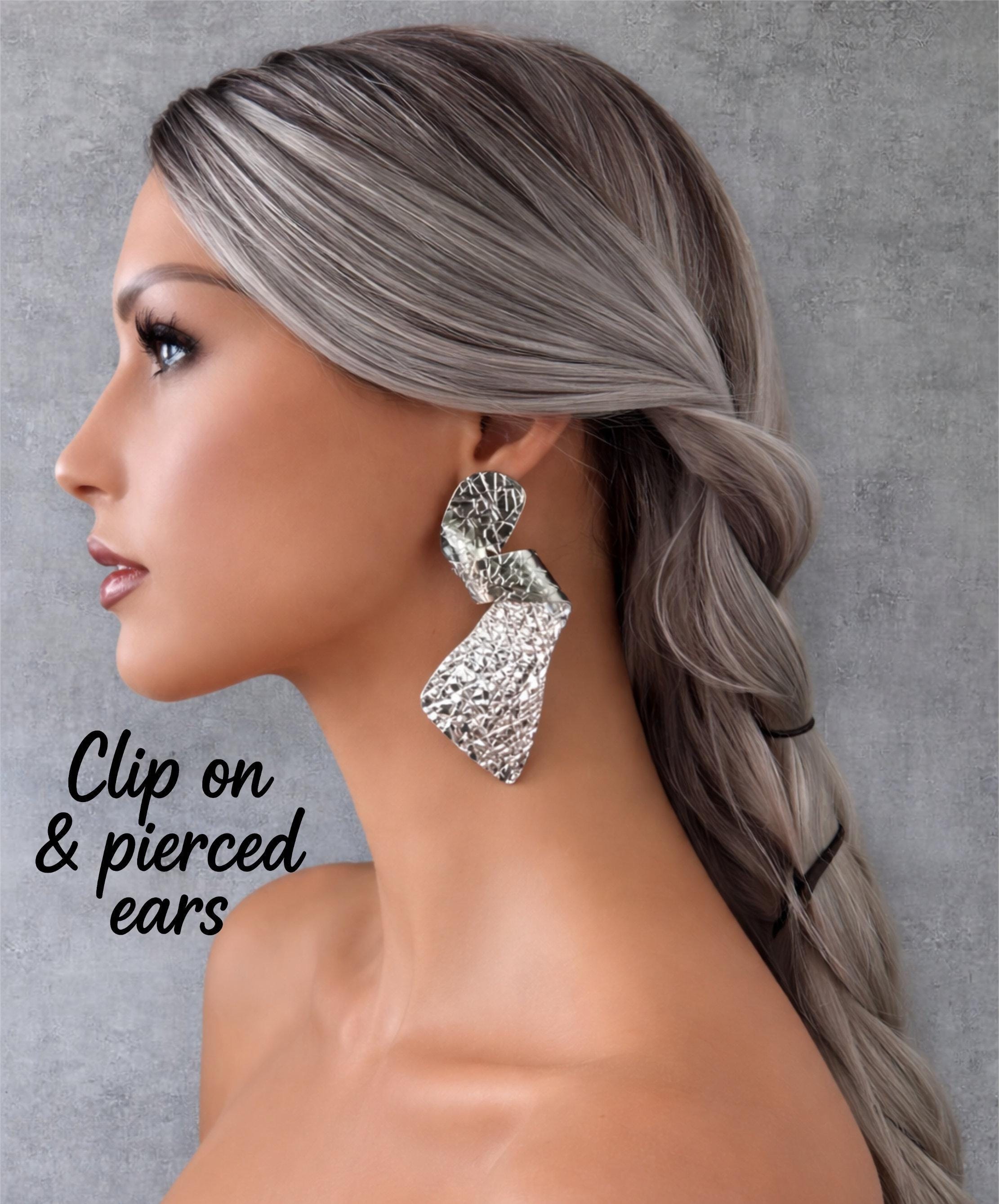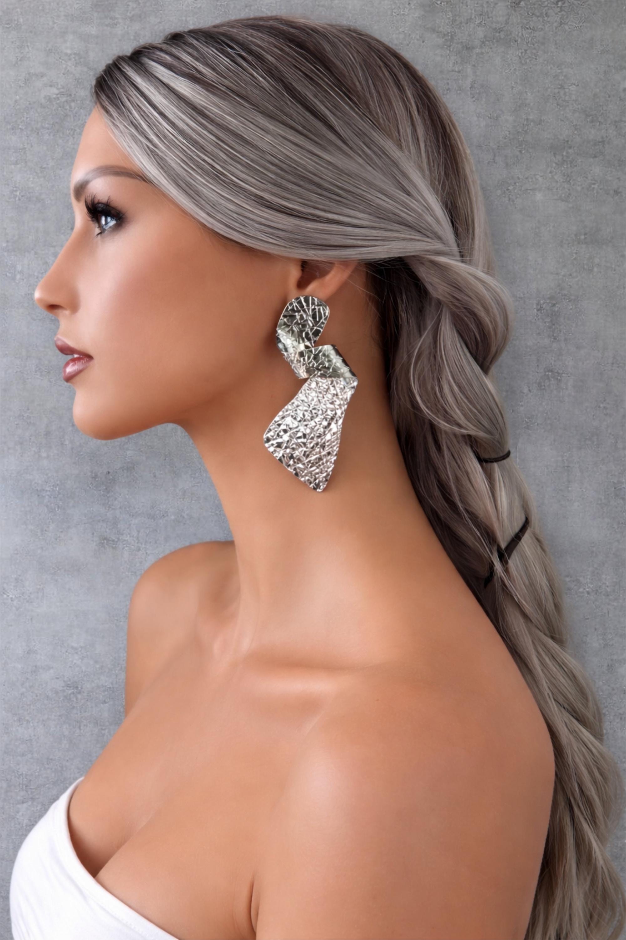 Make a bold statement with these stunning silver-tone abstract drop earrings, designed to turn heads with their sculptural shape and beautifully textured finish.