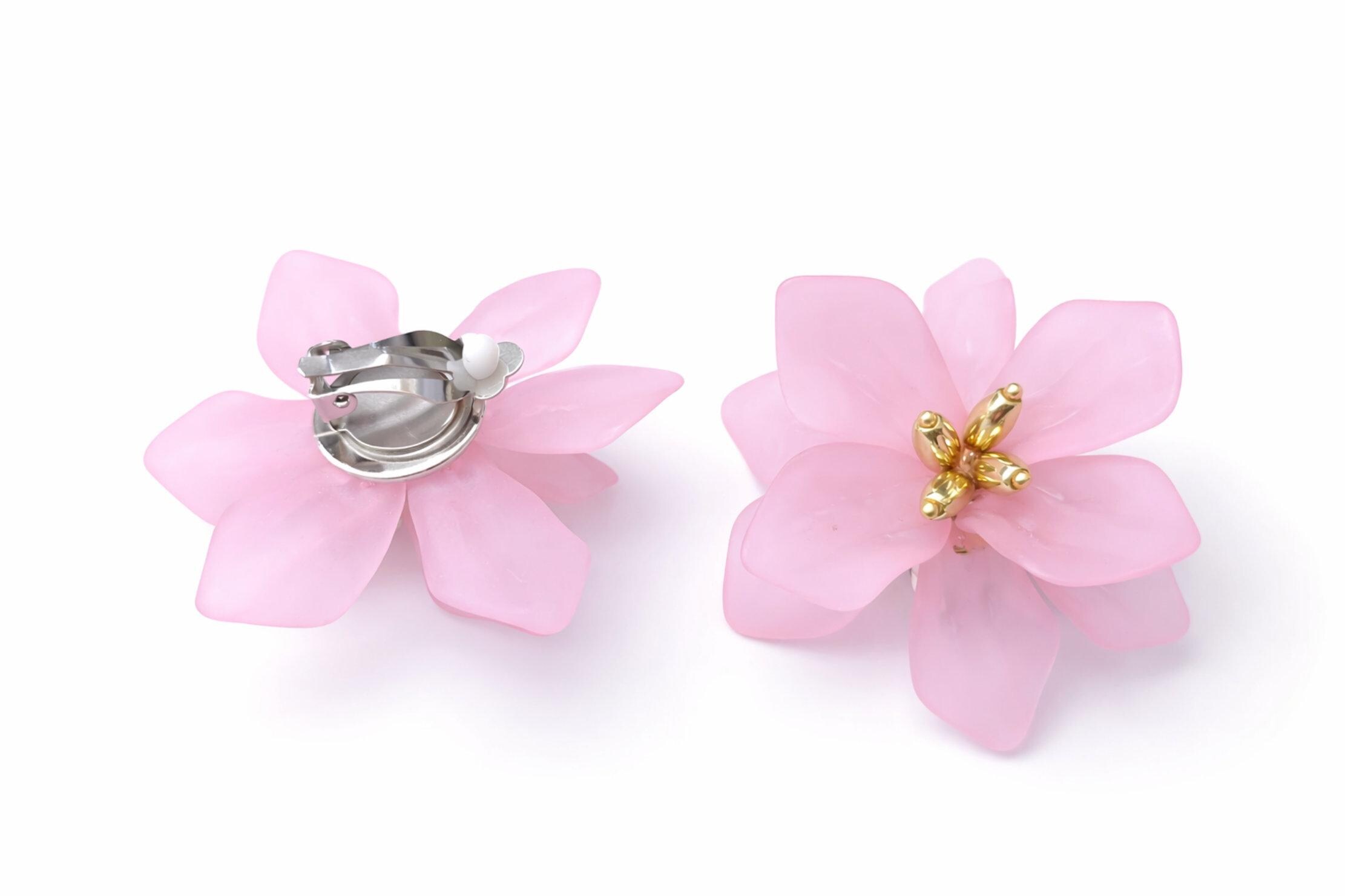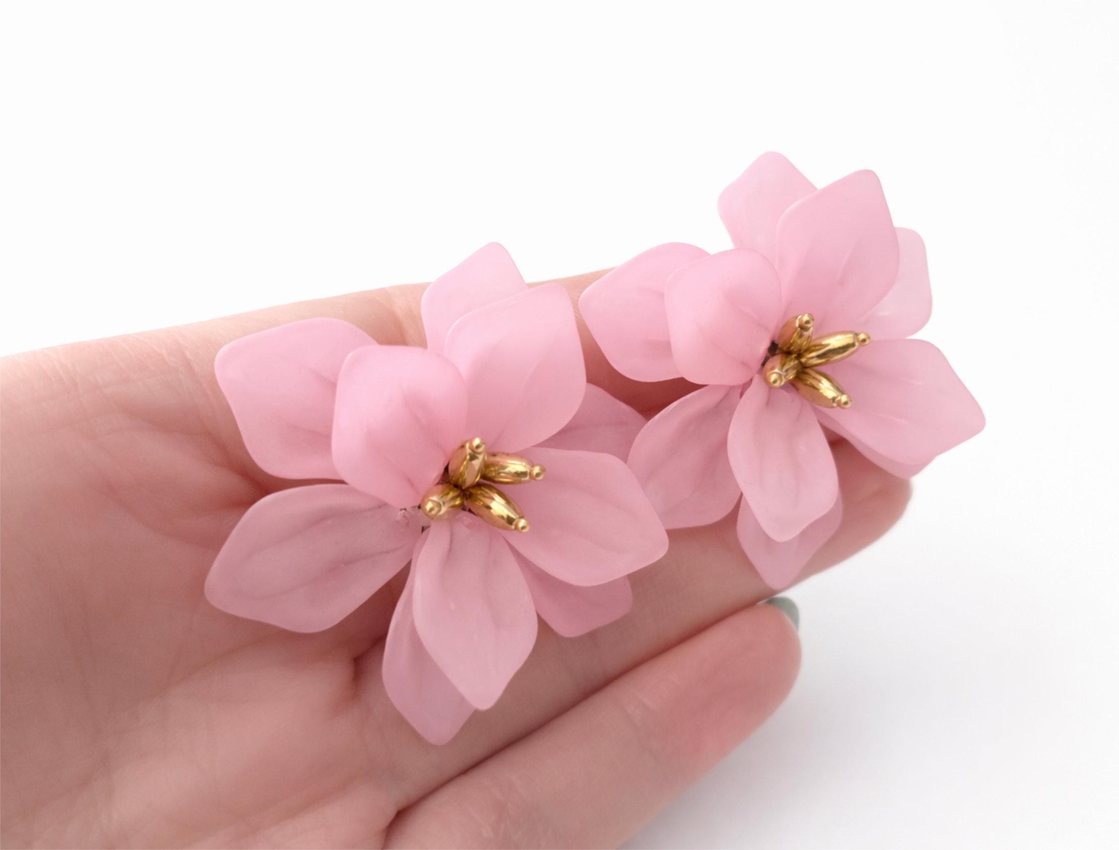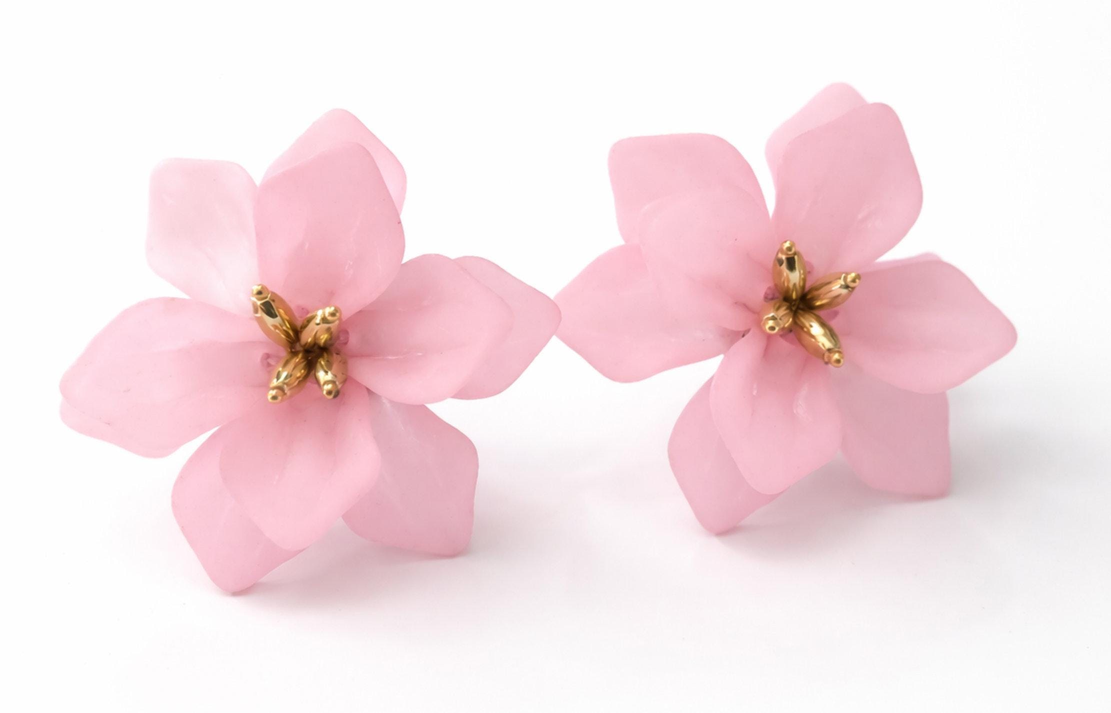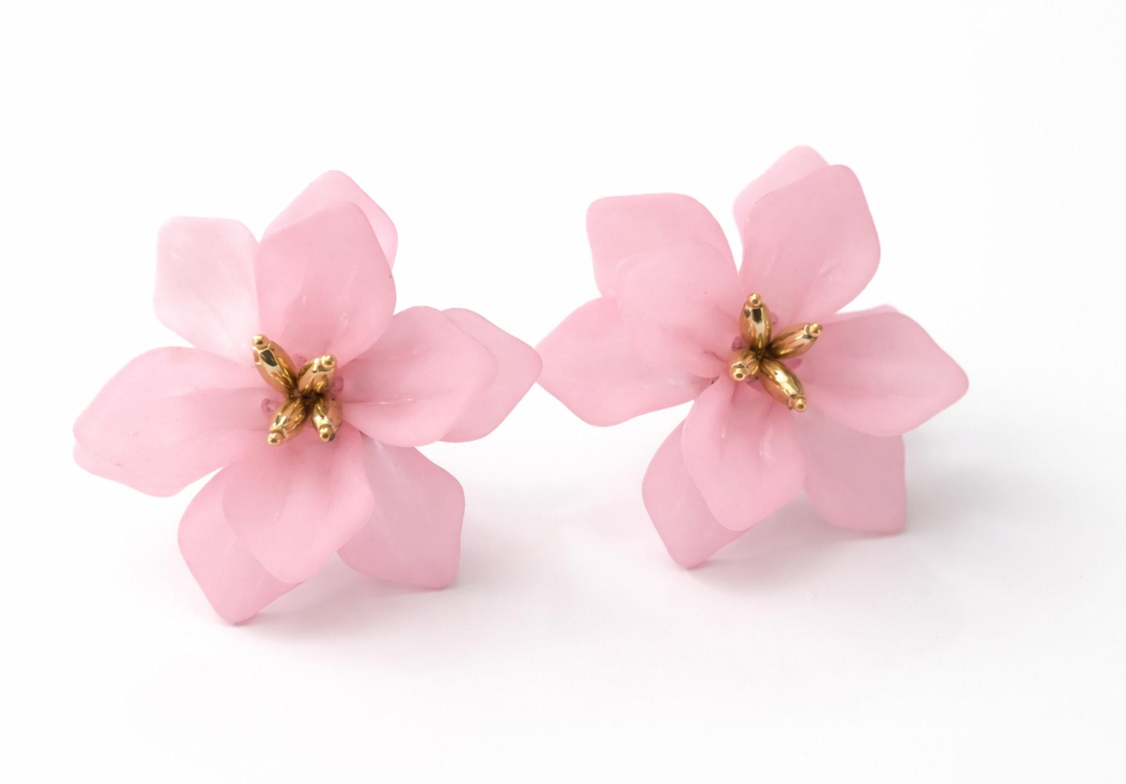 These delicate pink flower earrings feature layered, translucent blush petals with a subtle frosted finish, finished with a warm gold-tone centre for a soft, elegant contrast.
