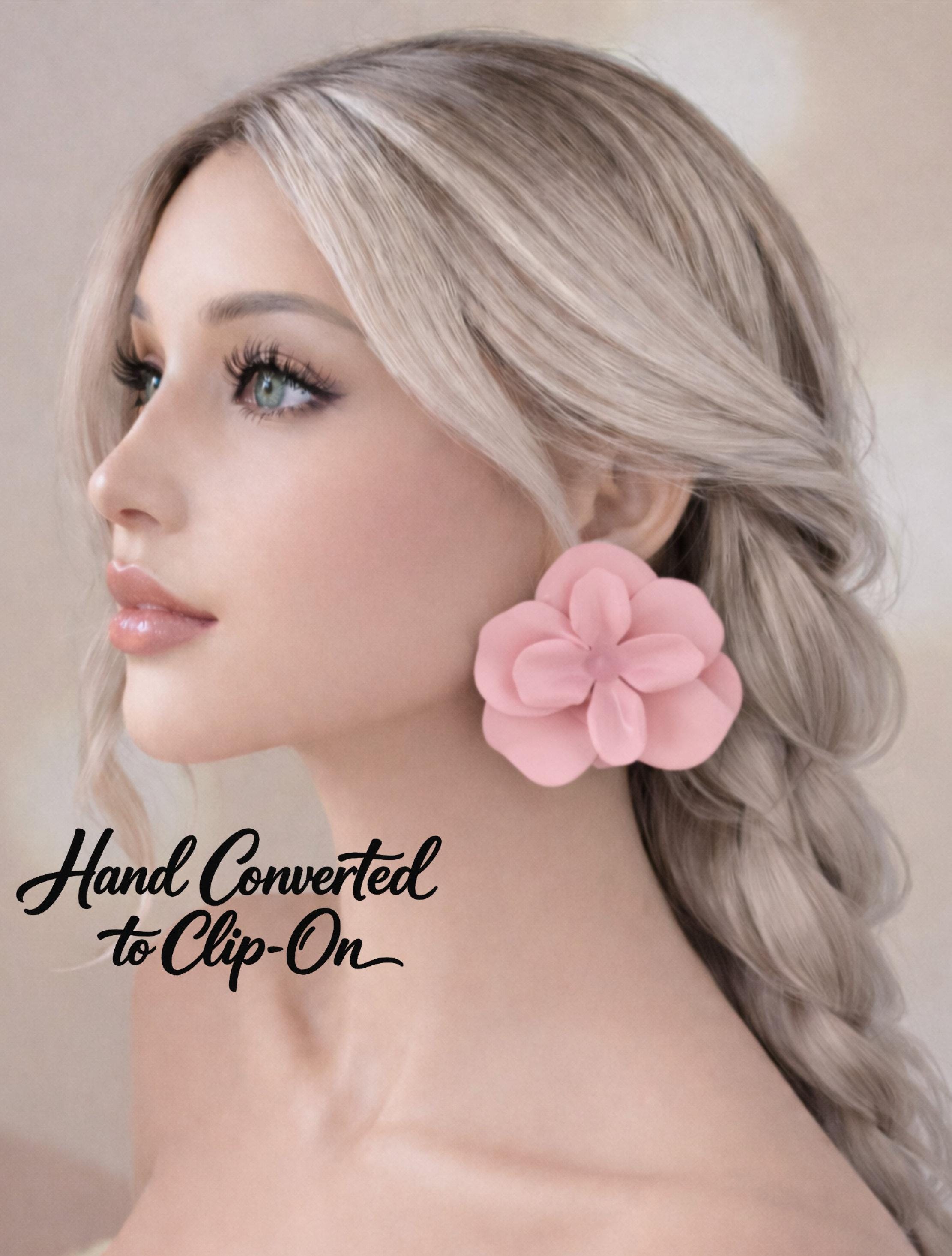 Make a bold, feminine statement with these oversized pink flower clip on earrings.