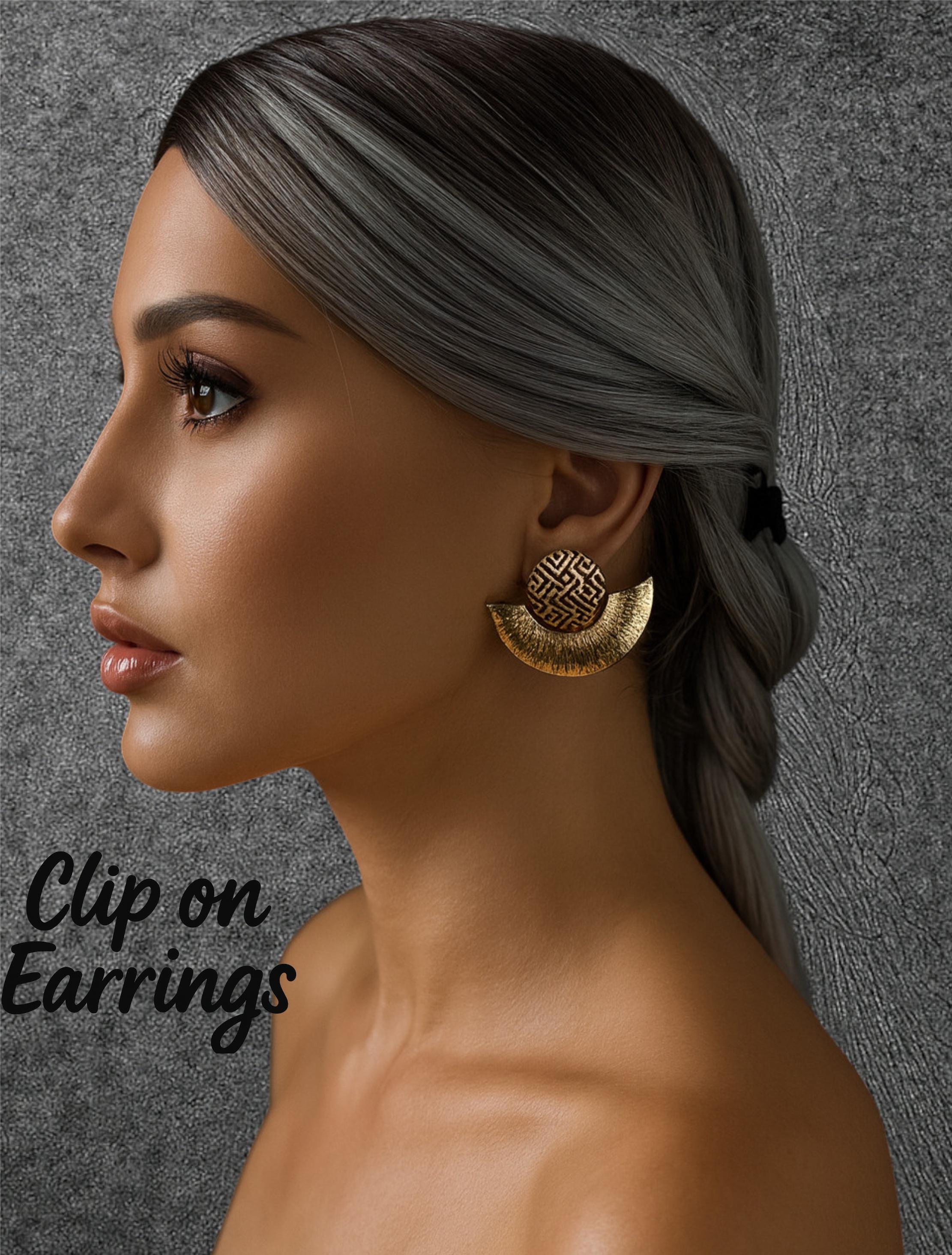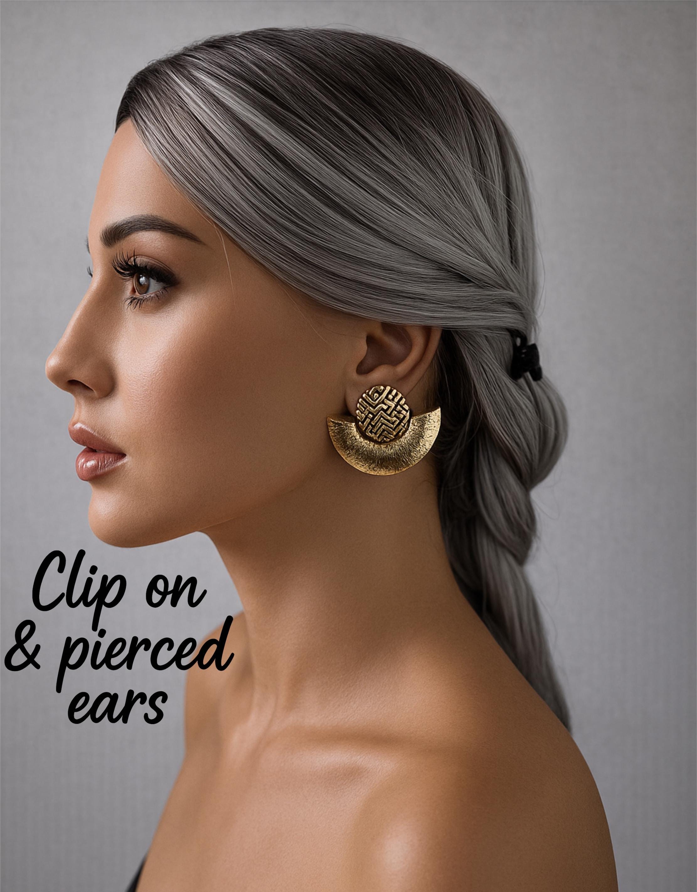 Stand out effortlessly with these geometric vintage style half-moon clip-on earrings. Crafted in an antique gold tone with textured detailing, they combine a timeless round stud with a bold half-circle design. No piercing required – just clip on for a confident, stylish look that works for both day and night.