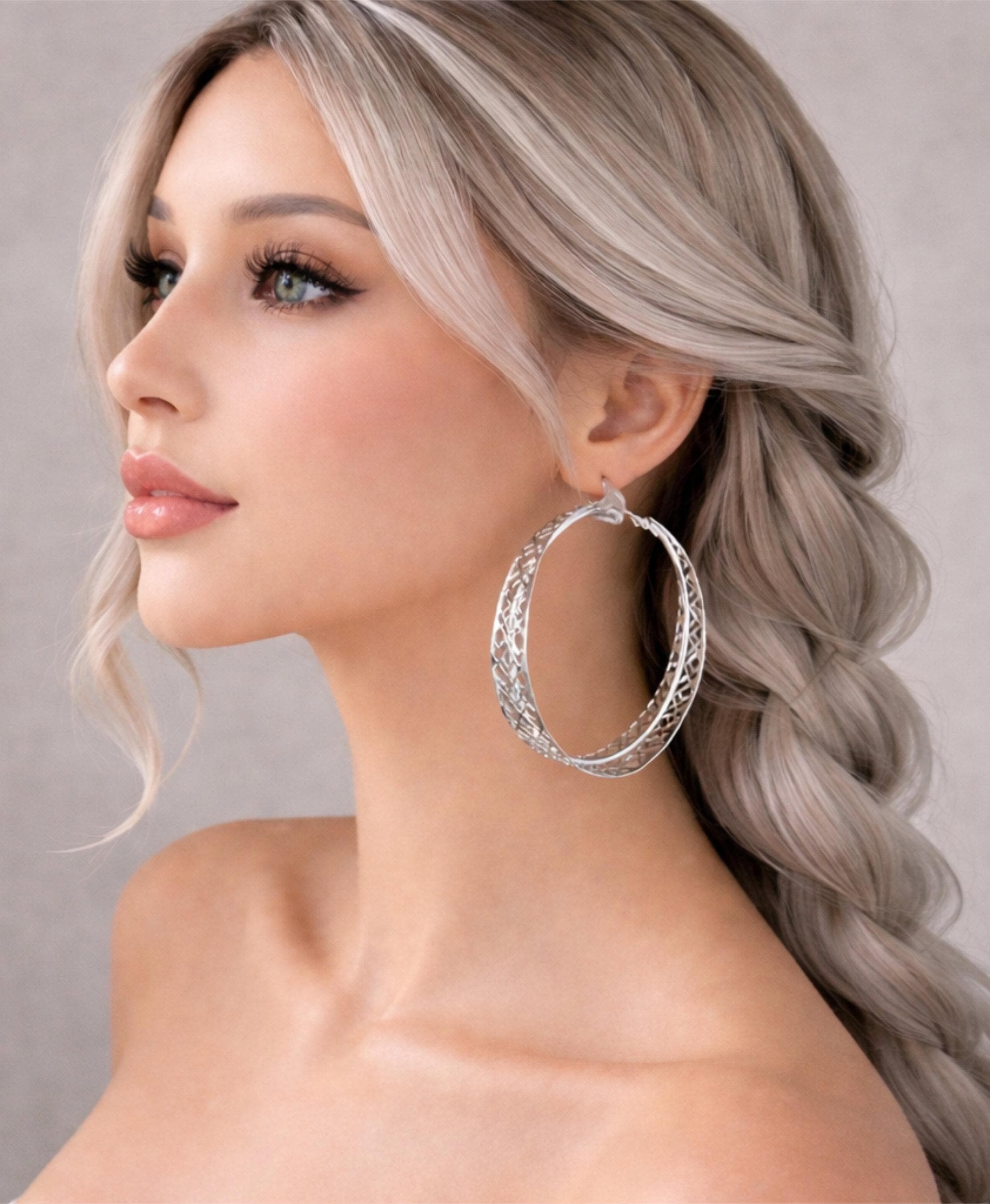 Make a statement with these large silver-tone hoop earrings, Features an intricate filigree pattern and wide design for bold, eye-catching style. Perfect for parties, events, or everyday glam.