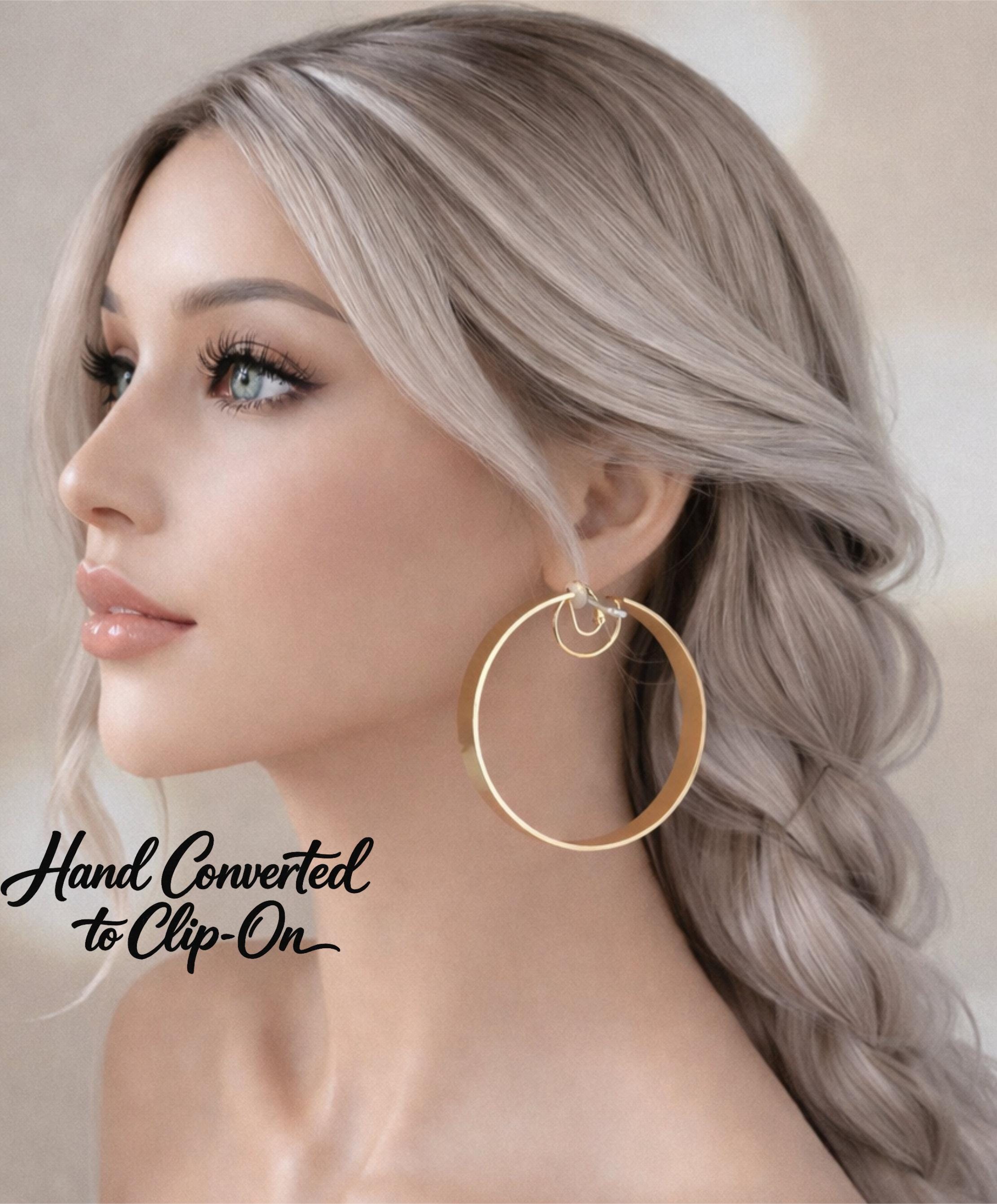 These clip-on hoop earrings are crafted from stainless steel and finished with a luxurious 18k gold plating for a timeless shine, Wide flat tubes for a truly head turning pair of hoops!