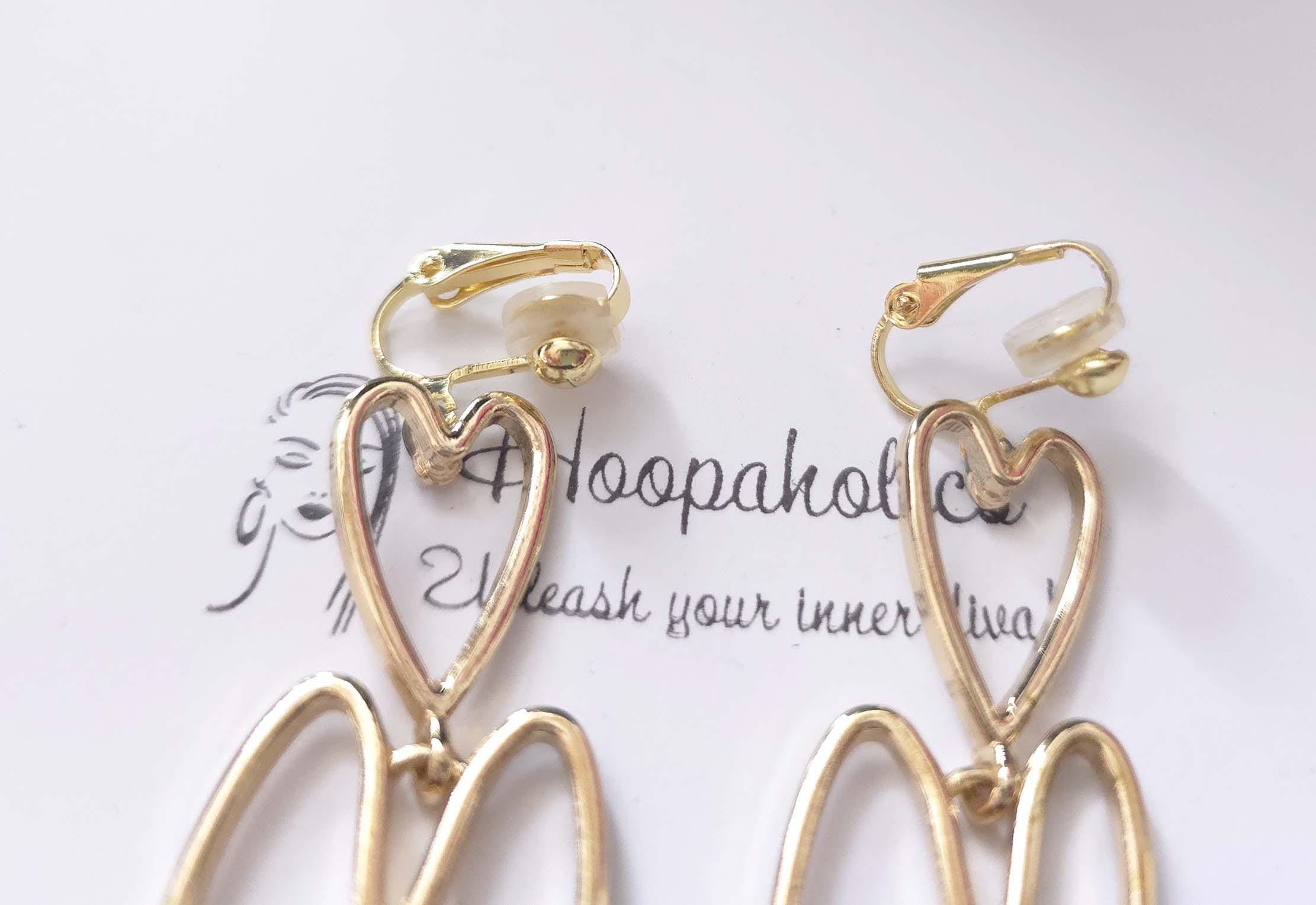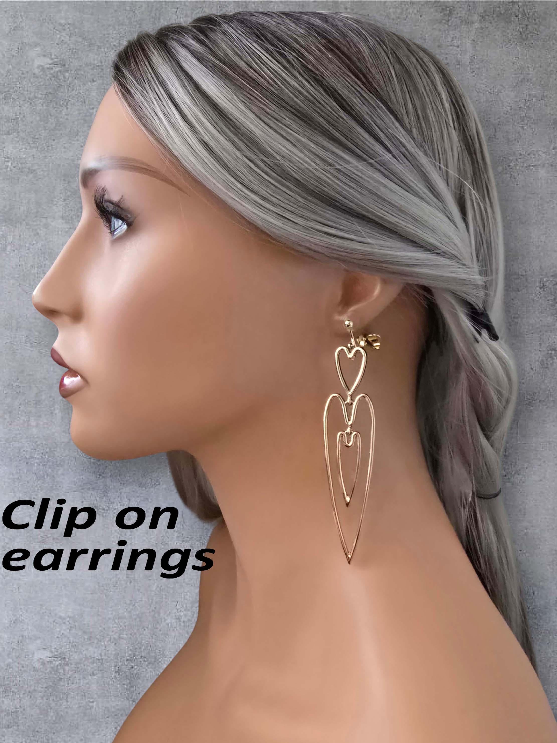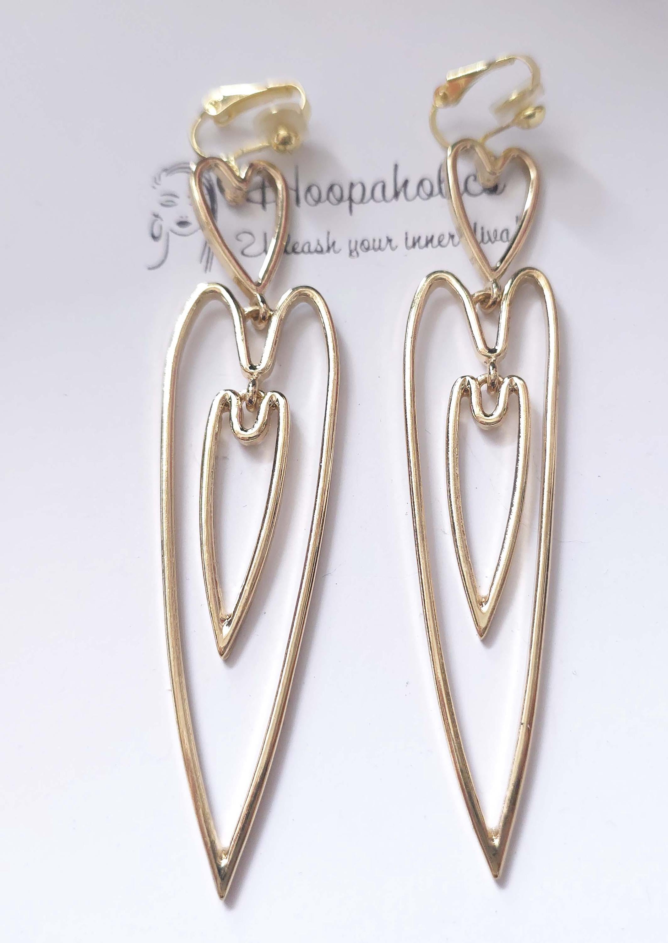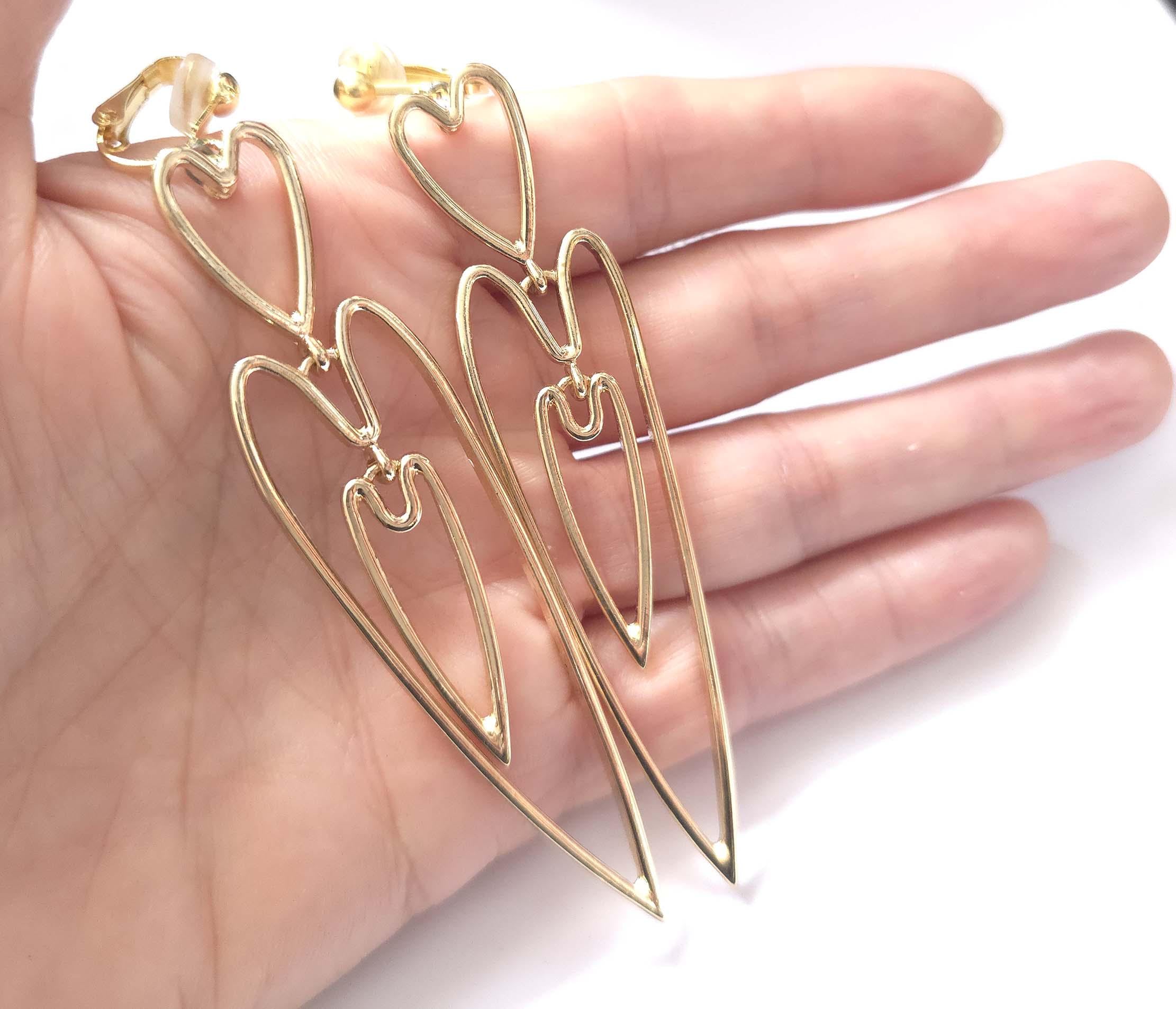 Elevate your style with these clip-on long drop earrings, Featuring a chic double elongated heart design in a lovely light gold-tone finish, these earrings measure 4 inches long, making them a bold and elegant statement accessory.