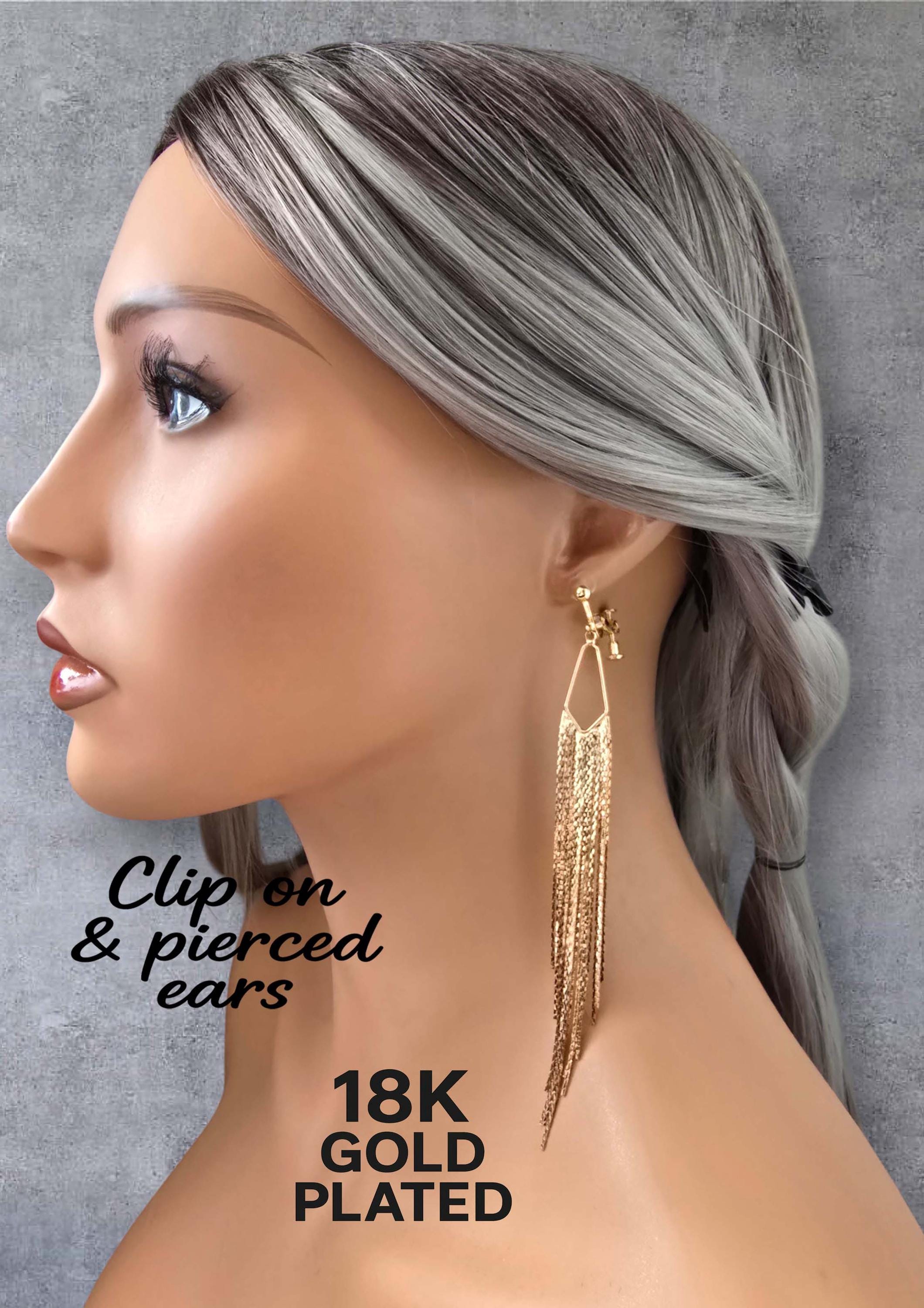 Add a touch of glamour to any outfit with these stunning waterfall chain tassel drop earrings. Measuring 5 inches in length, they feature delicate 18K gold-plated chains that cascade beautifully, creating movement and sparkle with every turn.
