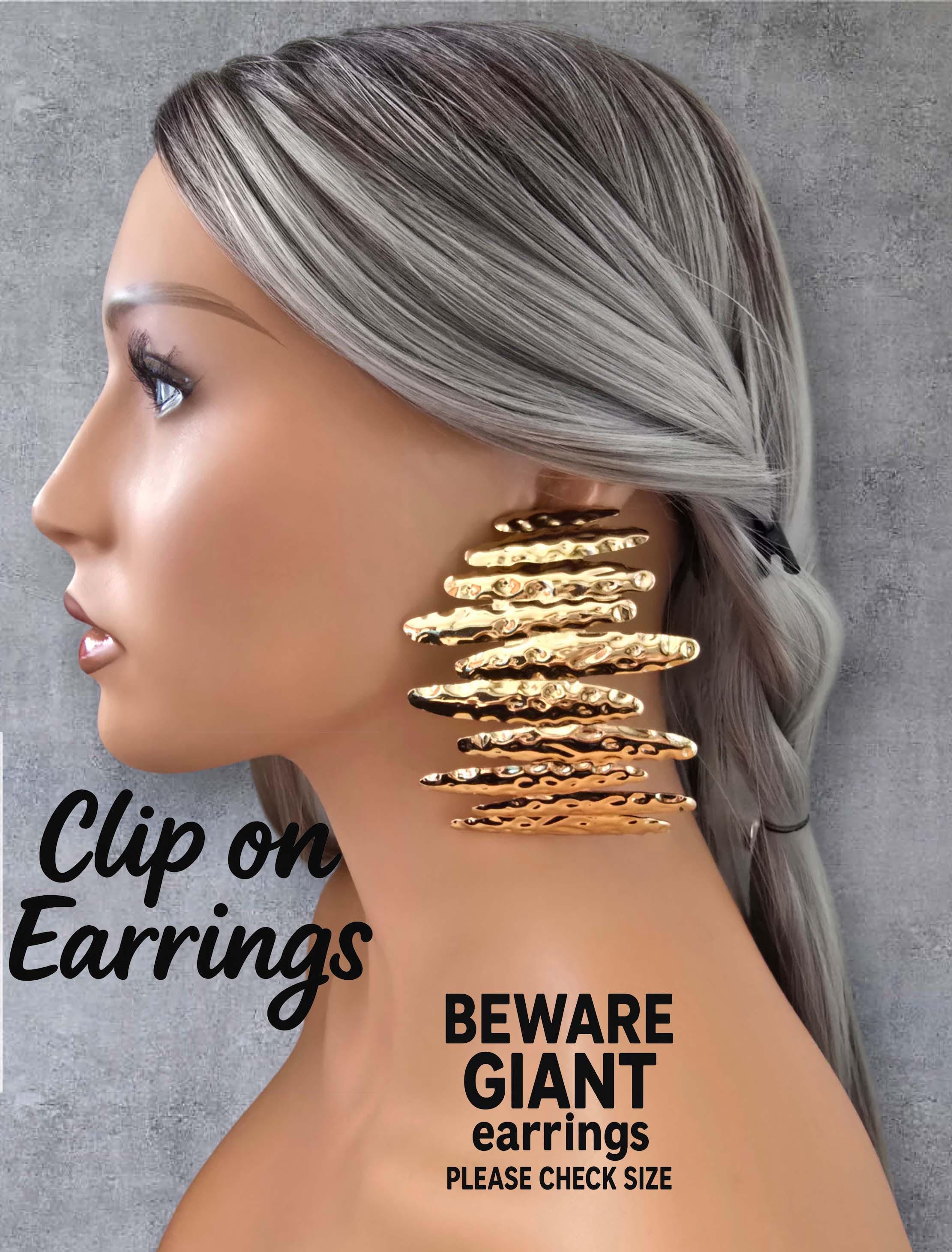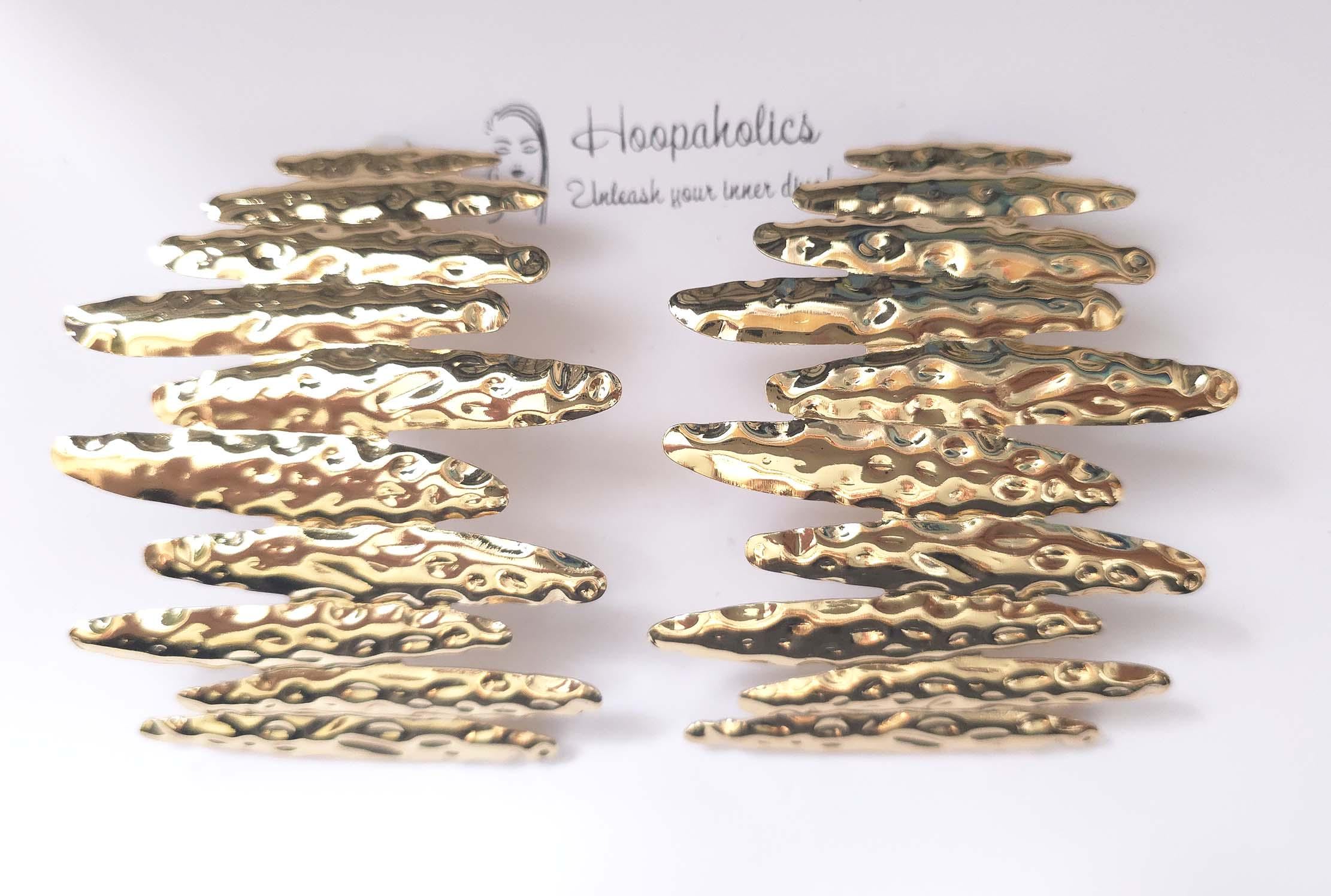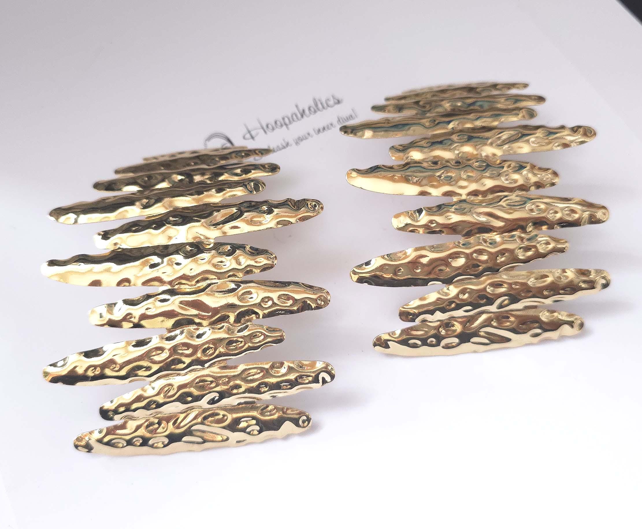 Make a striking statement with these giant curved hammered gold tone earrings, featuring a bold stacked bar design that shimmers beautifully in the light. Their abstract, organic texture gives a luxurious handcrafted look — perfect for adding eye-catching drama,