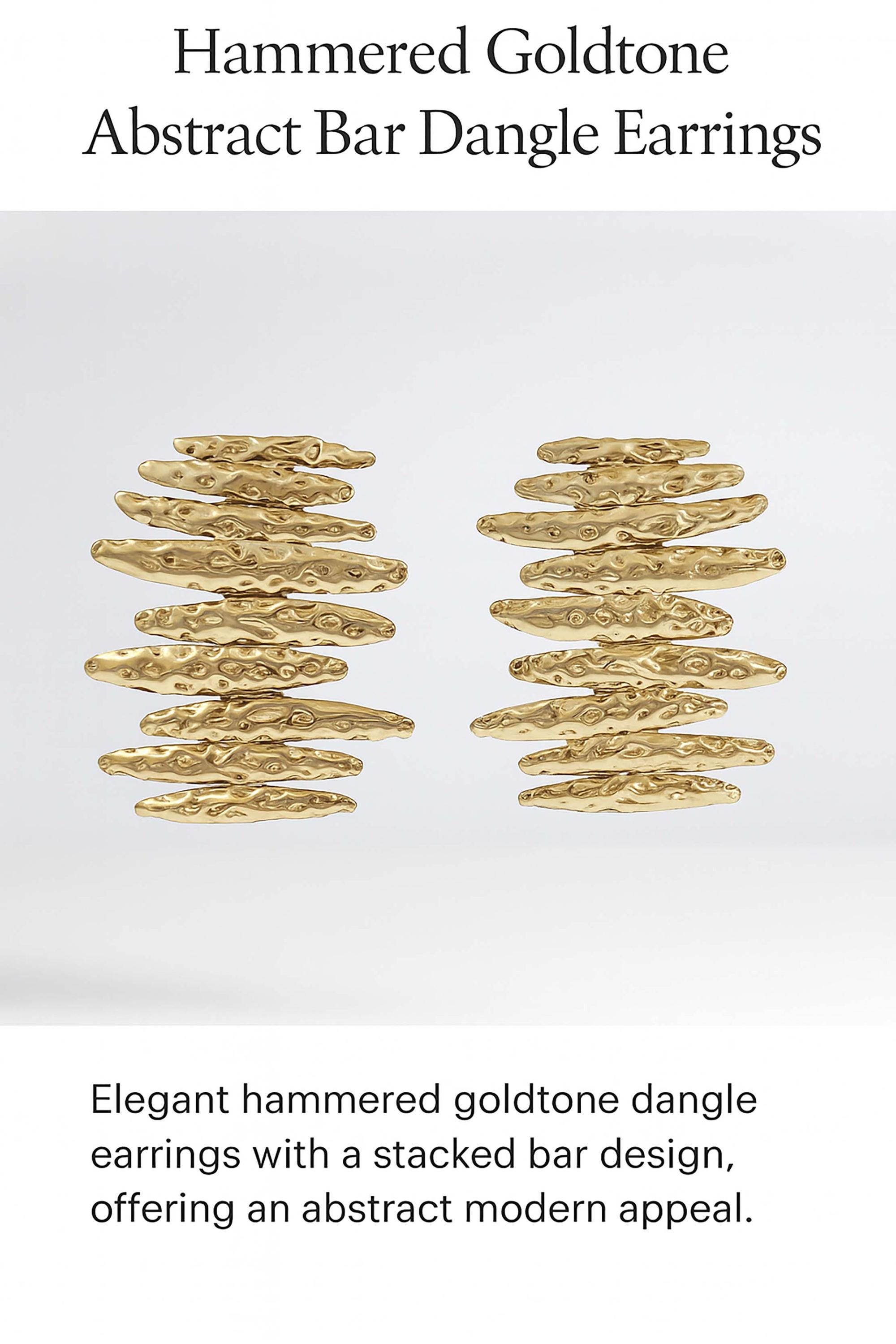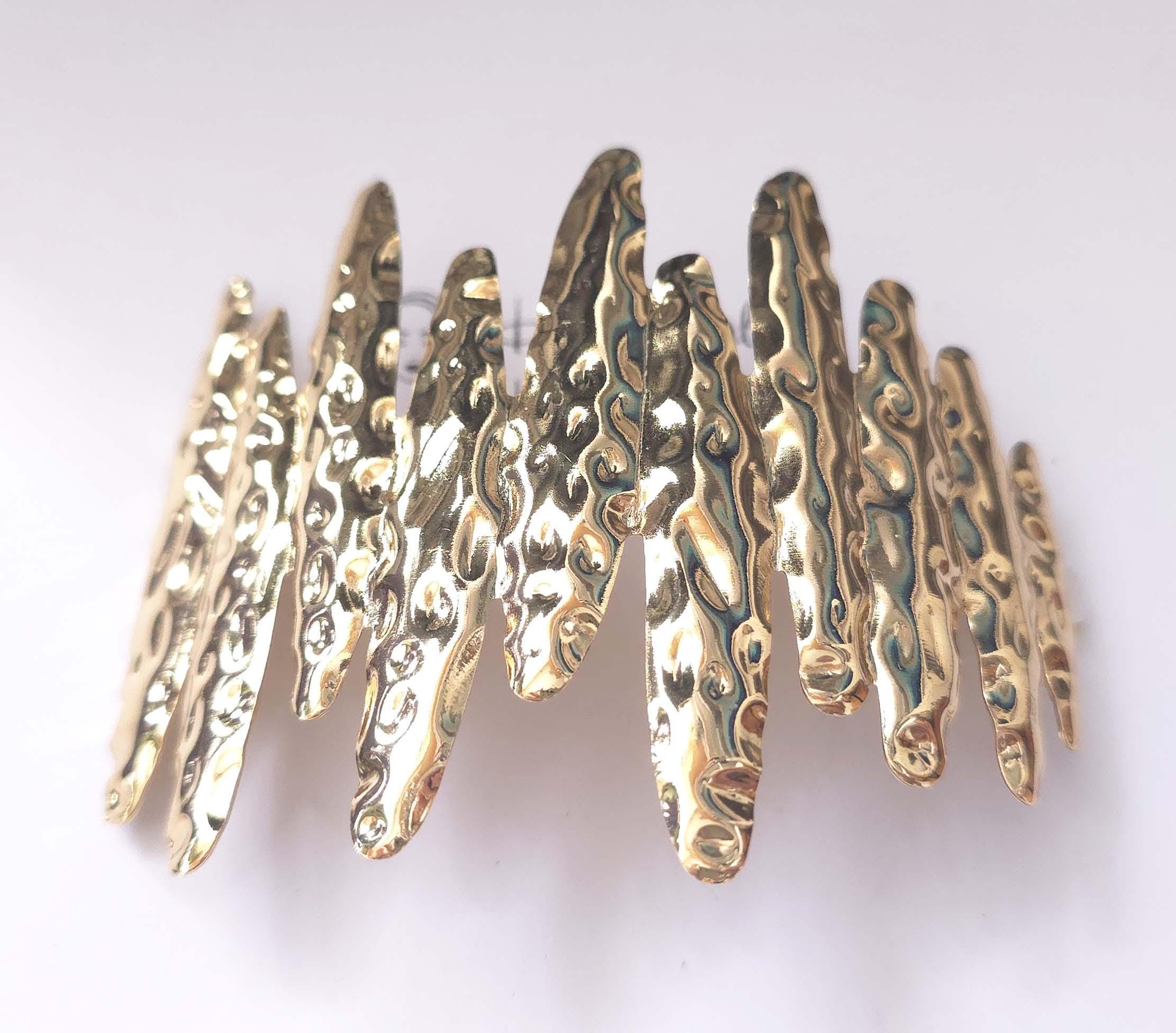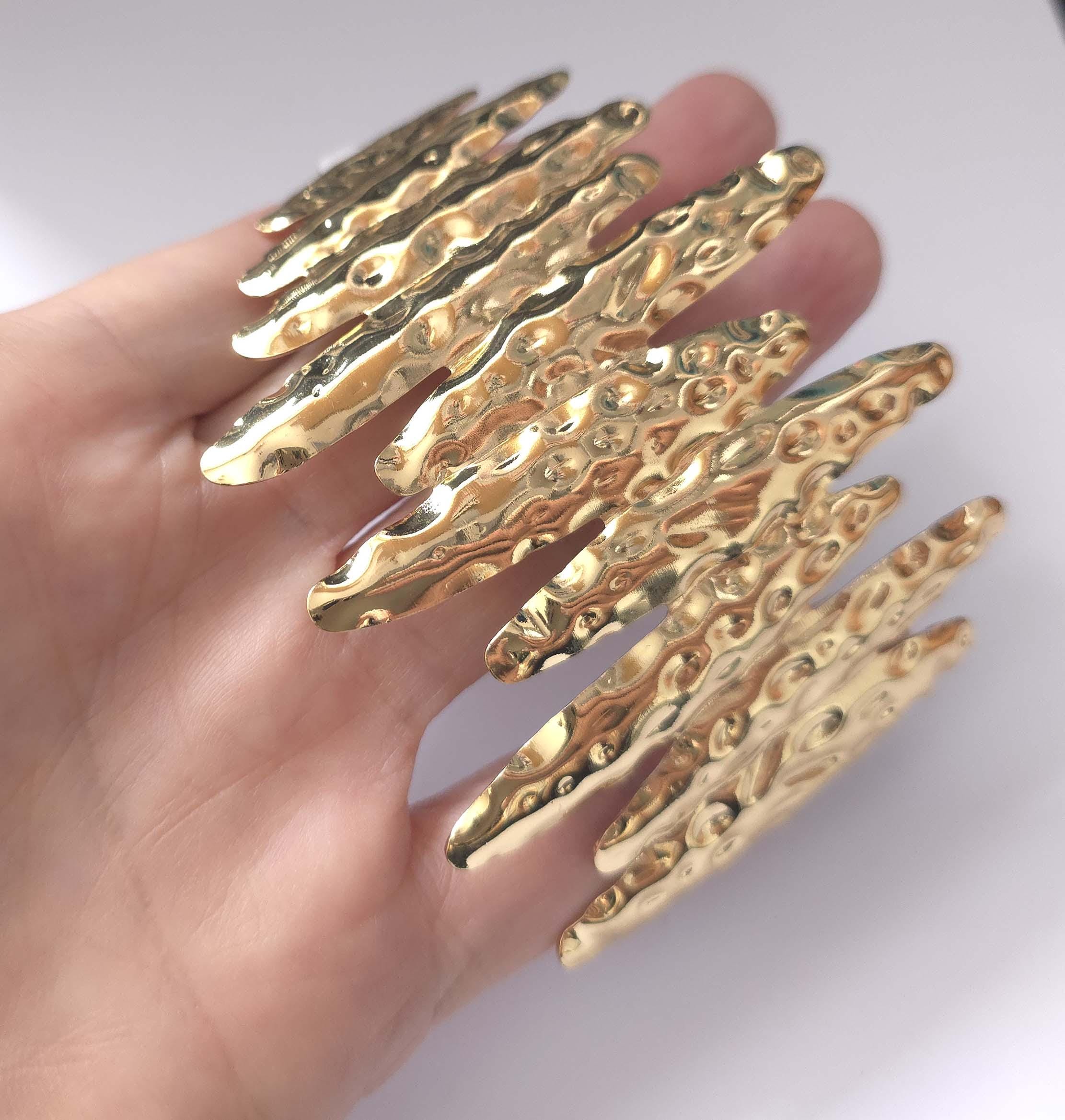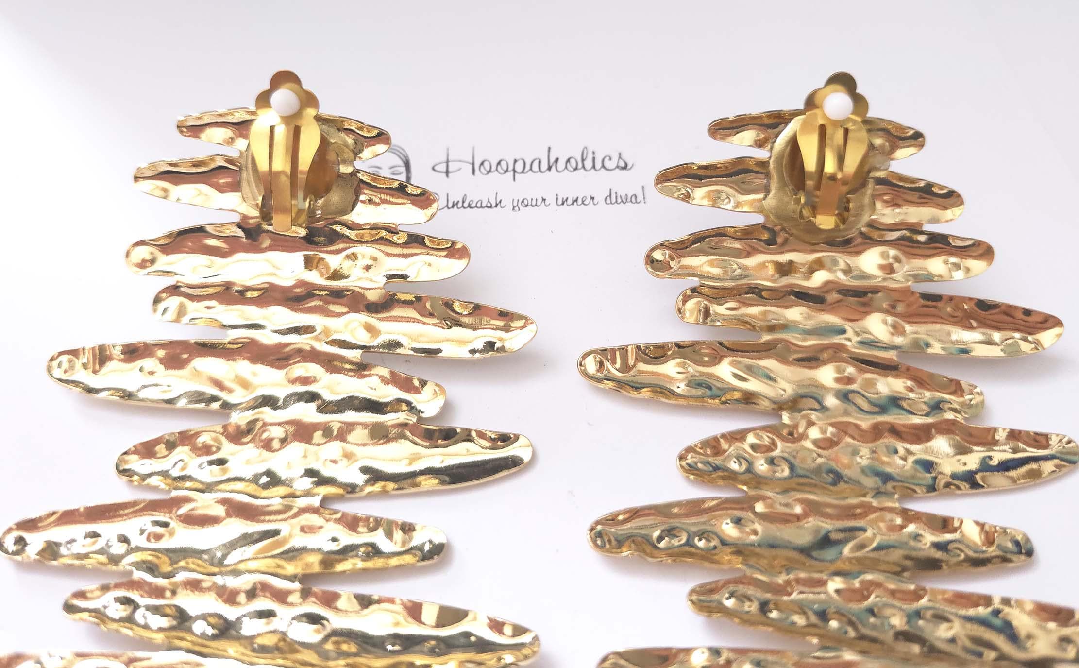 Make a striking statement with these giant curved hammered gold tone earrings, featuring a bold stacked bar design that shimmers beautifully in the light. Their abstract, organic texture gives a luxurious handcrafted look — perfect for adding eye-catching drama,