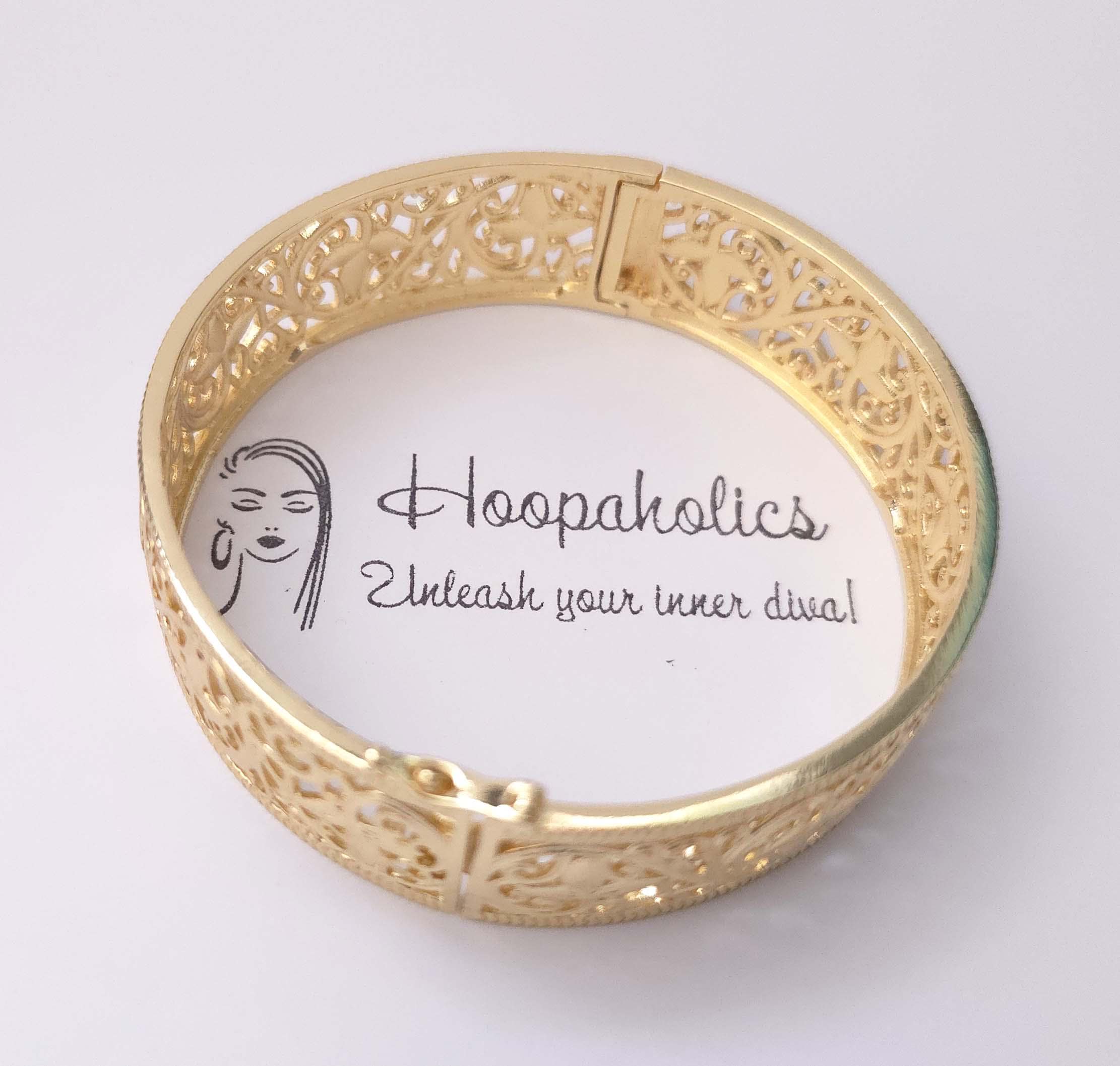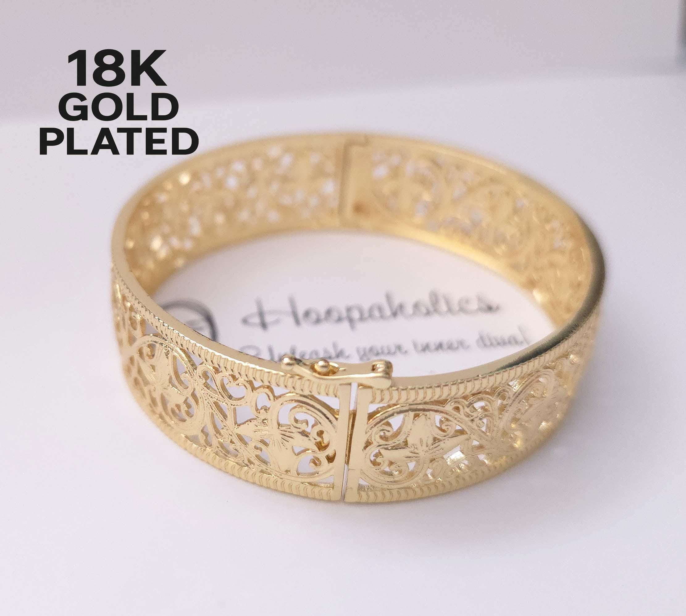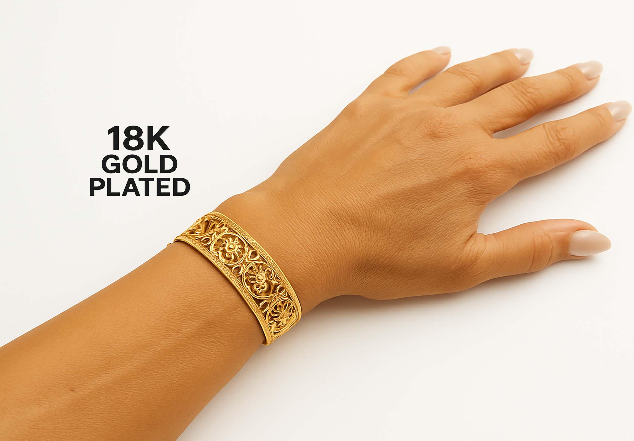 Add a touch of timeless luxury to your look with this exquisite 18K gold plated hinged bangle. Featuring intricate filigree detailing and a secure clasp, this bracelet blends classic craftsmanship with modern elegance. Perfect for special occasions or elevating everyday style, it shines beautifully under any light — a true statement of sophistication and grace.
