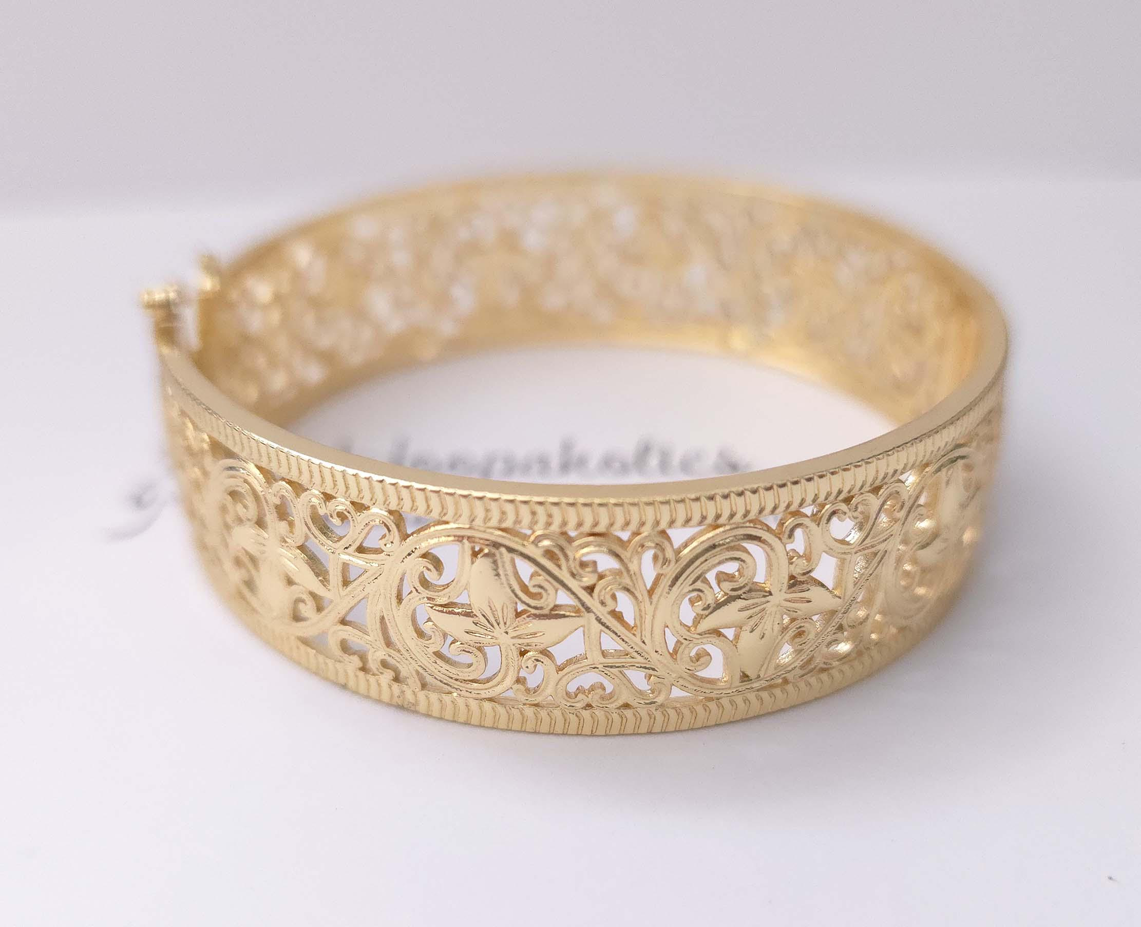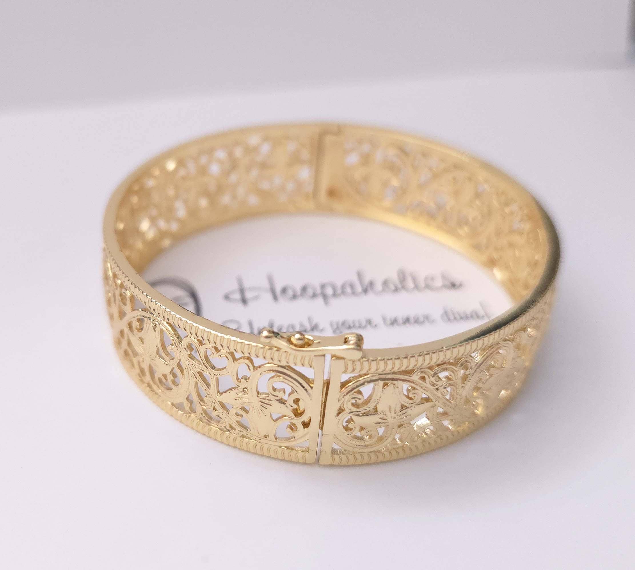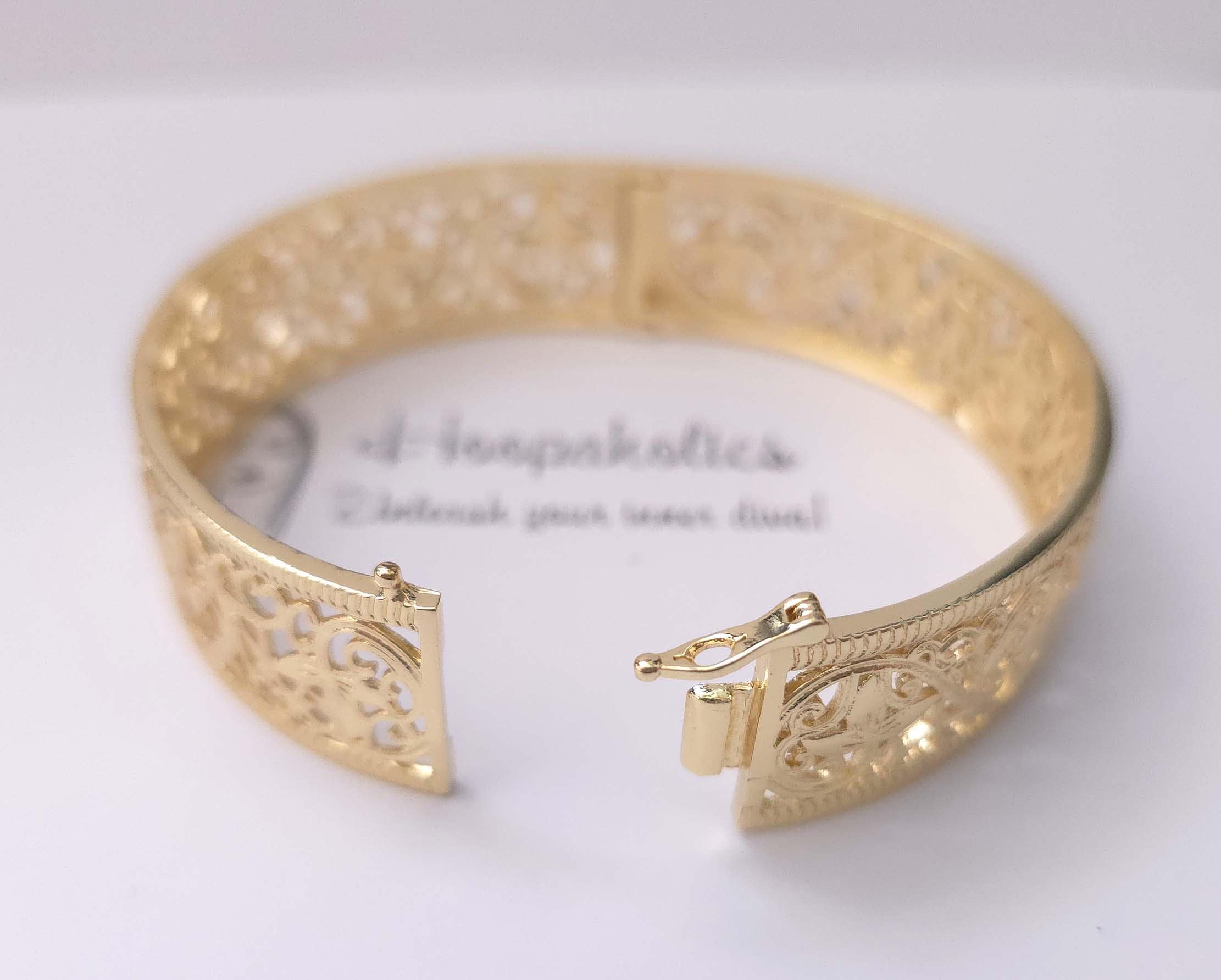 Add a touch of timeless luxury to your look with this exquisite 18K gold plated hinged bangle. Featuring intricate filigree detailing and a secure clasp, this bracelet blends classic craftsmanship with modern elegance. Perfect for special occasions or elevating everyday style, it shines beautifully under any light — a true statement of sophistication and grace.