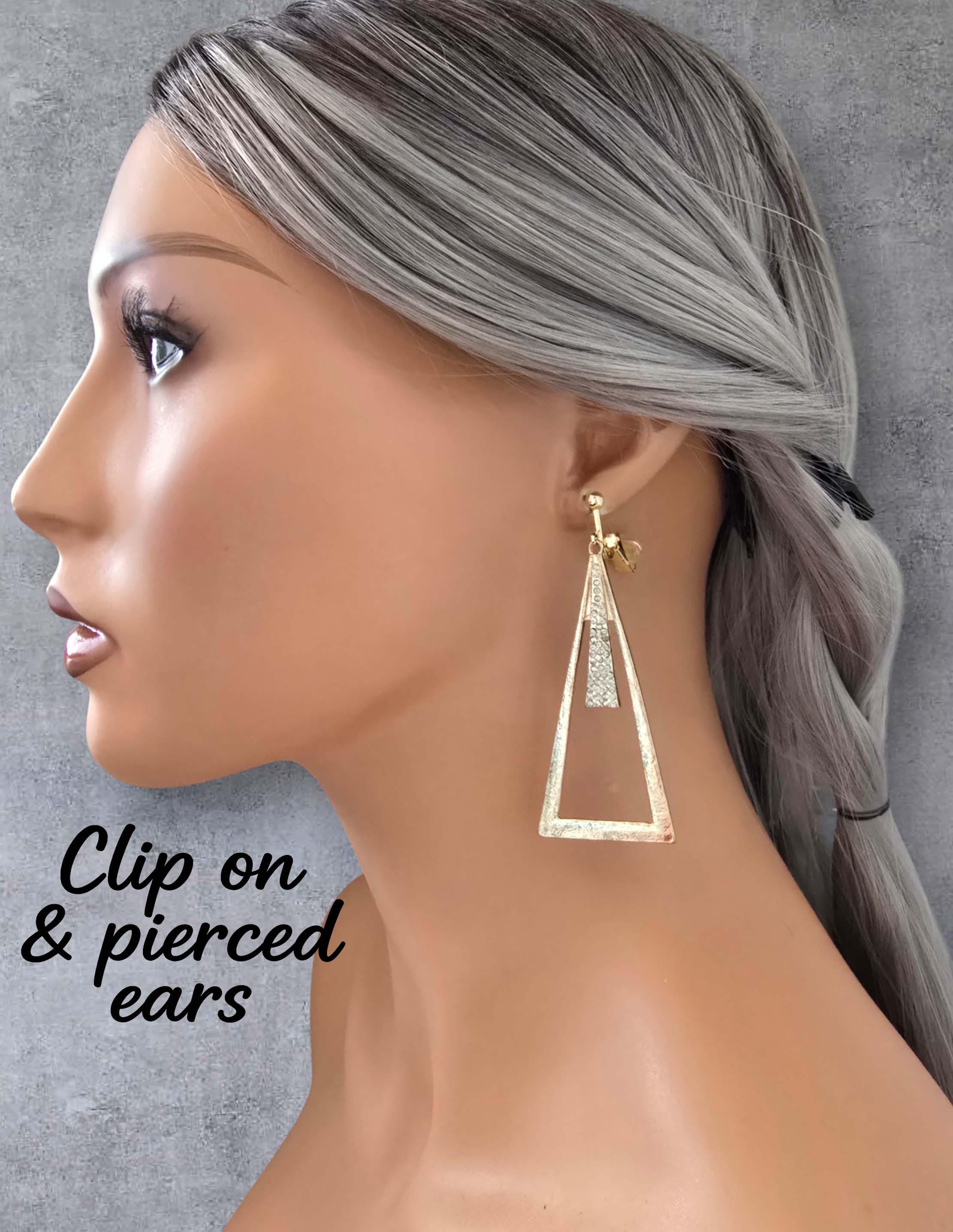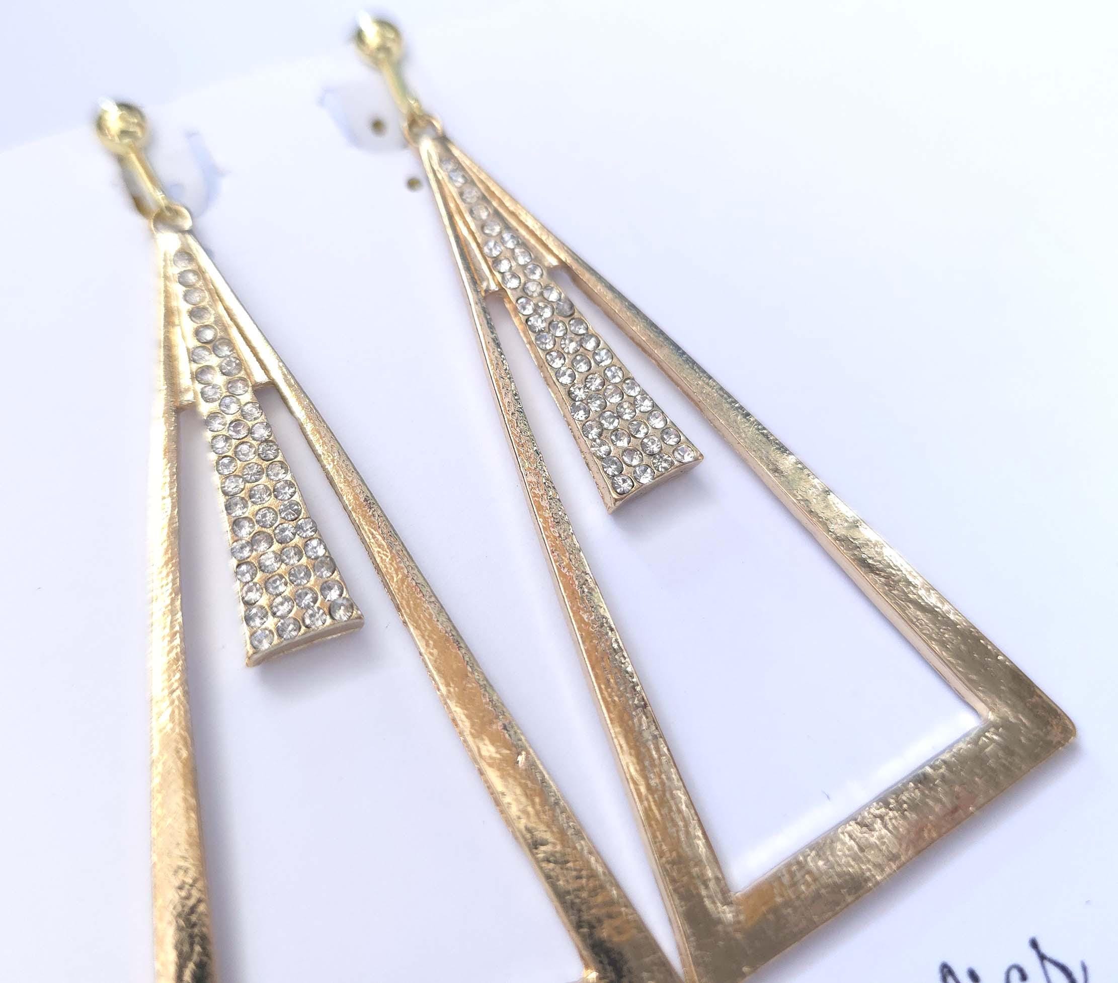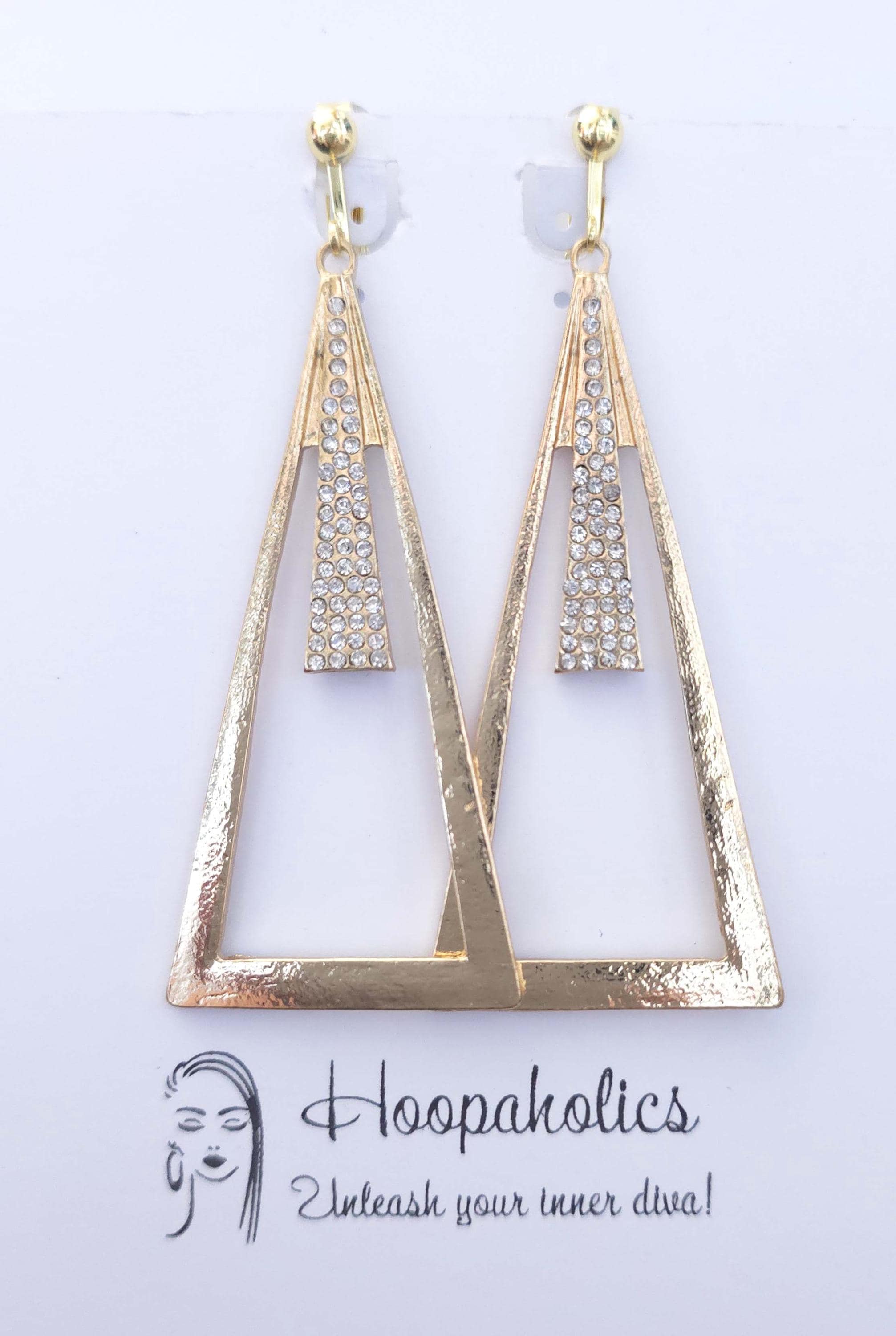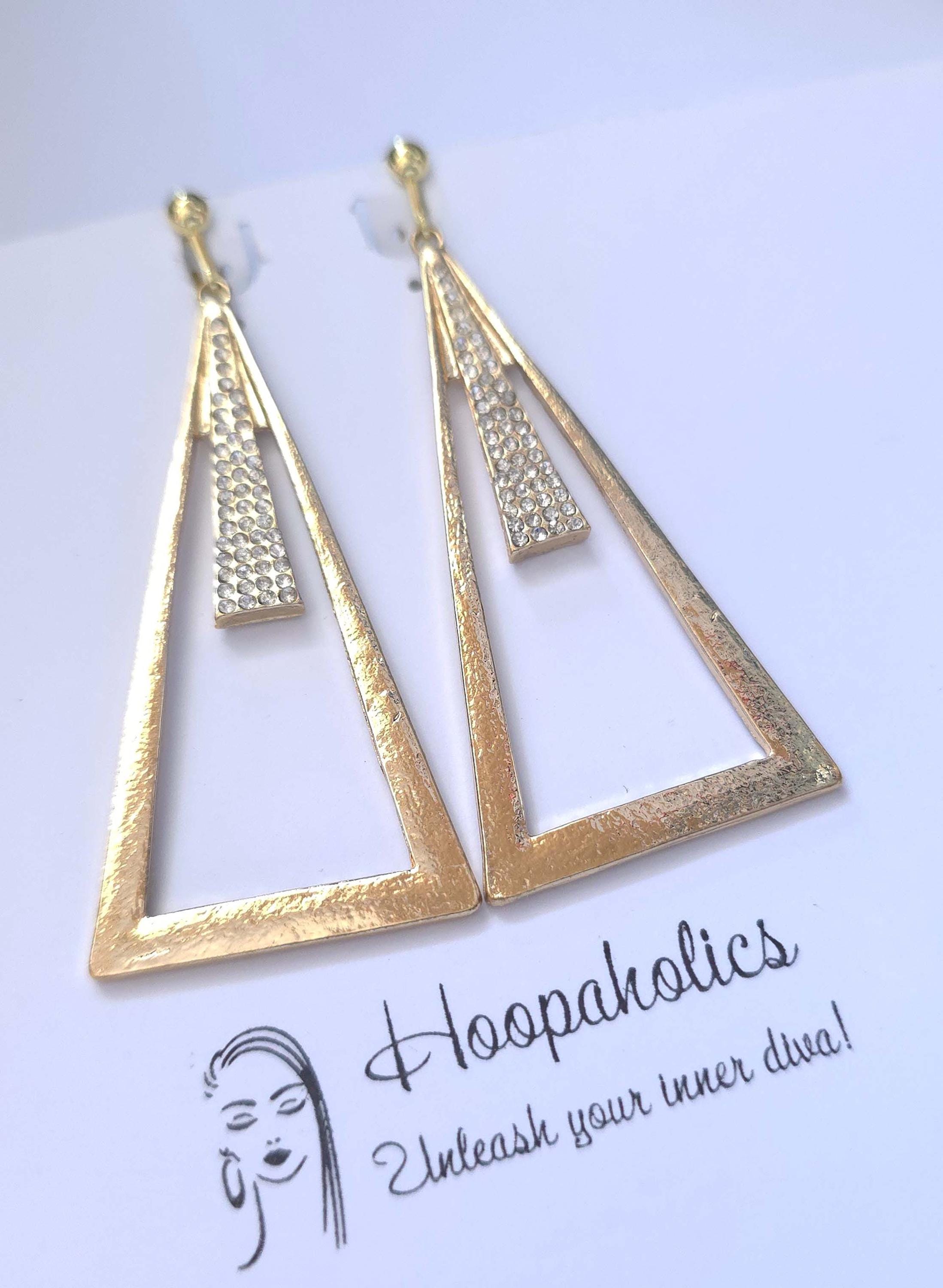 Turn heads with these stunning Golden Geometric Glam Earrings from Hoopaholics. Designed with bold triangular frames and shimmering rhinestone accents, these earrings perfectly blend modern elegance with statement style.