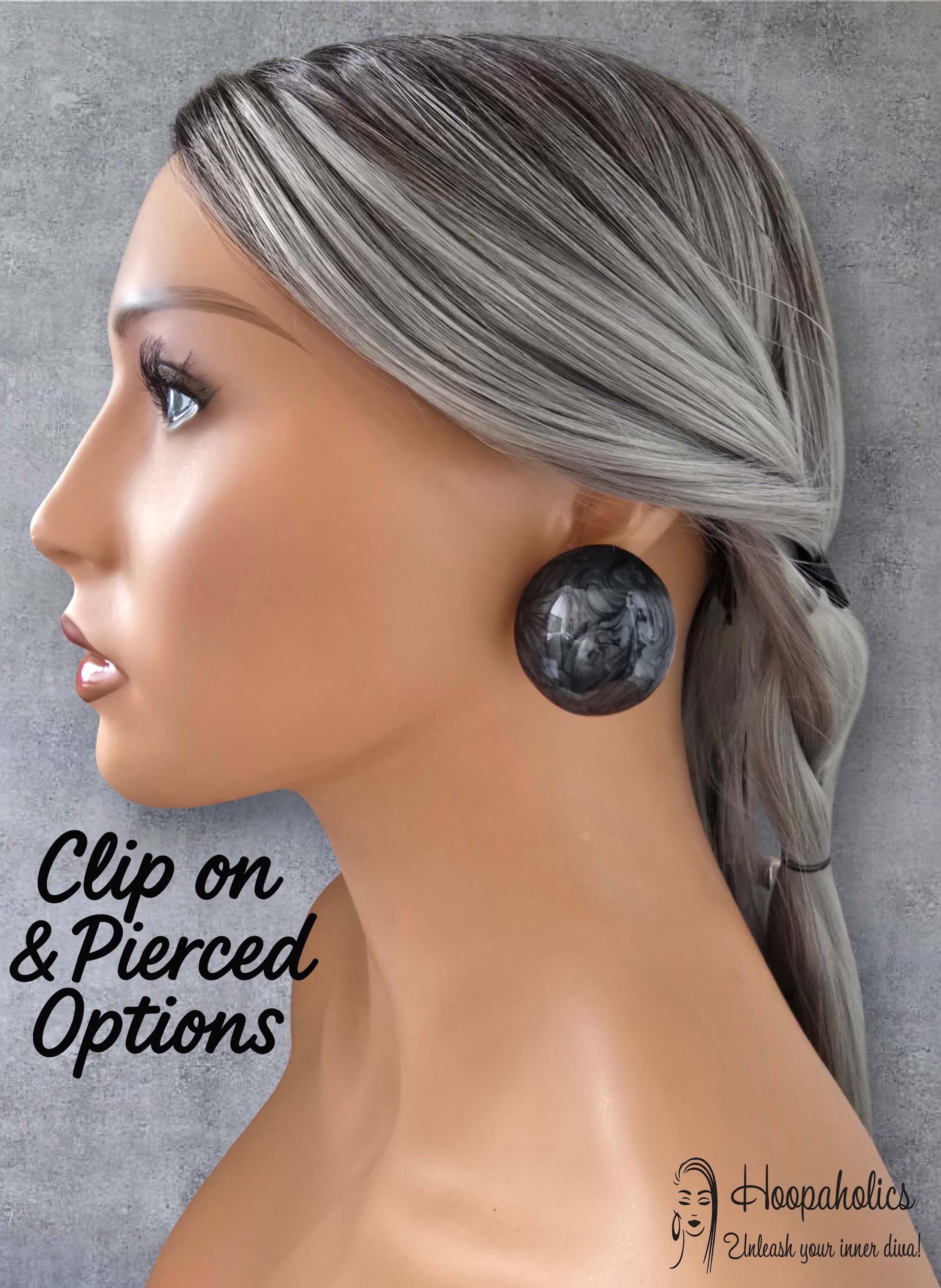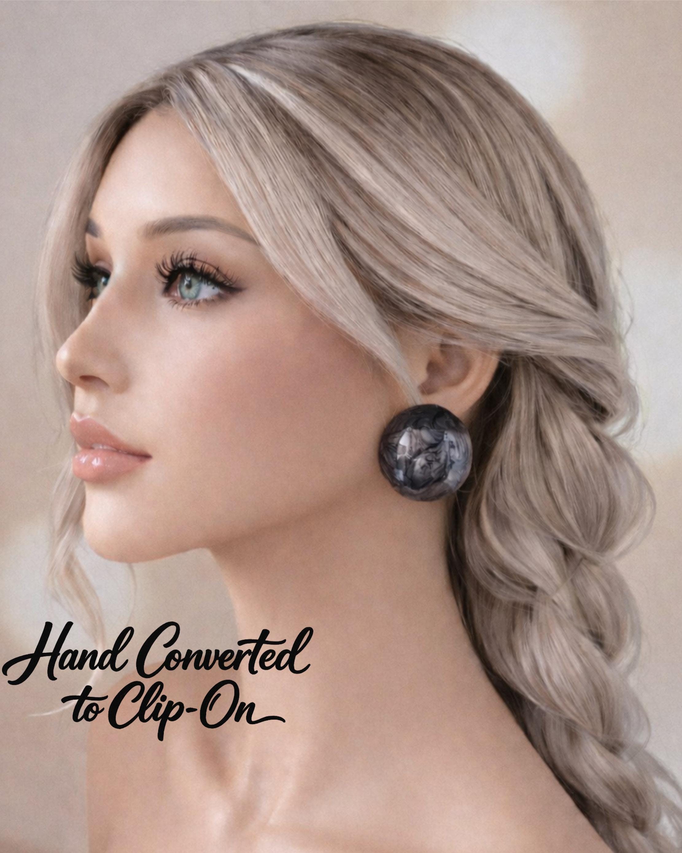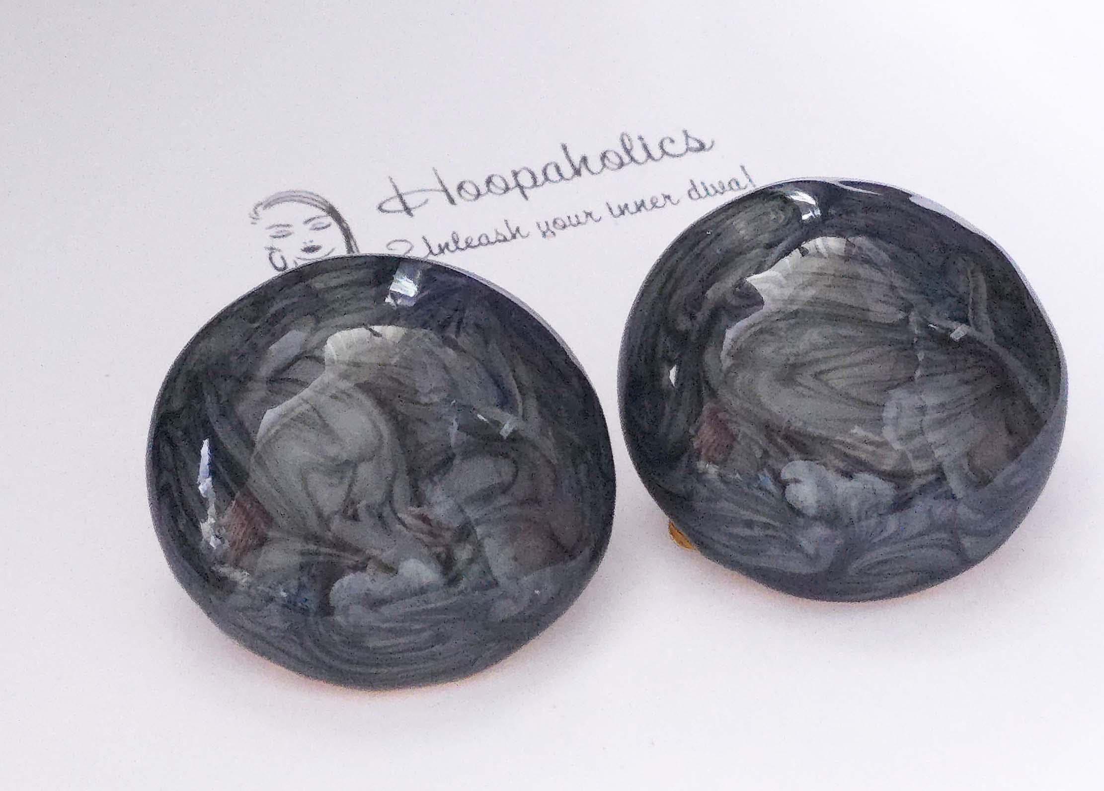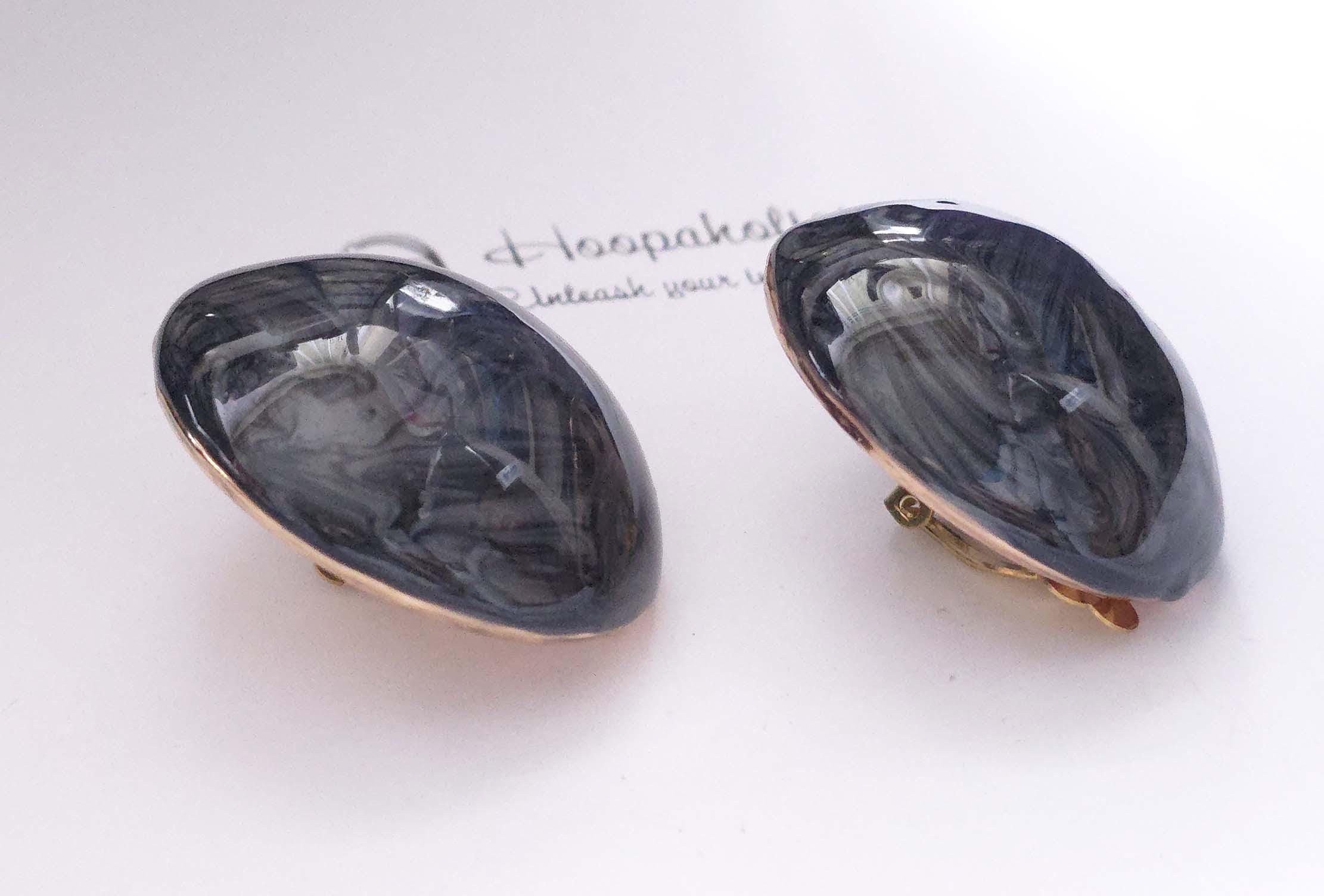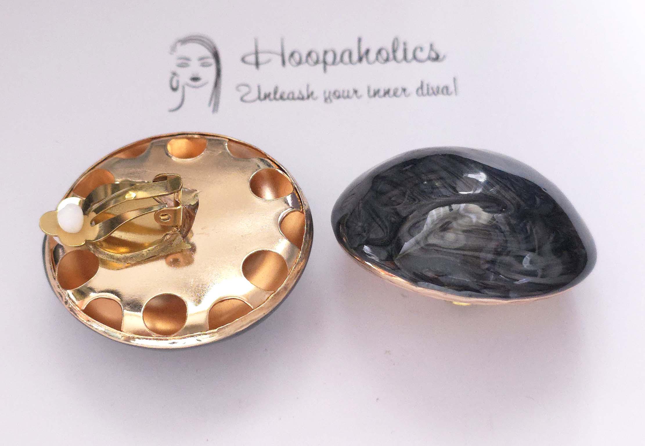 Add a touch of bold elegance with these black & grey swirl resin top clip-on earrings. Each earring features a smooth, round hollow metal dome shape with a stunning marbled gray and smoky pattern that catches the light beautifully.