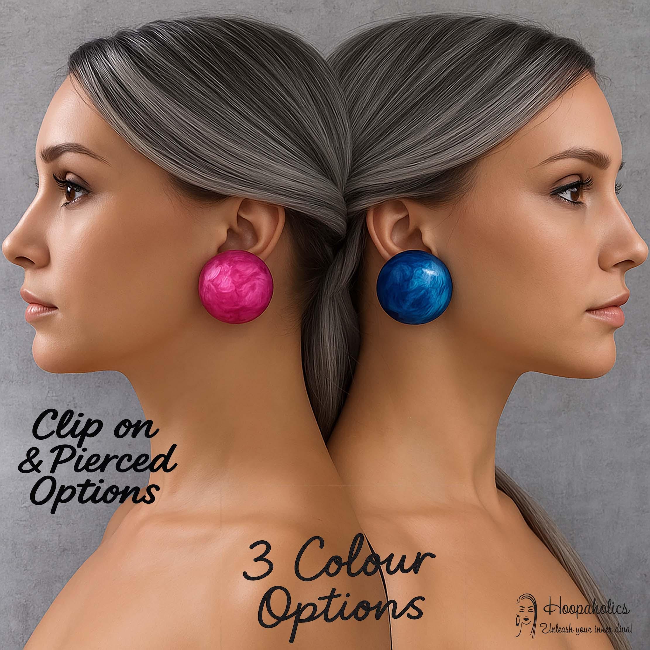 Add a touch of bold elegance with these big swirl resin top clip-on earrings. Each earring features a smooth, round hollow metal dome shape with a stunning marbled pattern that catches the light beautifully. Colour options Pink, Purple or Blue