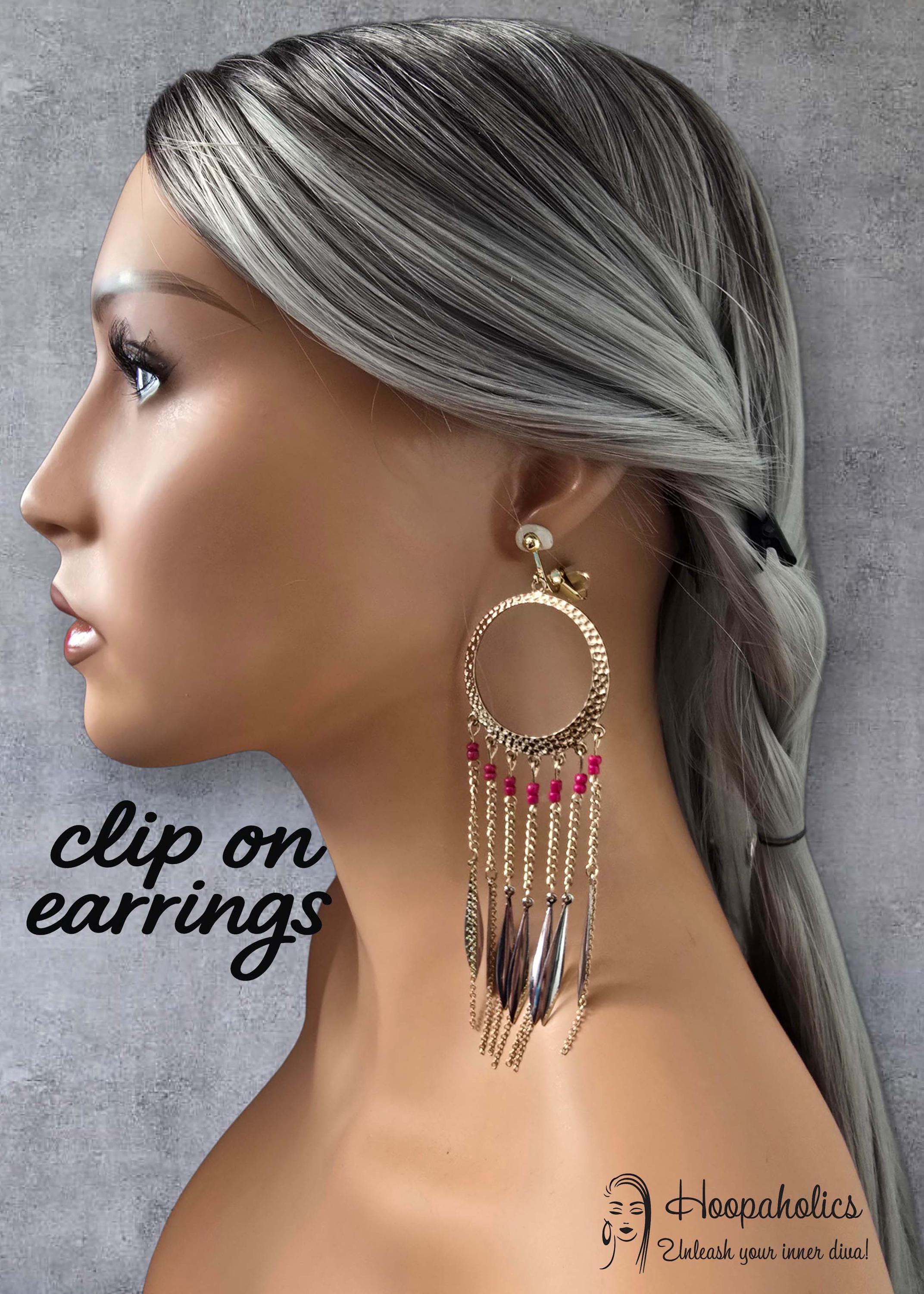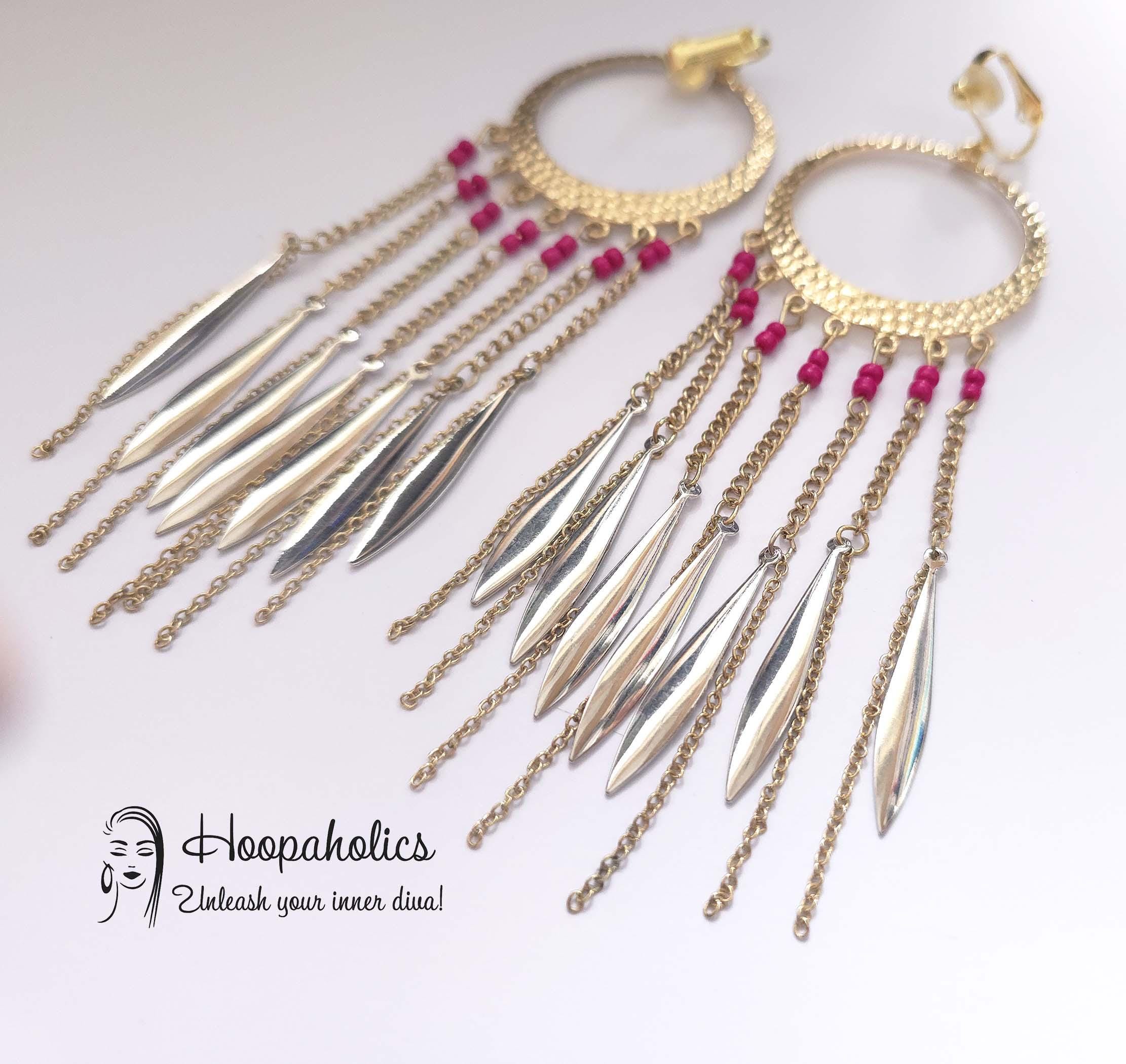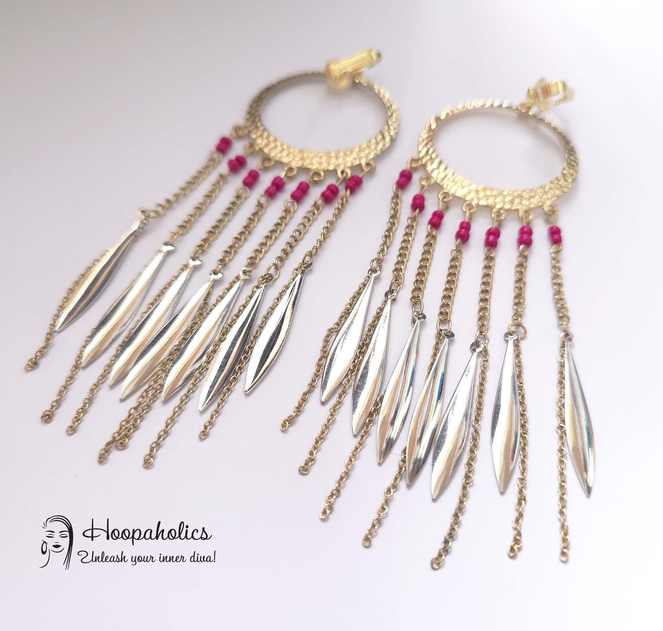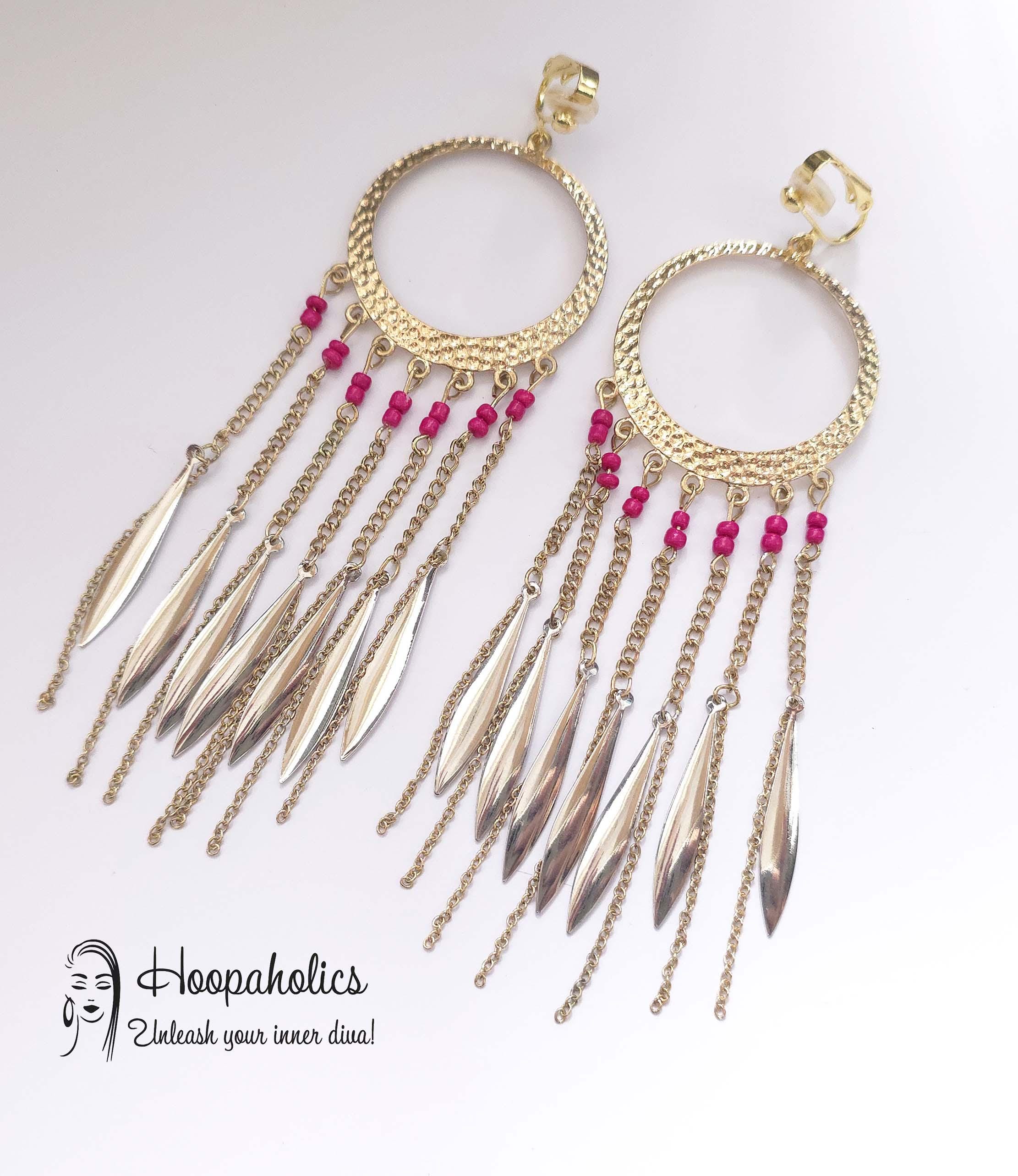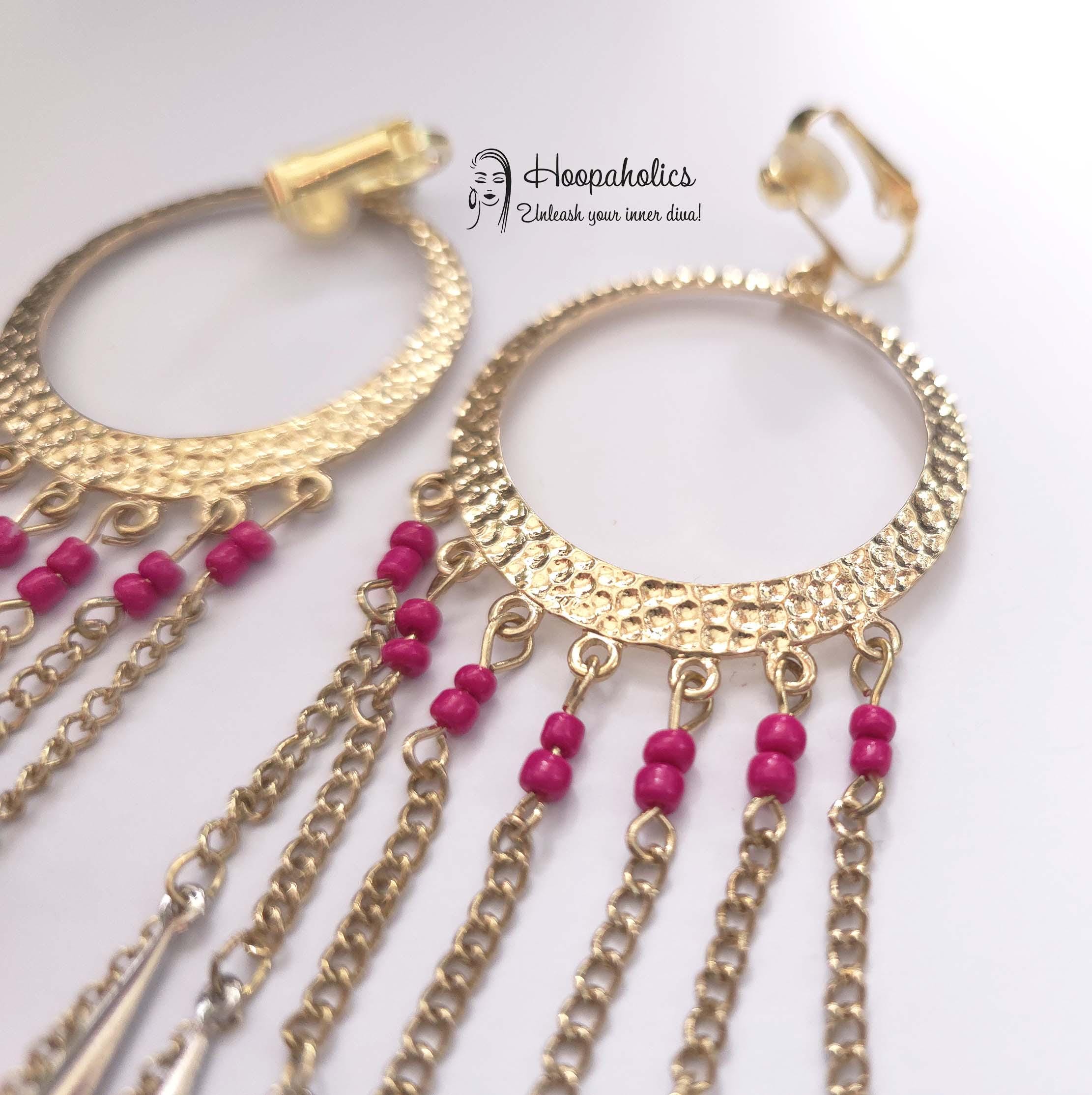Add instant elegance and color to your look with these beautiful gold & silver-tone clip-on earrings. They combine comfort with bold boho-chic style. Each earring features a textured gold hoop finished with delicate hanging chains, vibrant fuchsia beads, and sleek silver drops