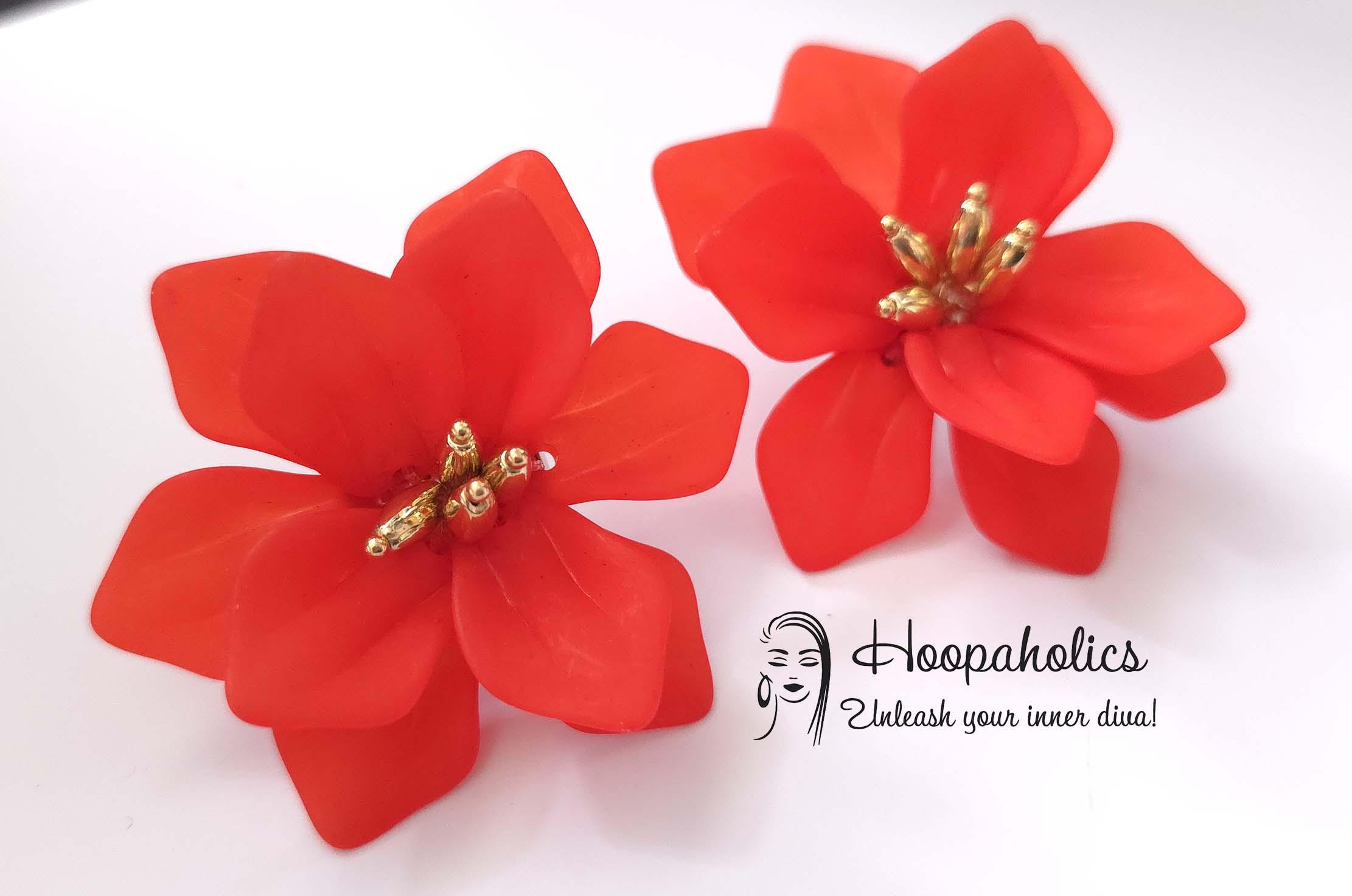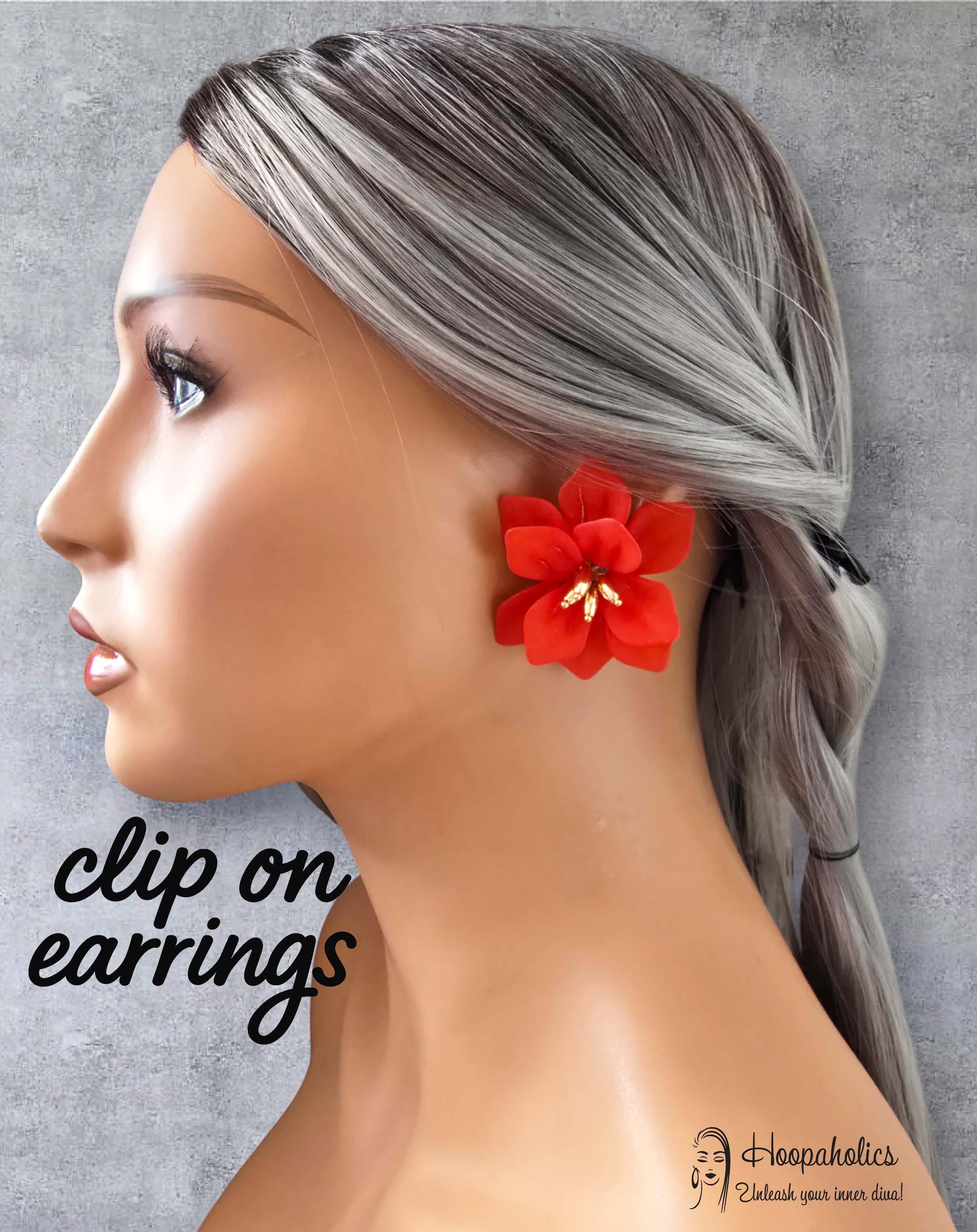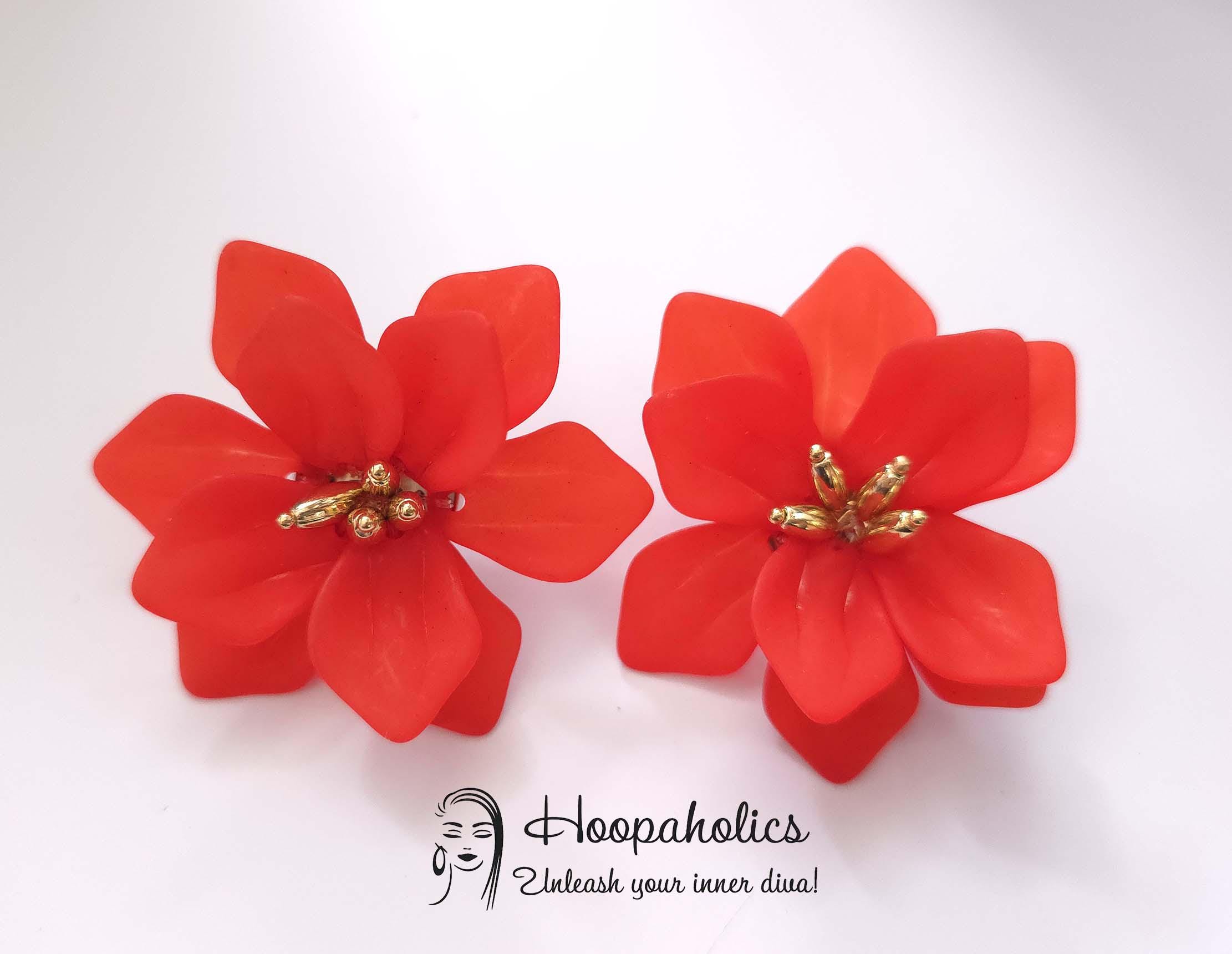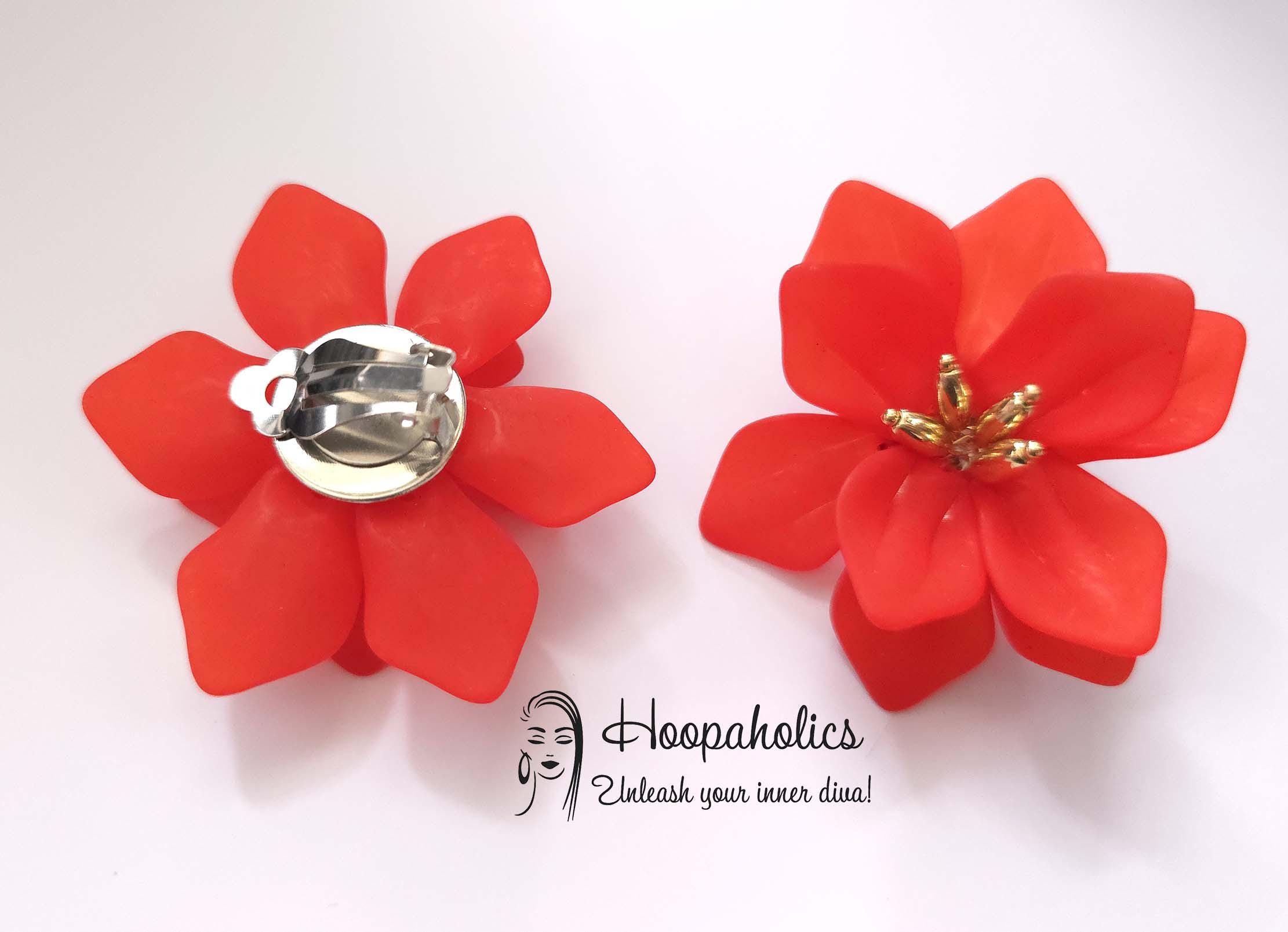 Add a vibrant pop of colour with these bold light red coral color flower clip-on earrings! Designed with soft acrylic petal layers and a touch of gold at the centre, these eye-catching earrings are perfect for making a statement without the need for pierced ears. Lightweight and comfortable, they bring a fresh, summery charm to any outfit.