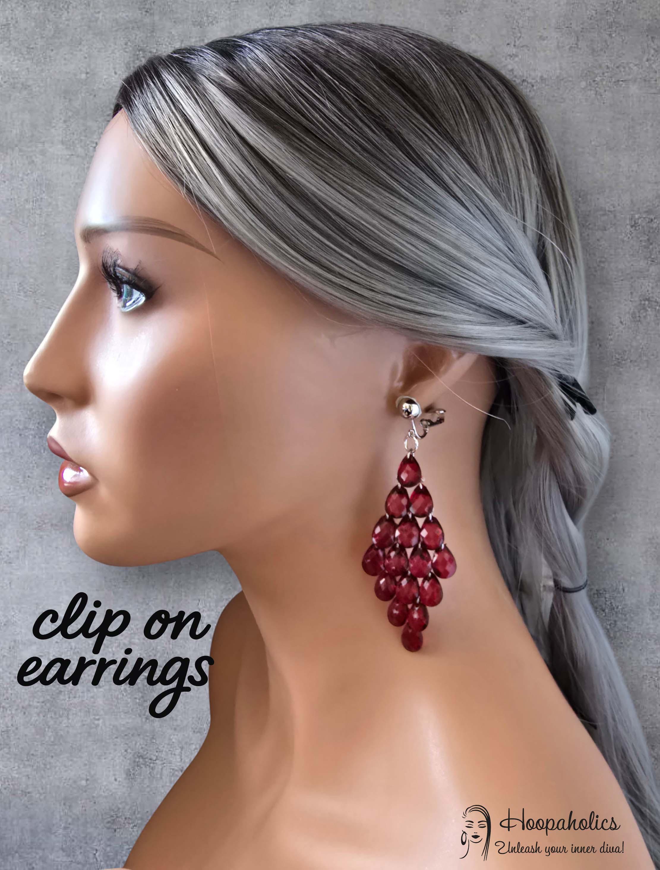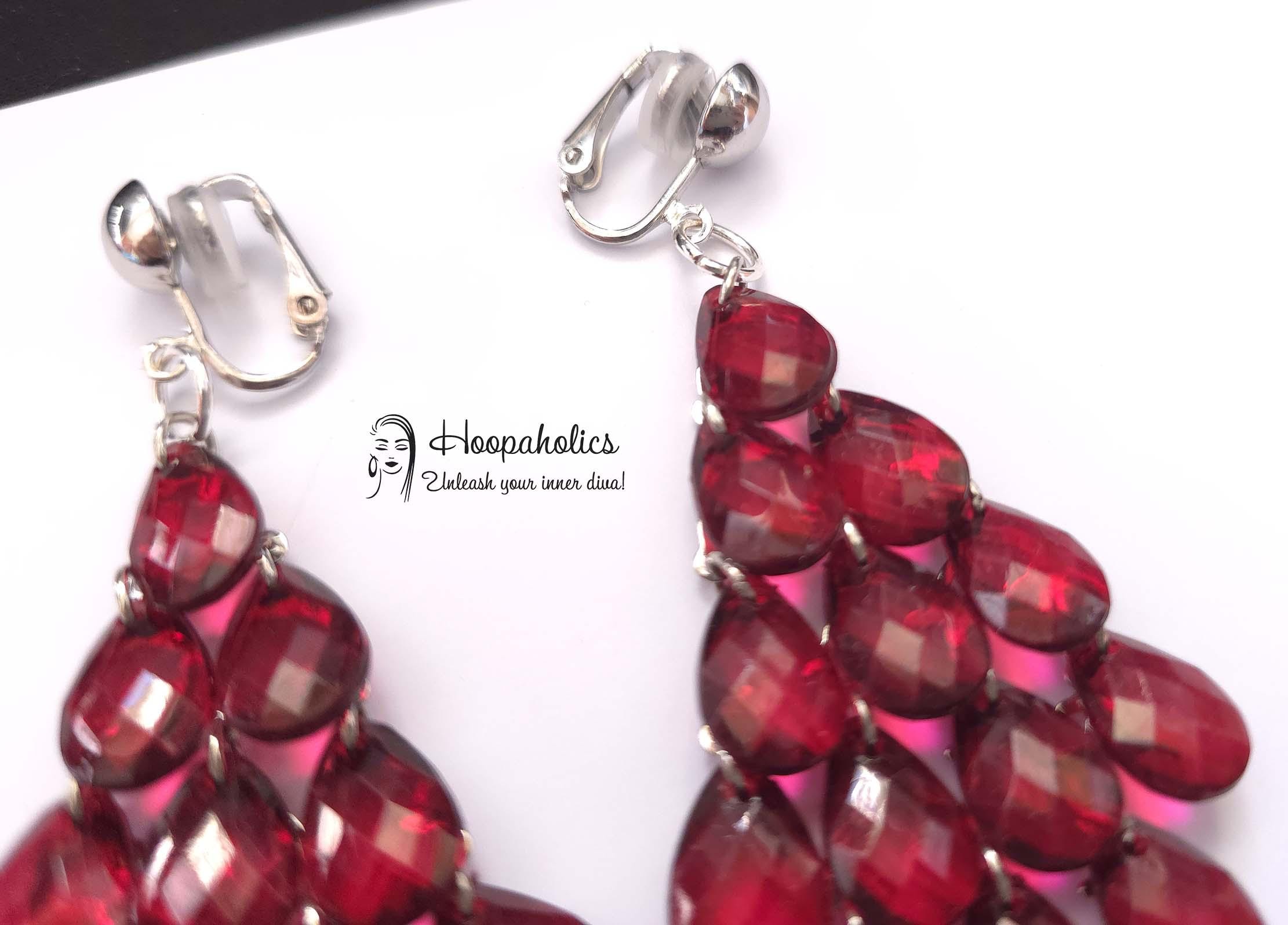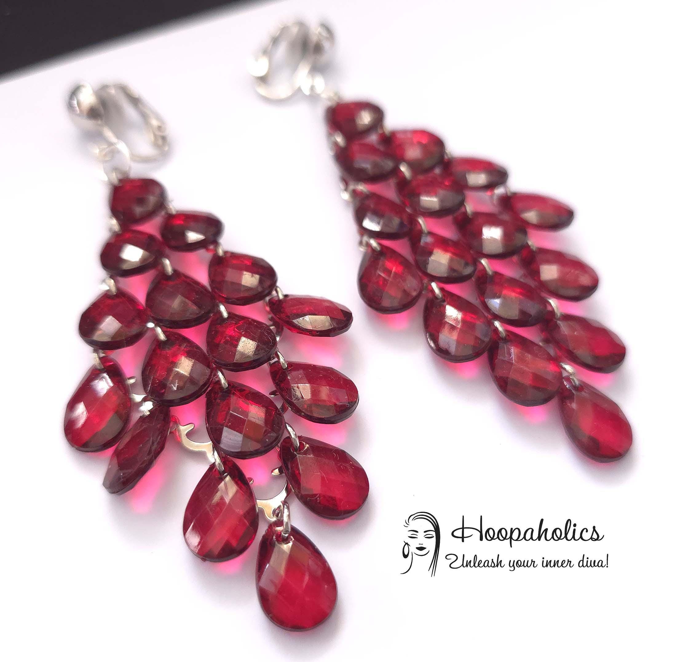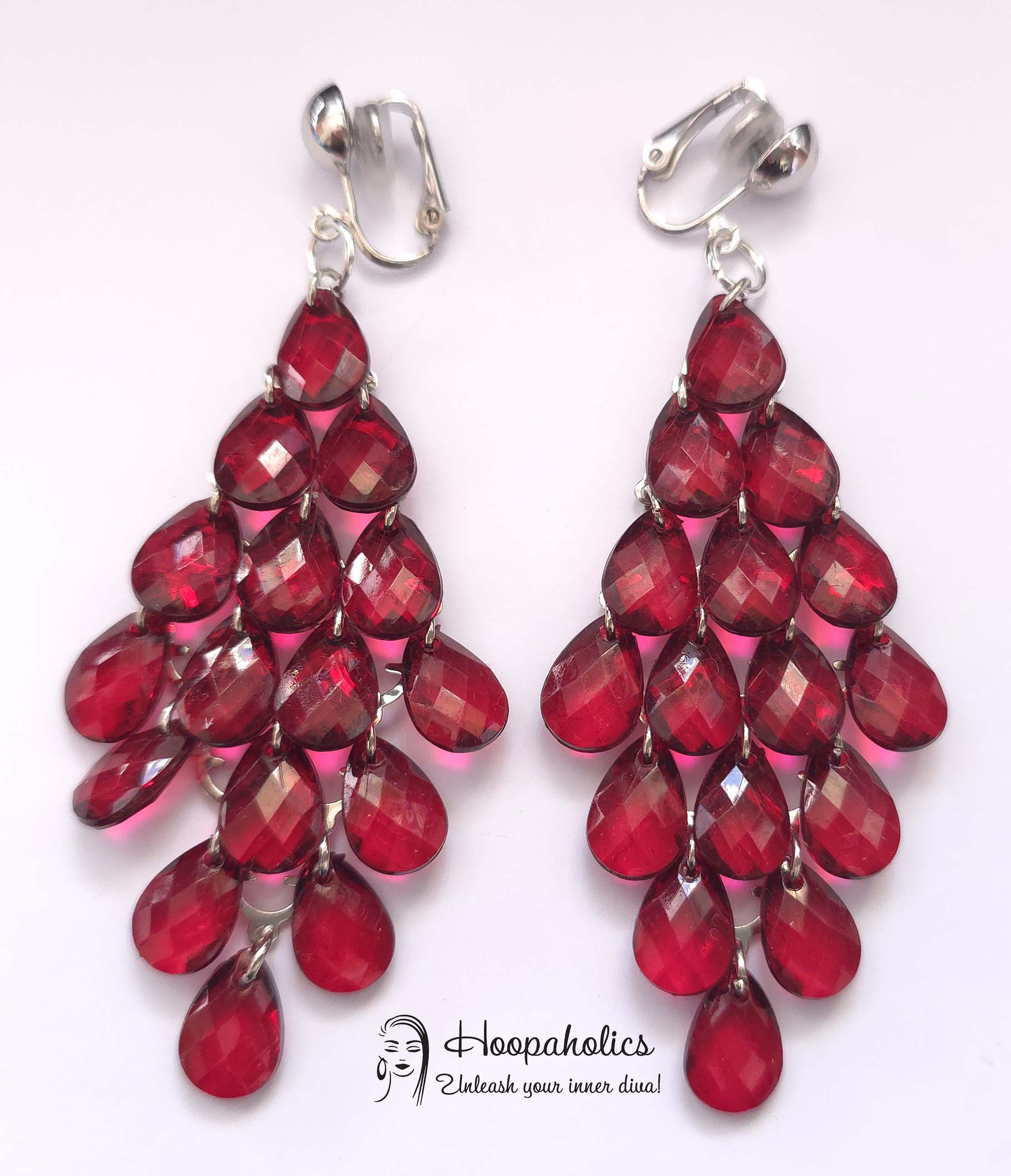 Turn heads with these stunning red crystal teardrop clip-on chandelier earrings, designed to add instant glamour to any outfit. Featuring multiple faceted red glass drops that shimmer beautifully in the light, these earrings bring a luxurious, eye-catching sparkle without the need for pierced ears.