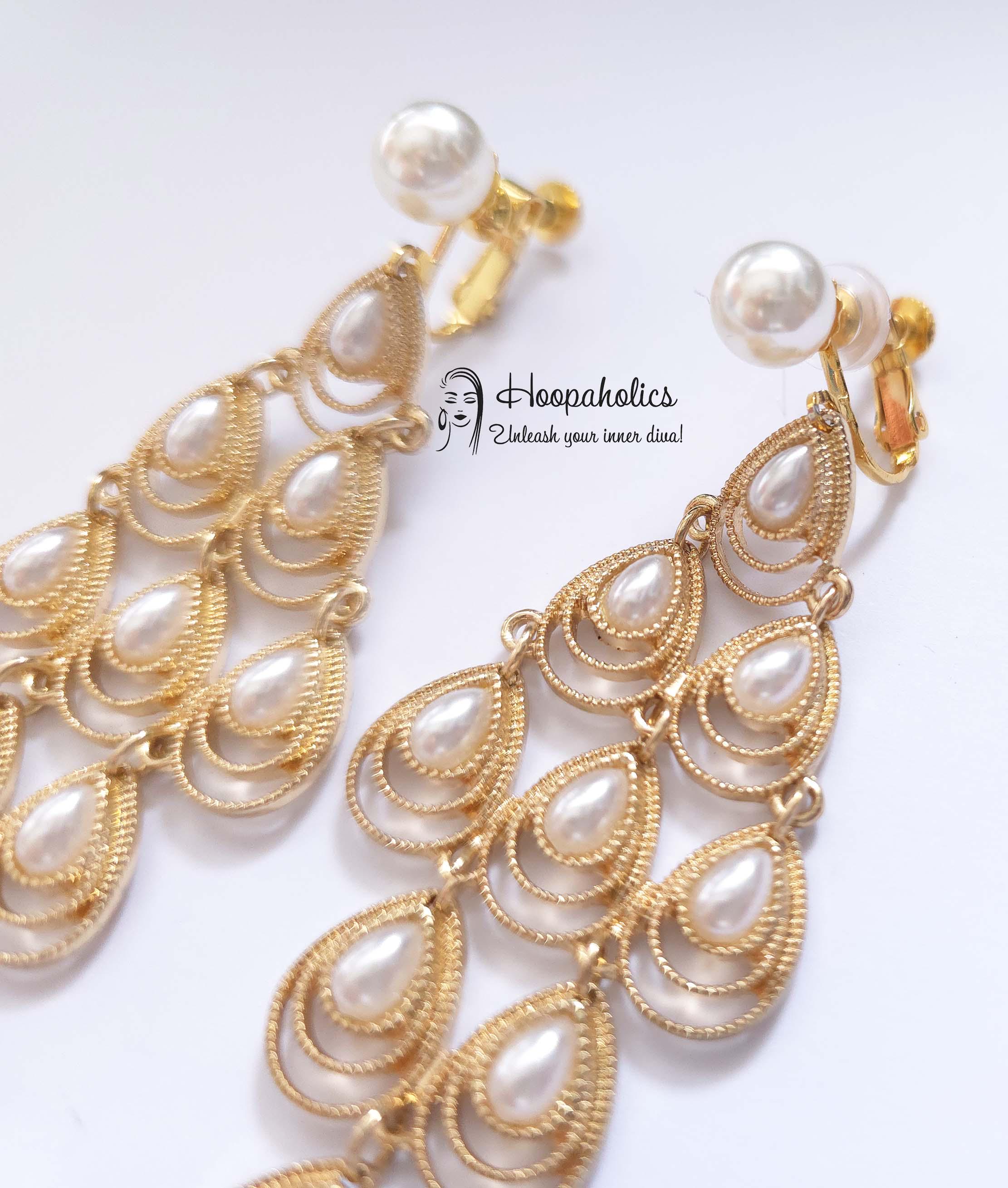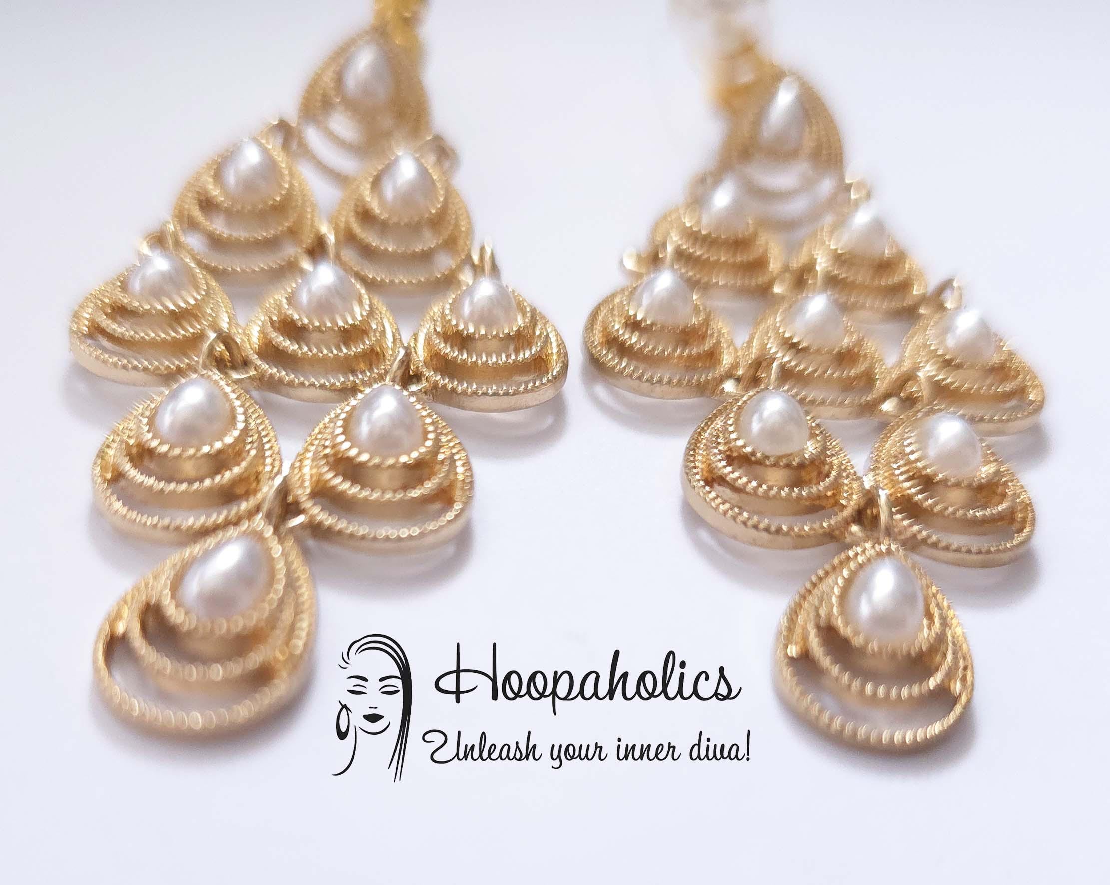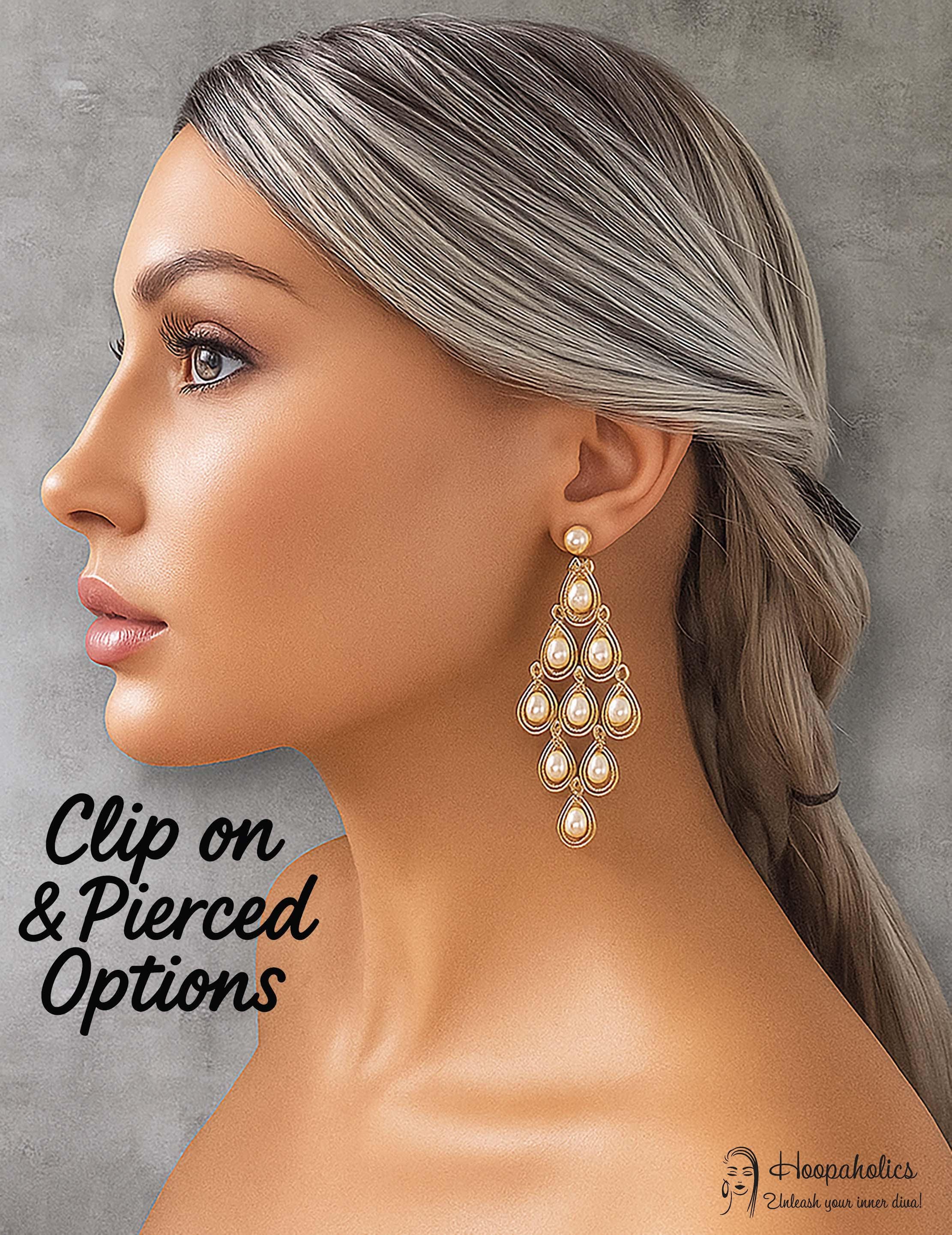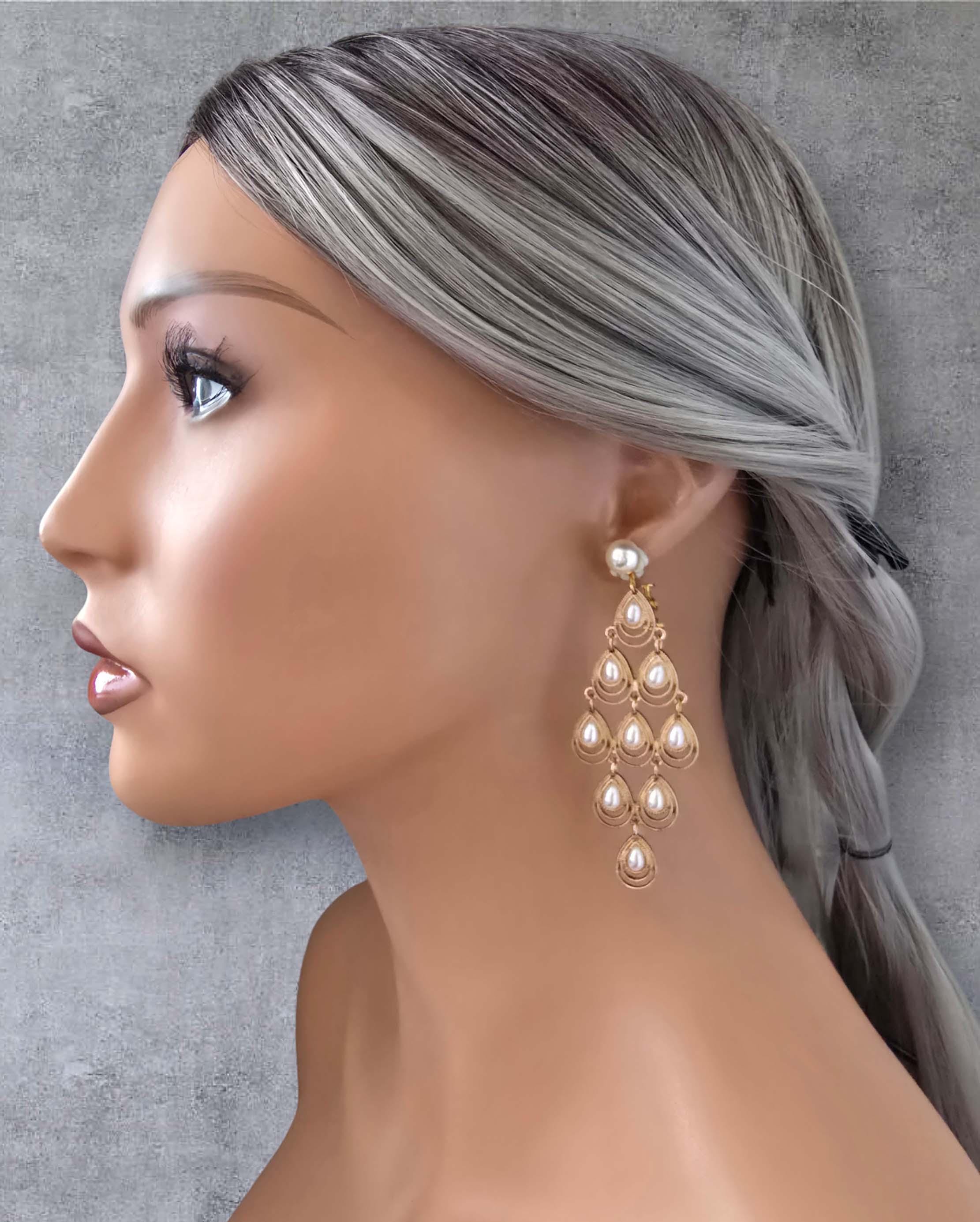 Add a touch of timeless elegance to your look with these stunning gold tone chandelier earrings. Featuring cascading teardrop frames with lustrous faux pearls, these earrings create beautiful movement and sparkle with every turn.