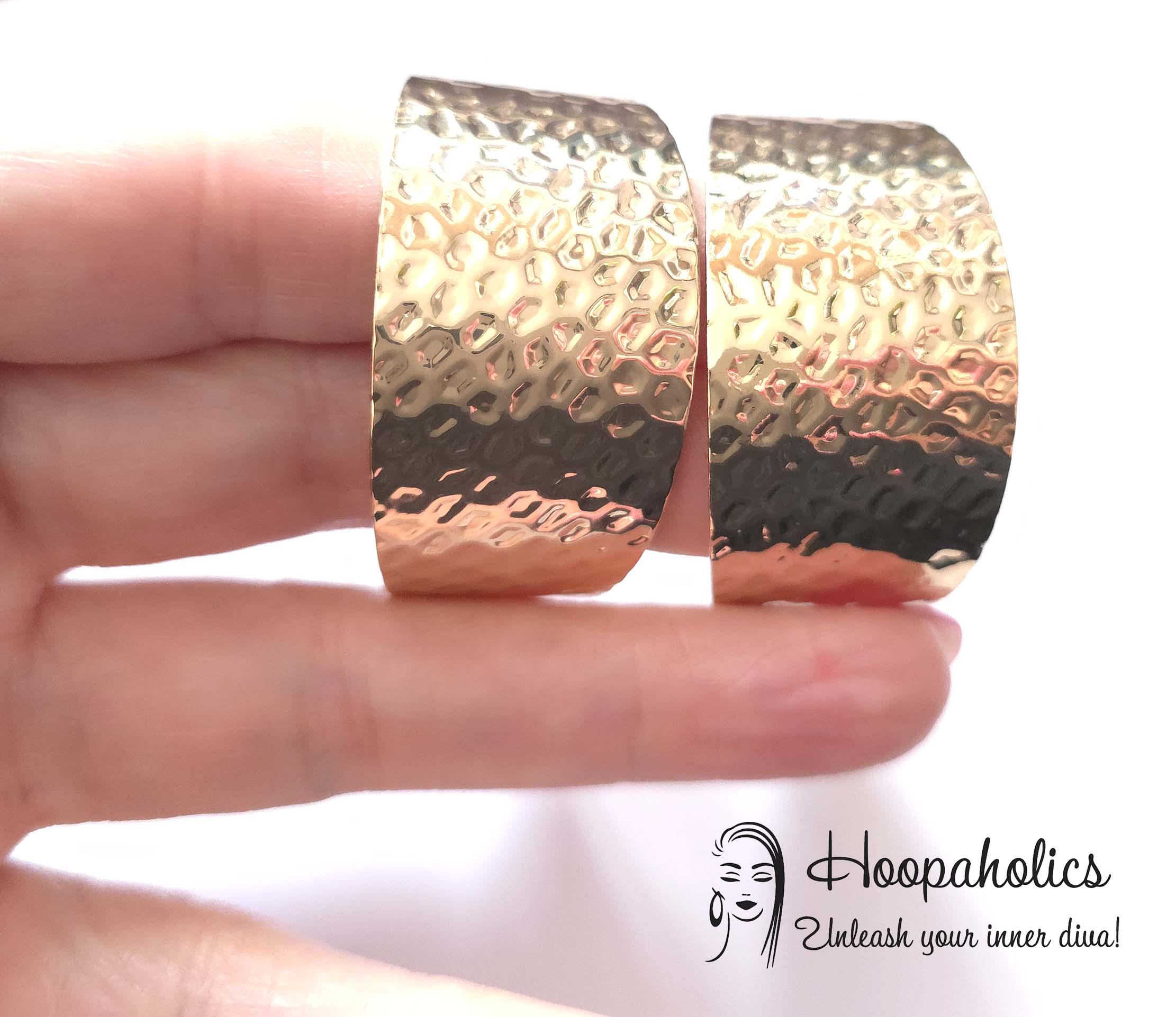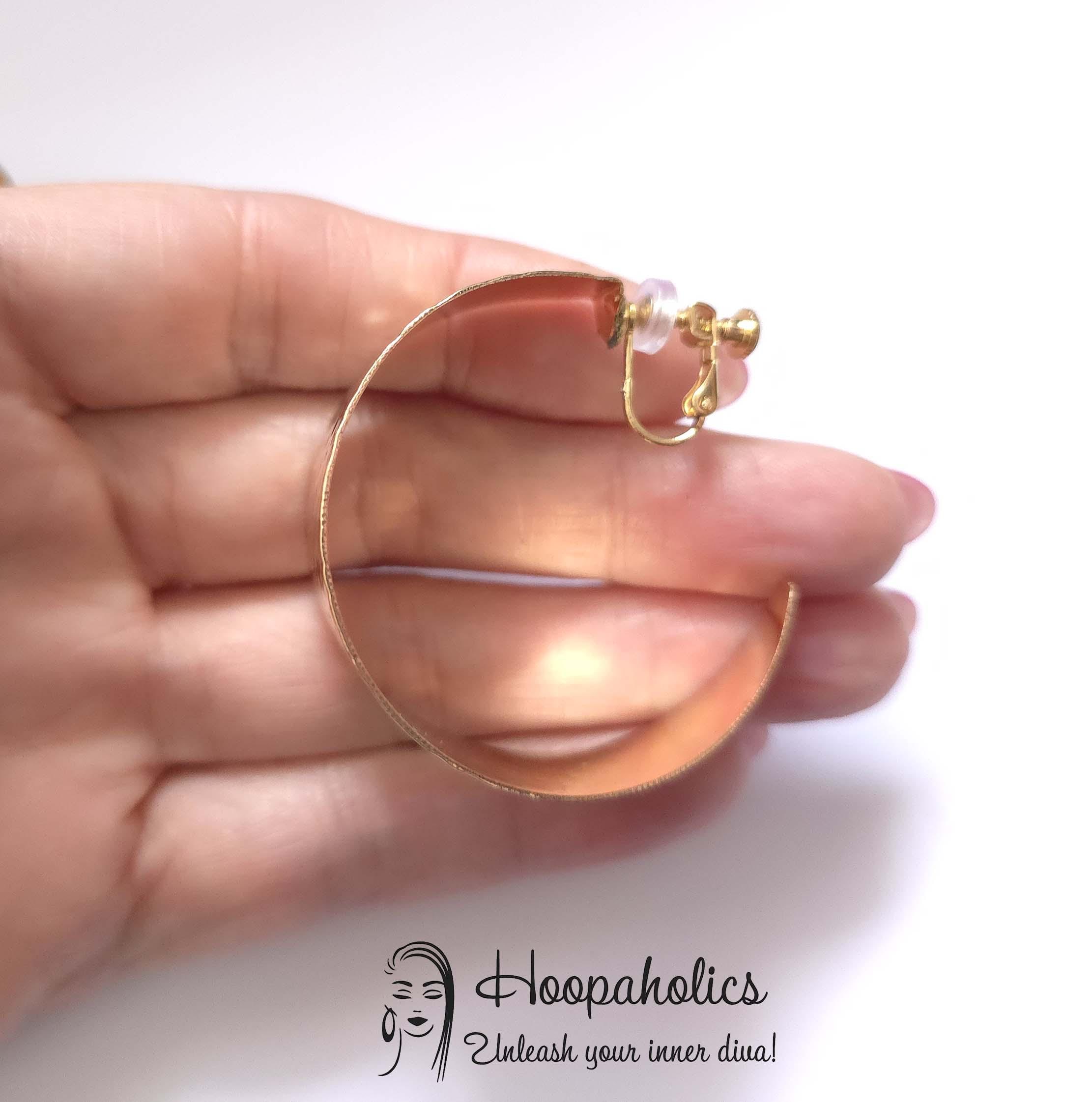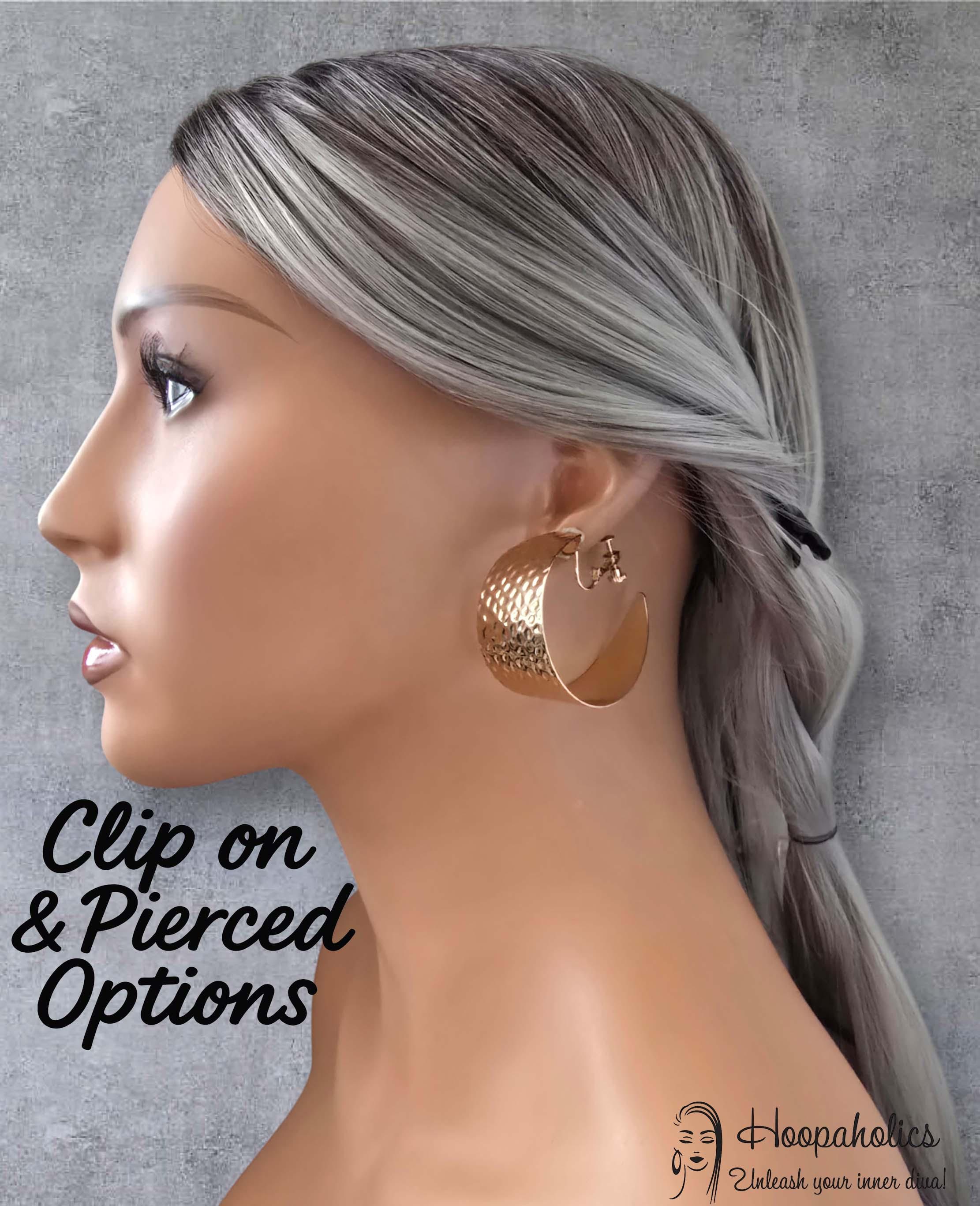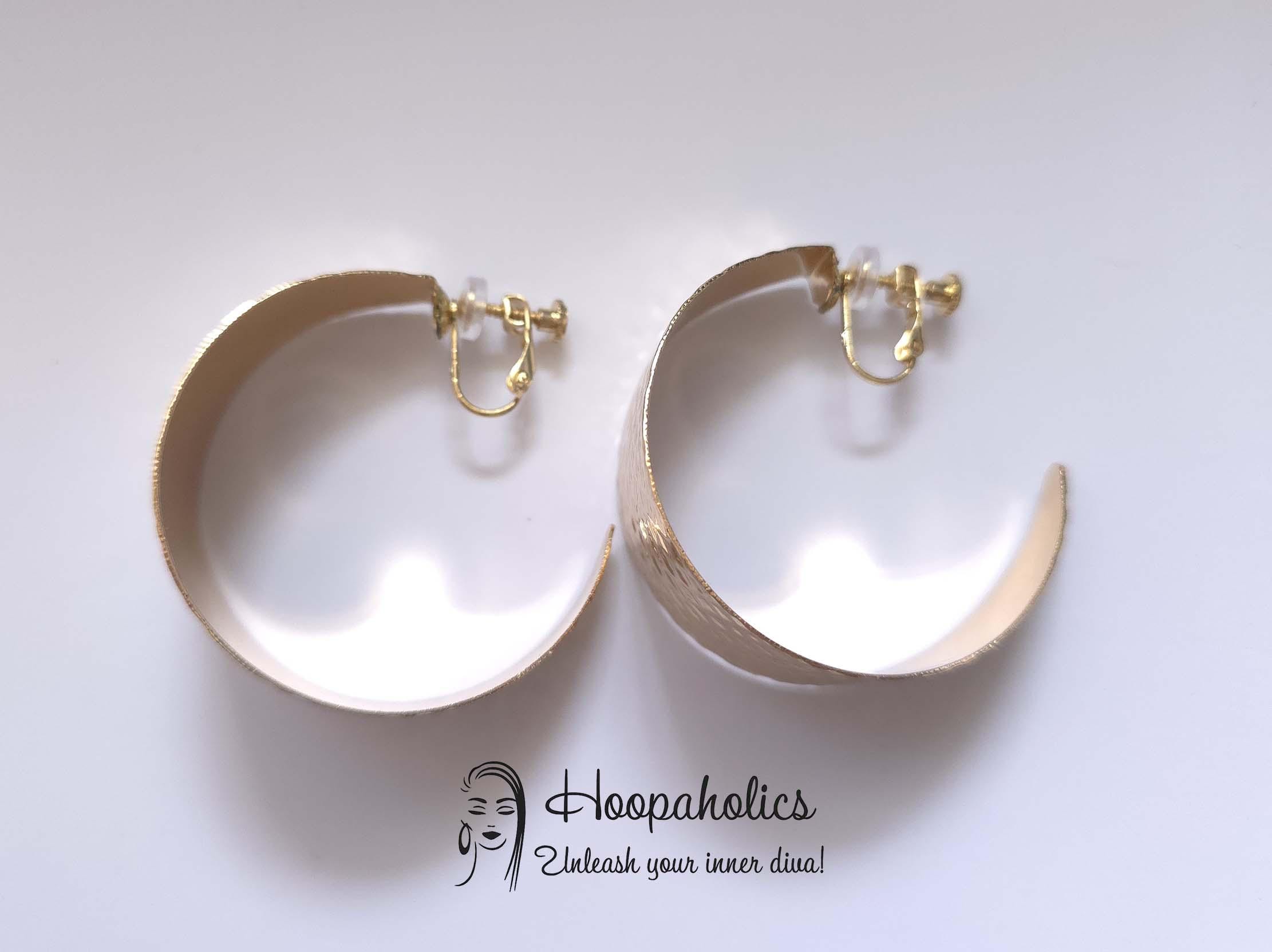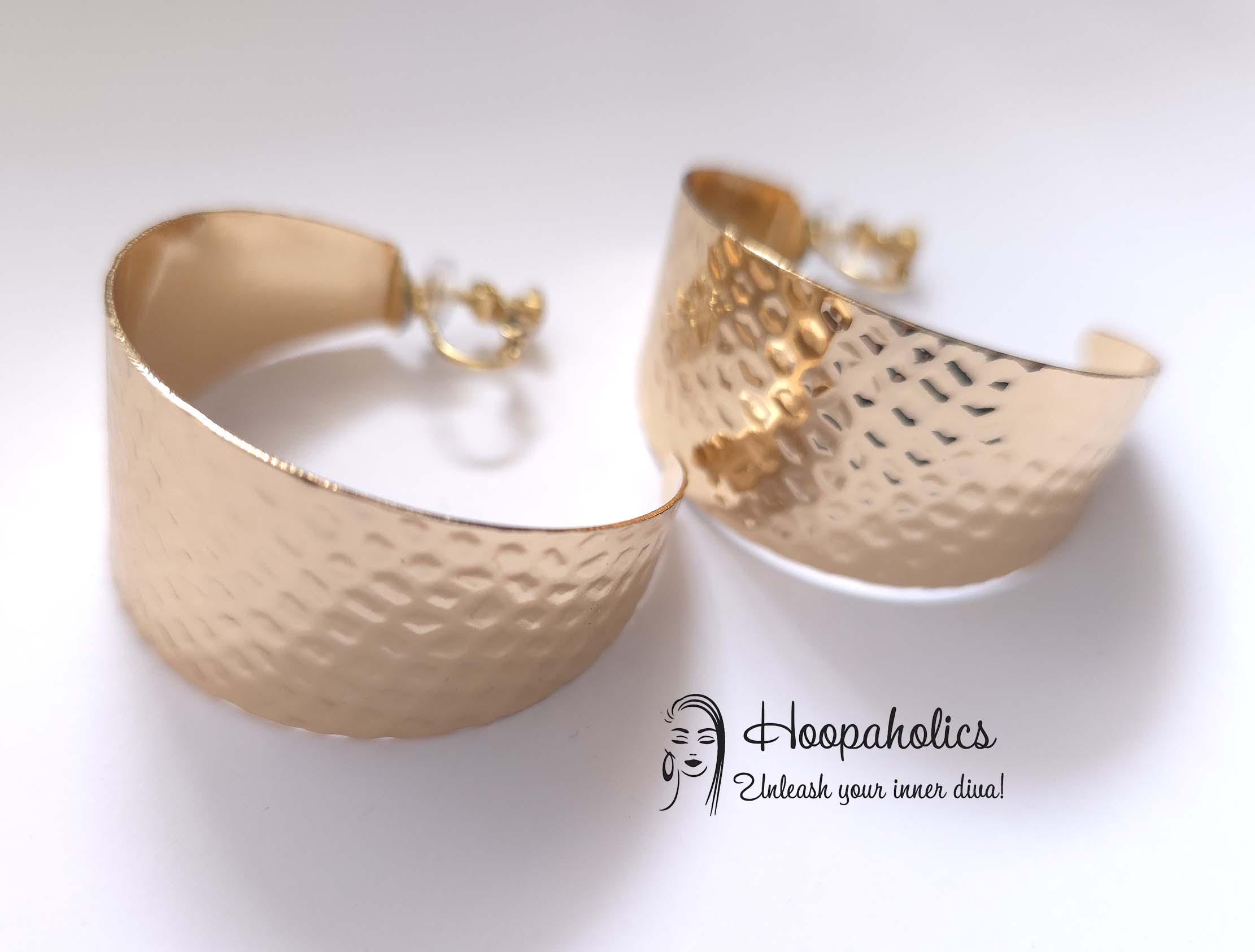 These wide hammered gold tone clip-on hoop earrings are the perfect blend of bold and elegant. they feature a gently curved wide-band style with a hammered texture that beautifully reflects the light. Despite their statement size, they’re lightweight.
