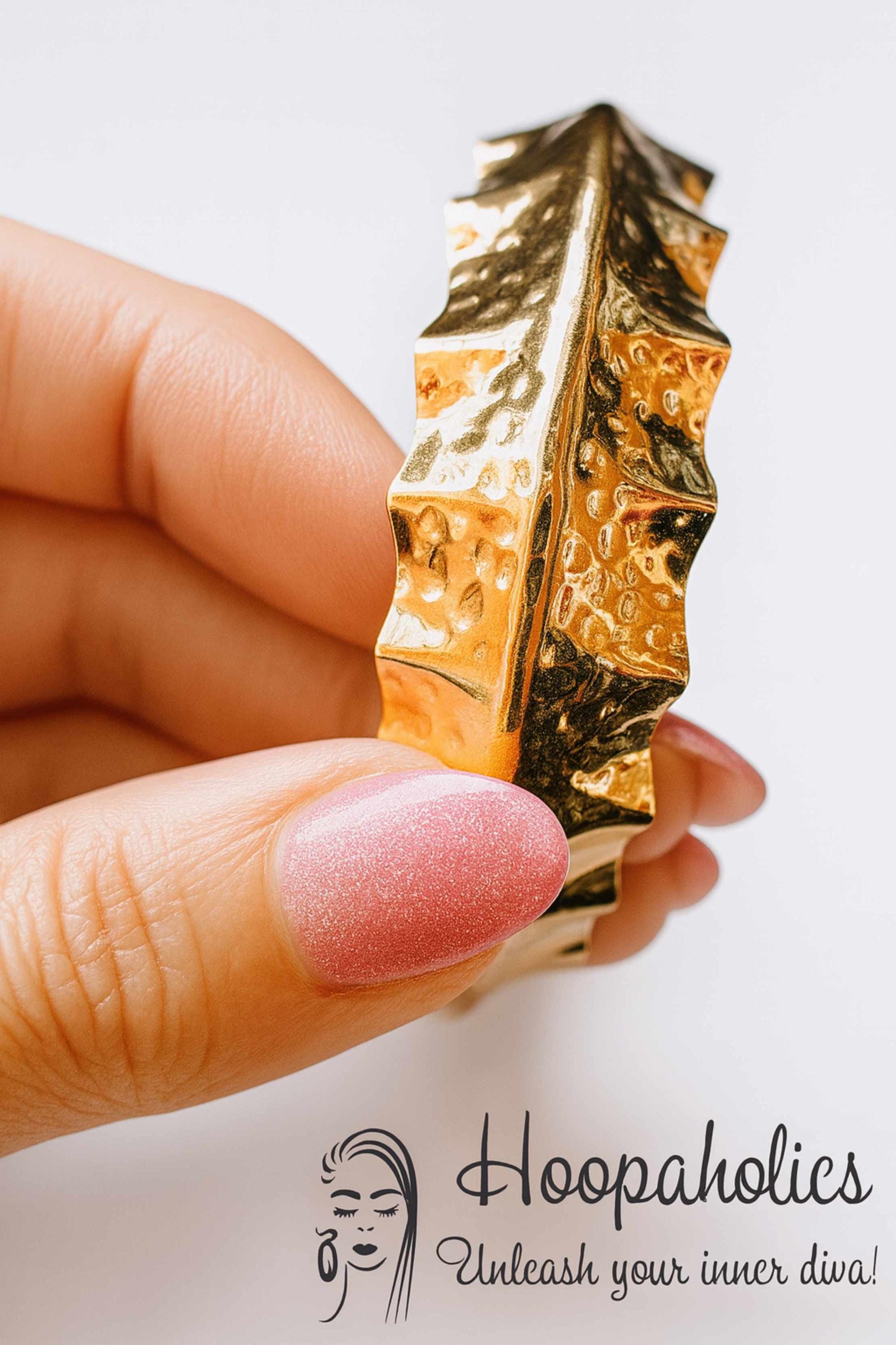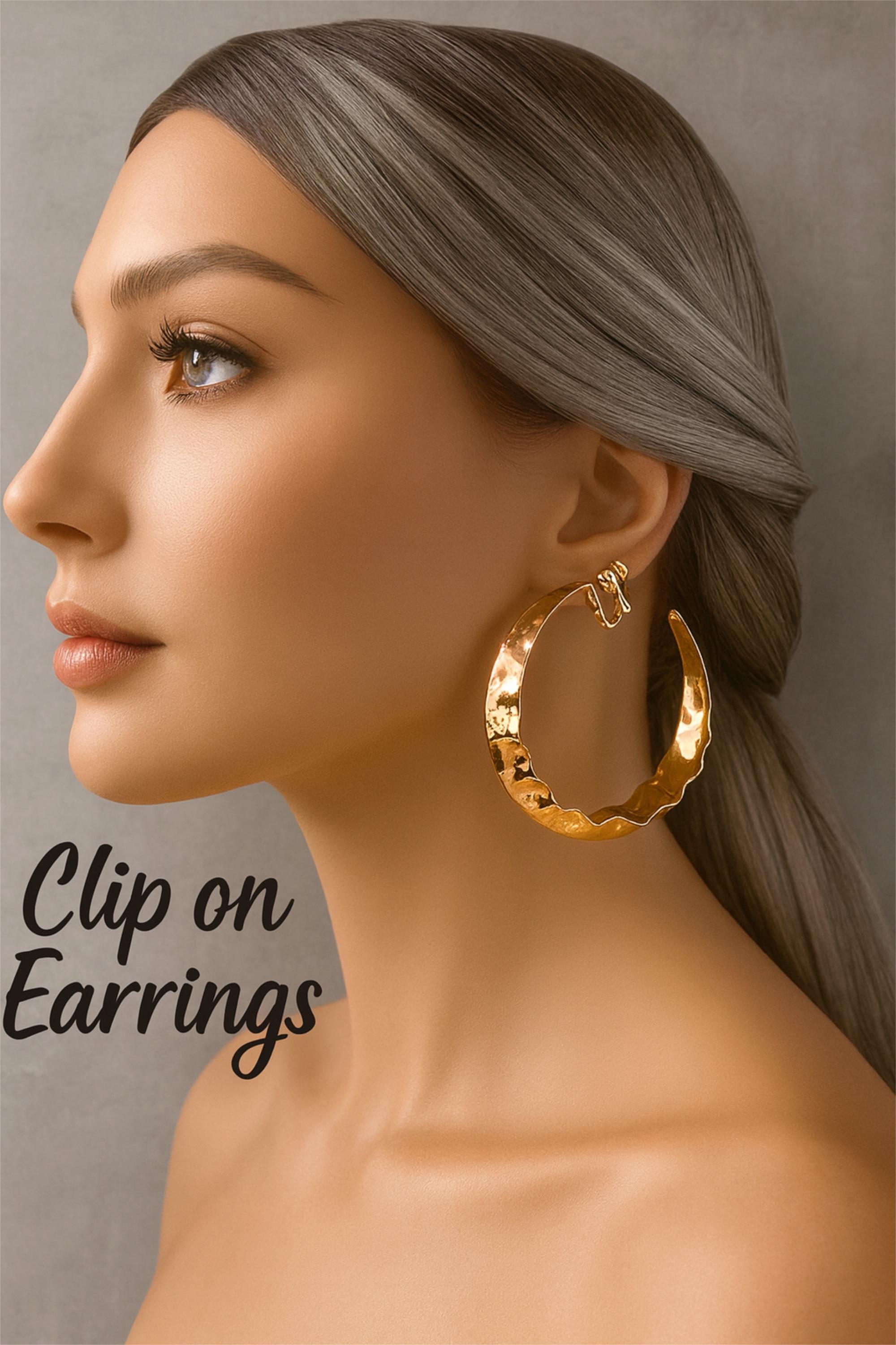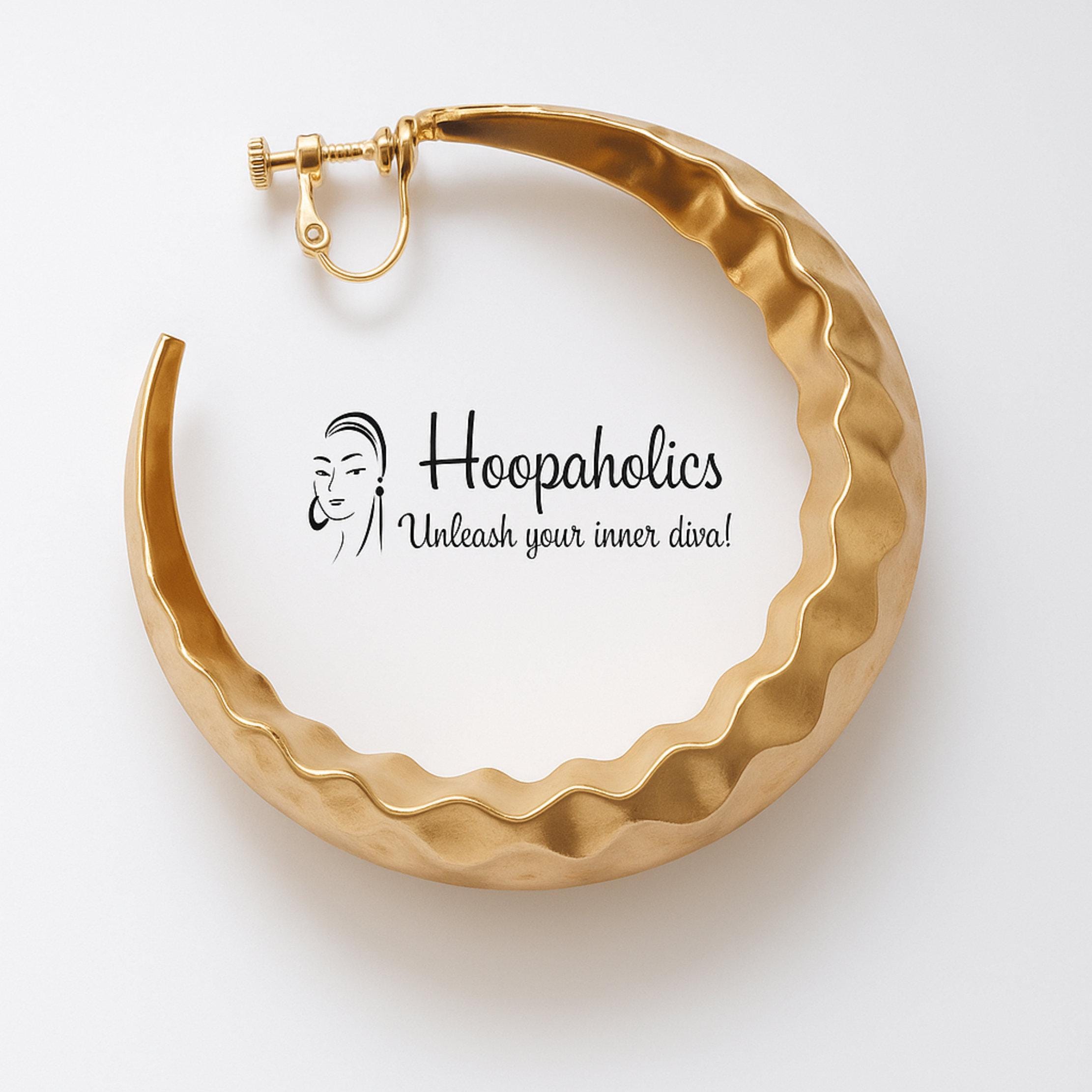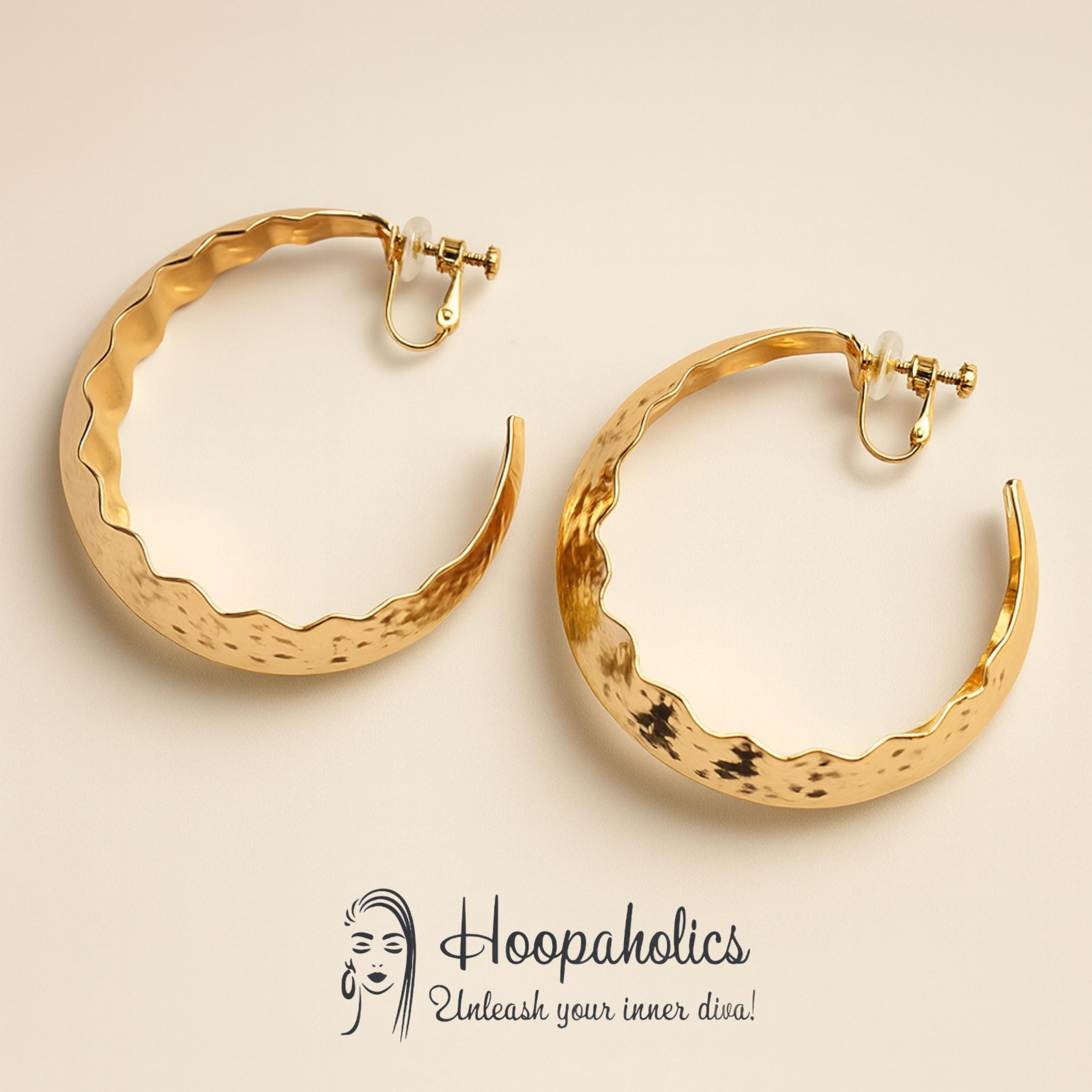 Step into bold, effortless glam with these large hammered wave-edge gold clip-on hoop earrings — perfect for anyone who loves a striking statement without needing pierced ears!