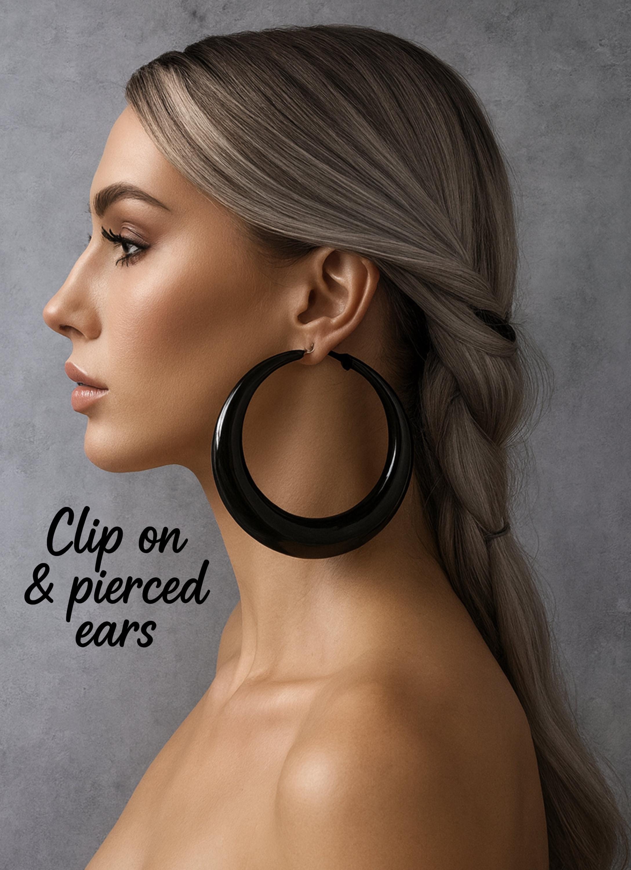 These oversized black hoops are the perfect statement piece if you love BIG, dramatic earrings. Smooth, glossy and lightweight, they instantly elevate any outfit and are ideal for everyday glam or a night out.