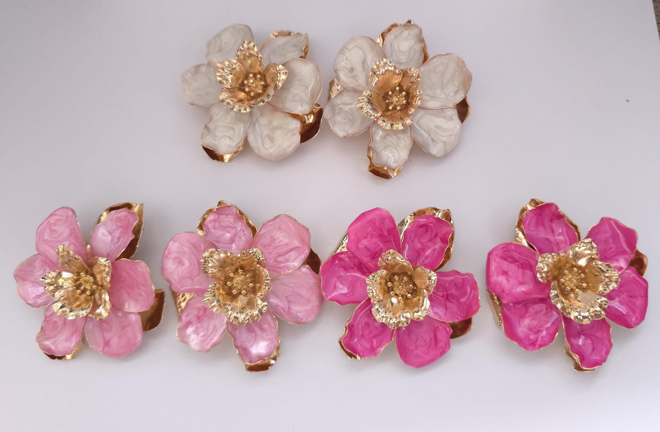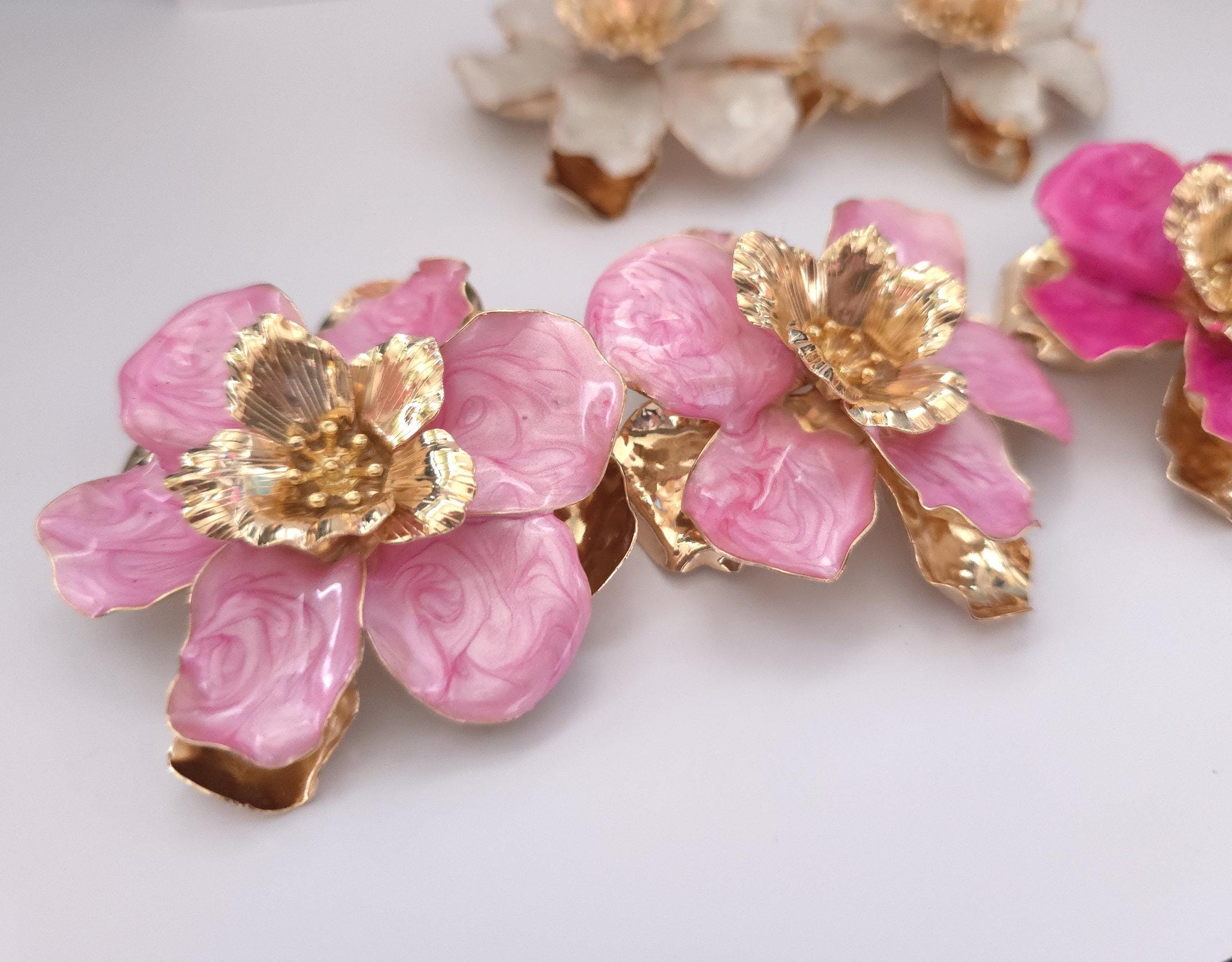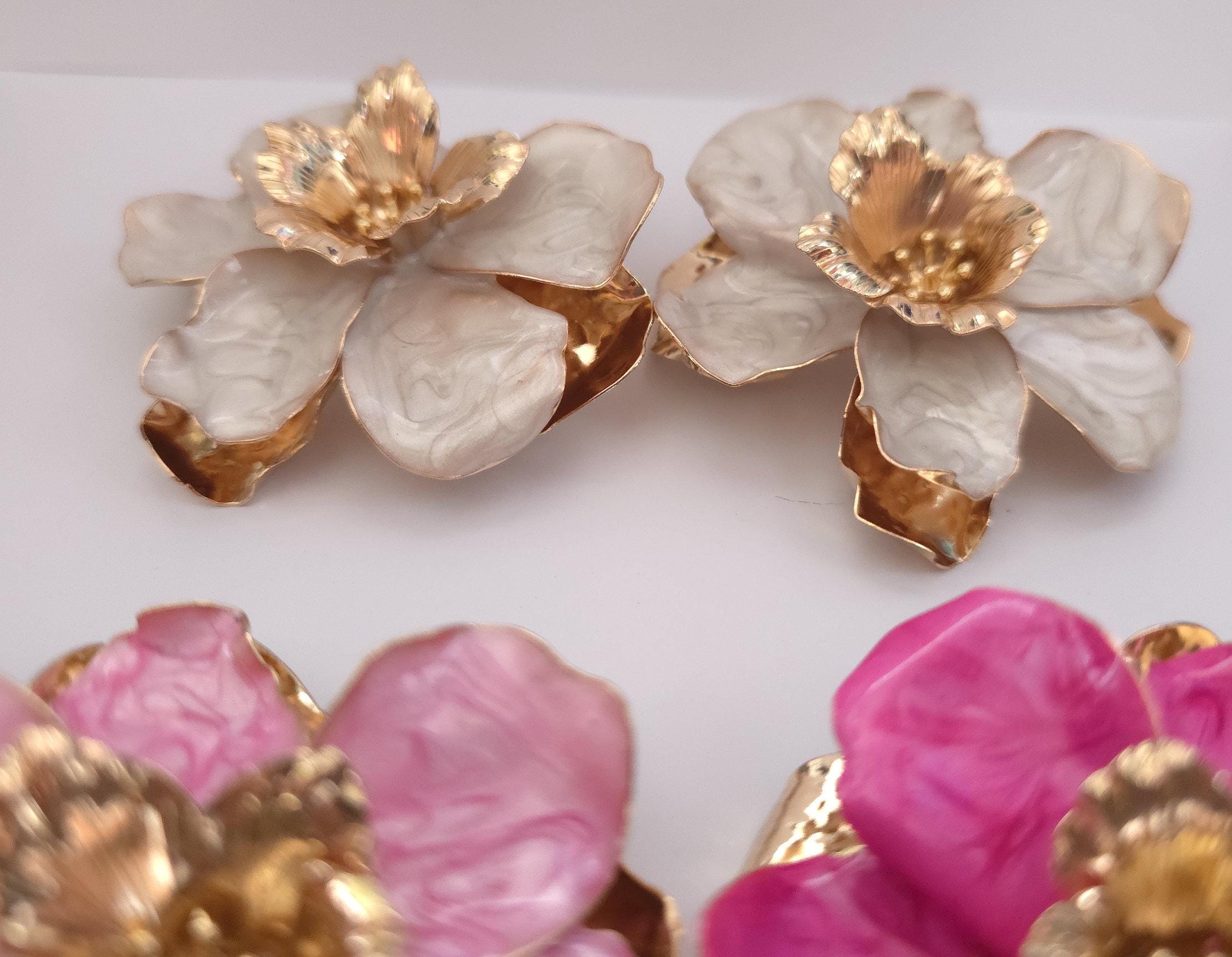 These stunning floral statement earrings feature marbled enamel petals with a gold-tone centre, creating a luxurious, high-impact look. Available in white, light pink, and hot pink, they’re the perfect accessory for weddings, parties, holidays, or everyday glam.