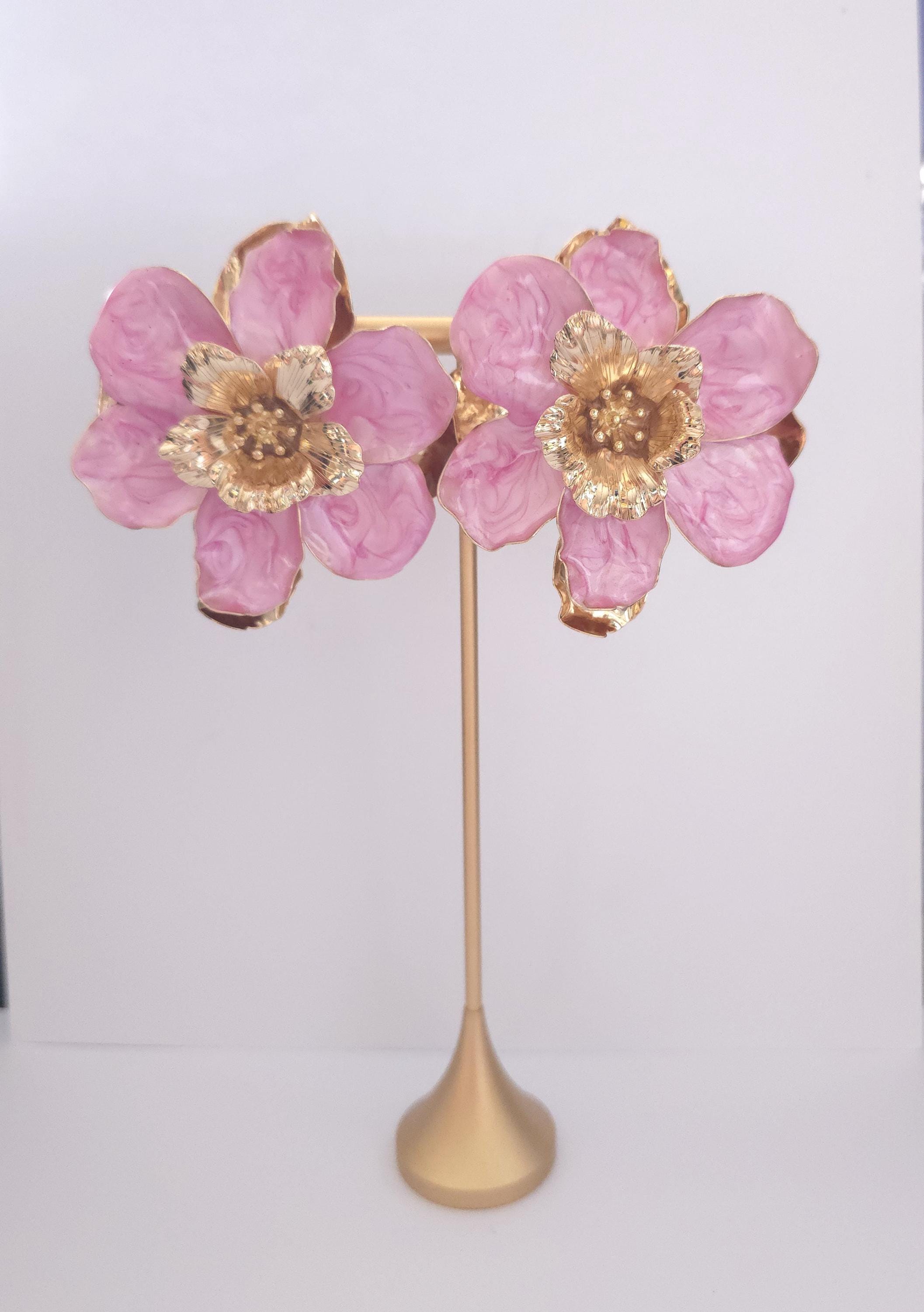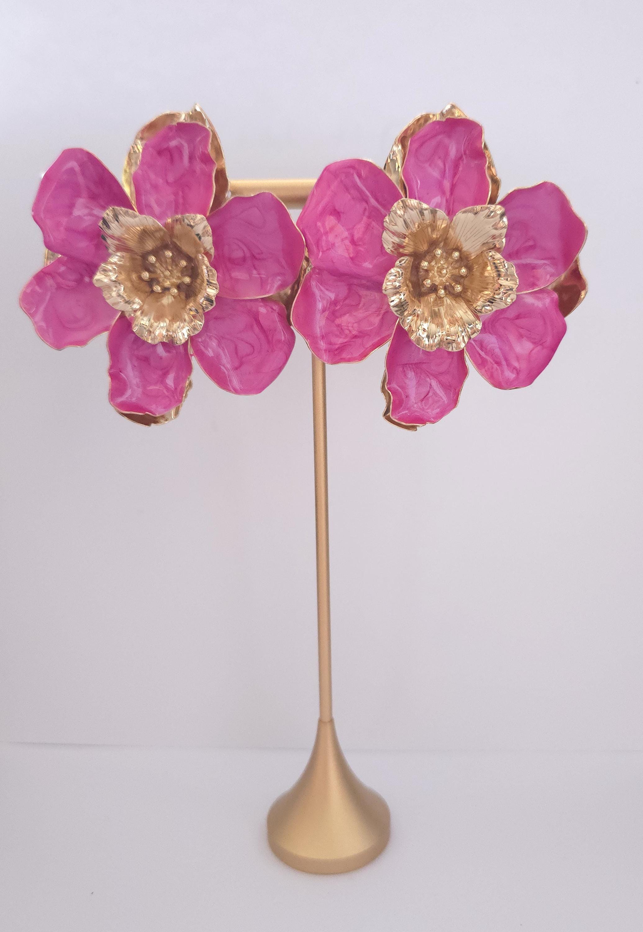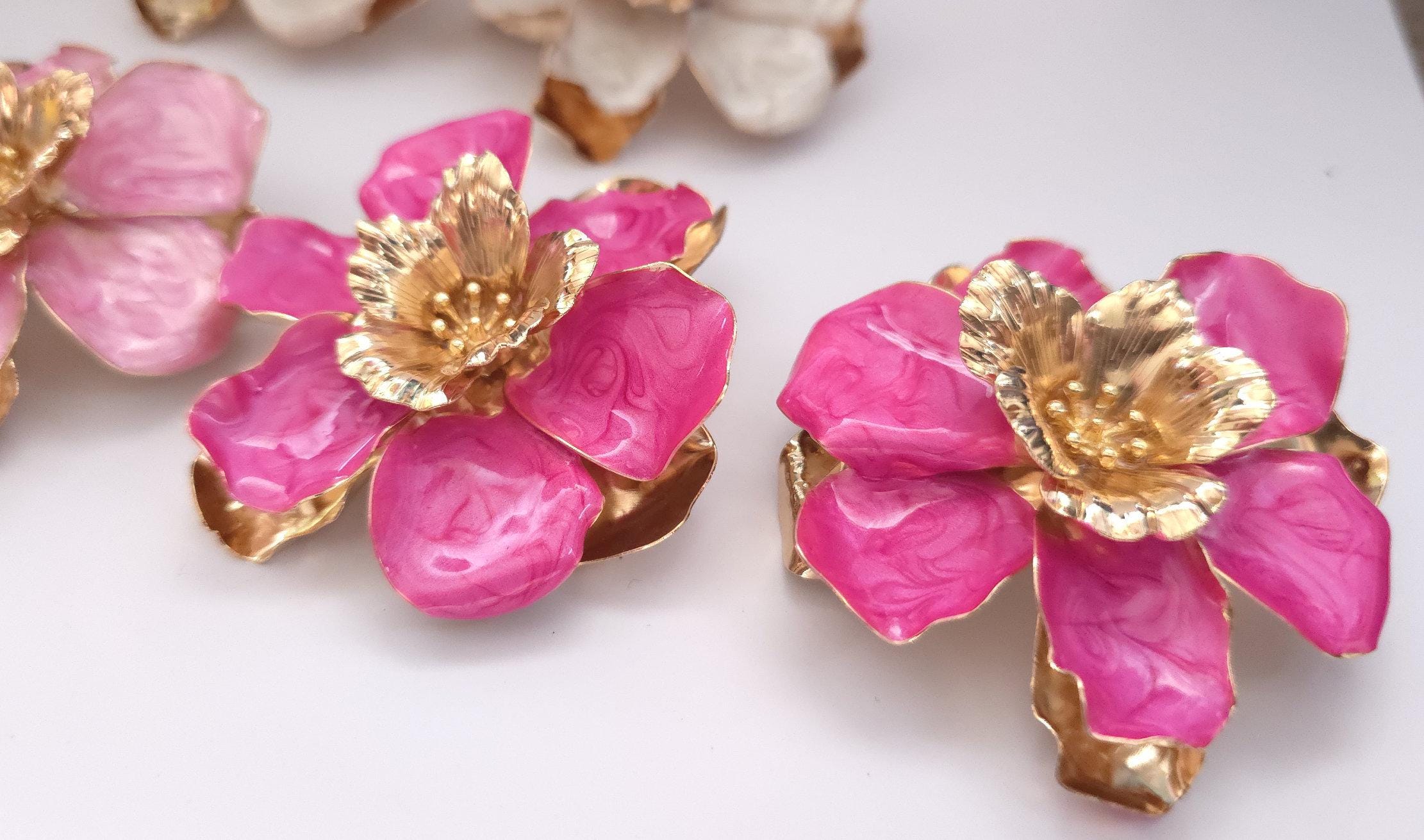 These stunning floral statement earrings feature marbled enamel petals with a gold-tone centre, creating a luxurious, high-impact look. Available in white, light pink, and hot pink, they’re the perfect accessory for weddings, parties, holidays, or everyday glam.