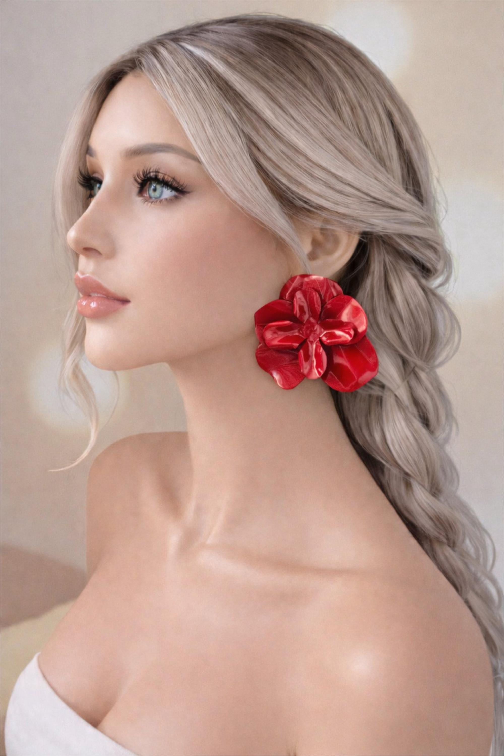 Designed to stand out, these 3D floral earrings feature layered sculpted petals for a striking, dimensional look. The bright red tone makes them perfect for spring outfits, weddings, holidays, or adding a pop of colour to a neutral look.