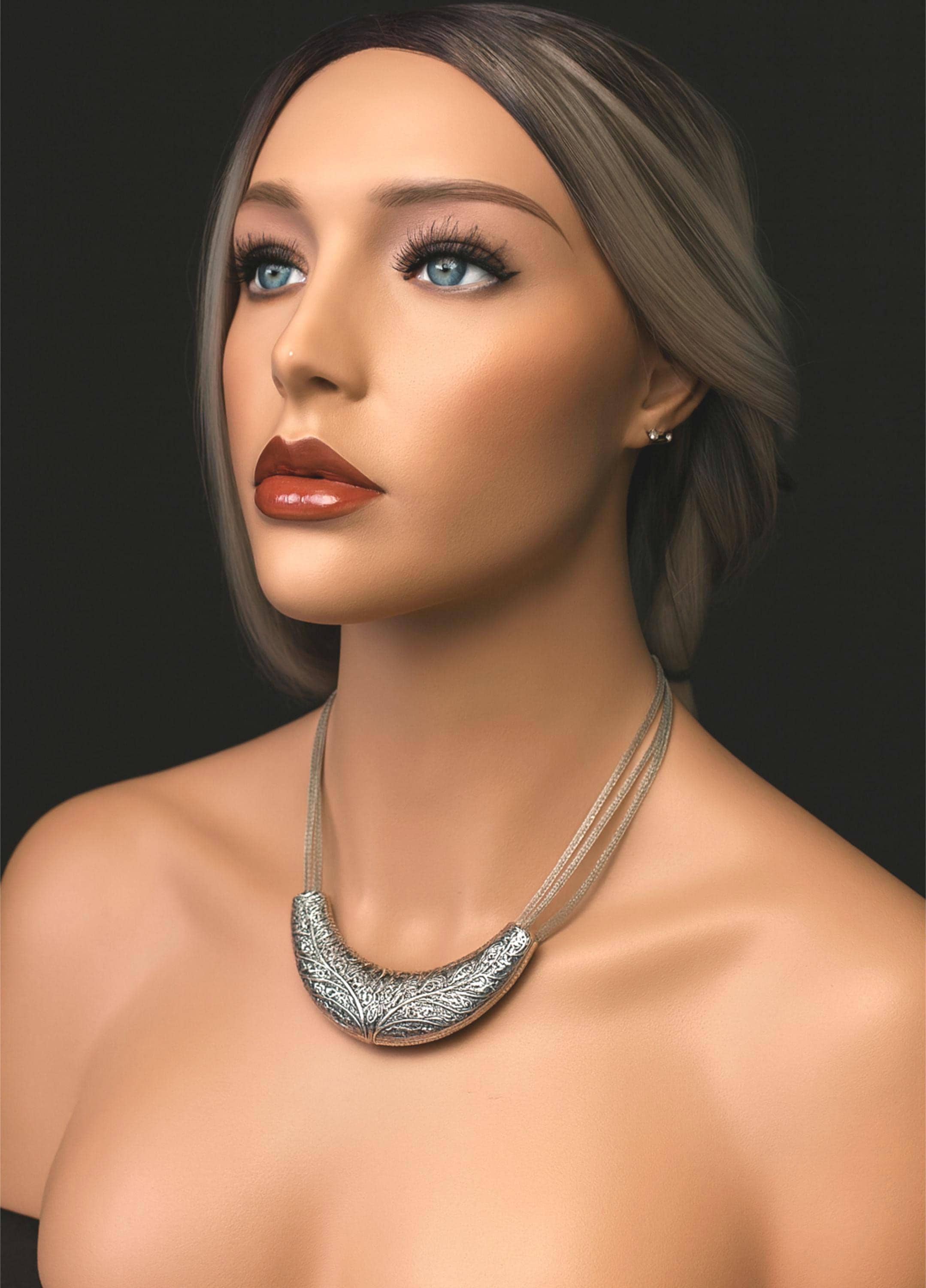 Featuring a beautifully engraved, textured metal pendant, this piece sits elegantly across the collarbone and brings a bold yet sophisticated look to both everyday wear and special occasions.