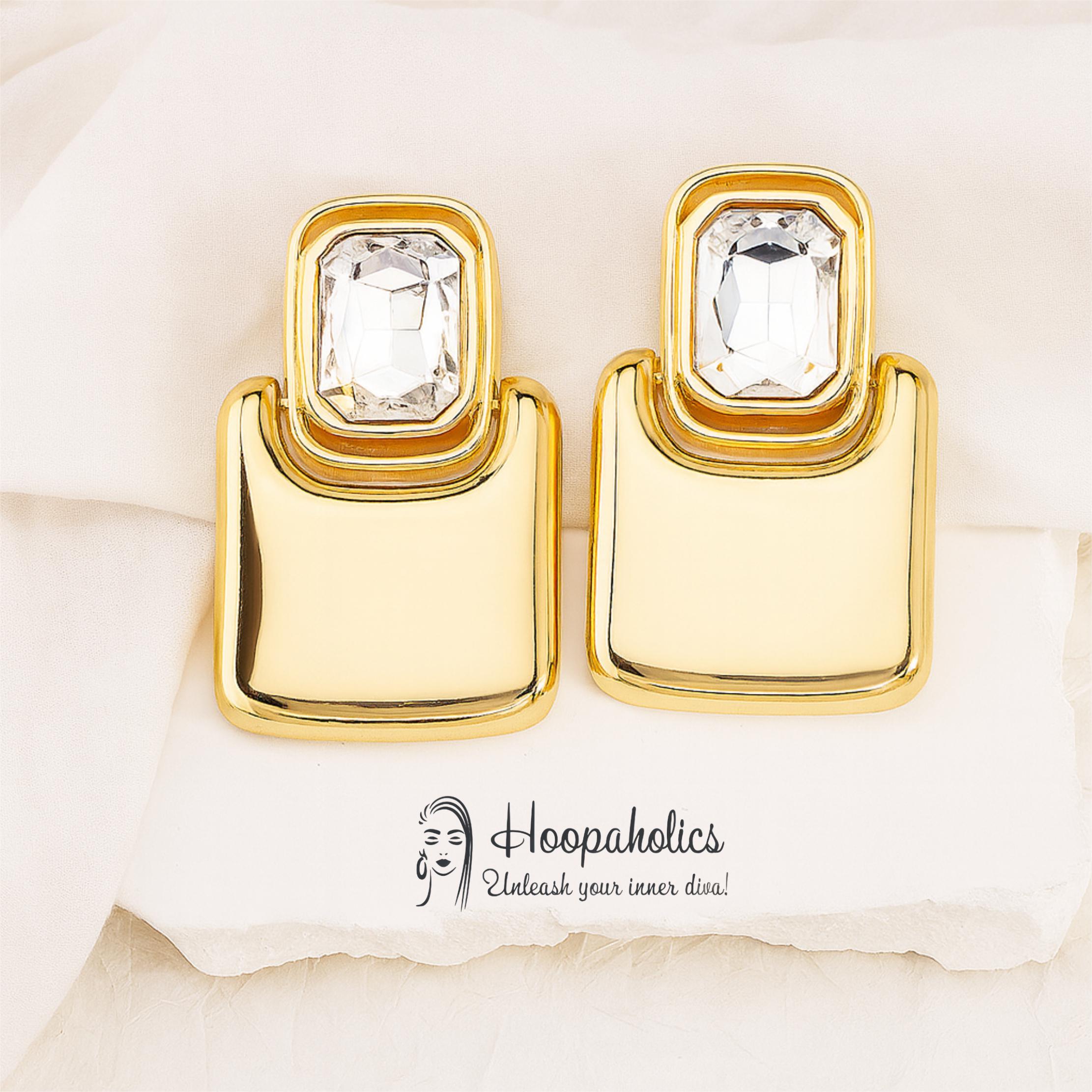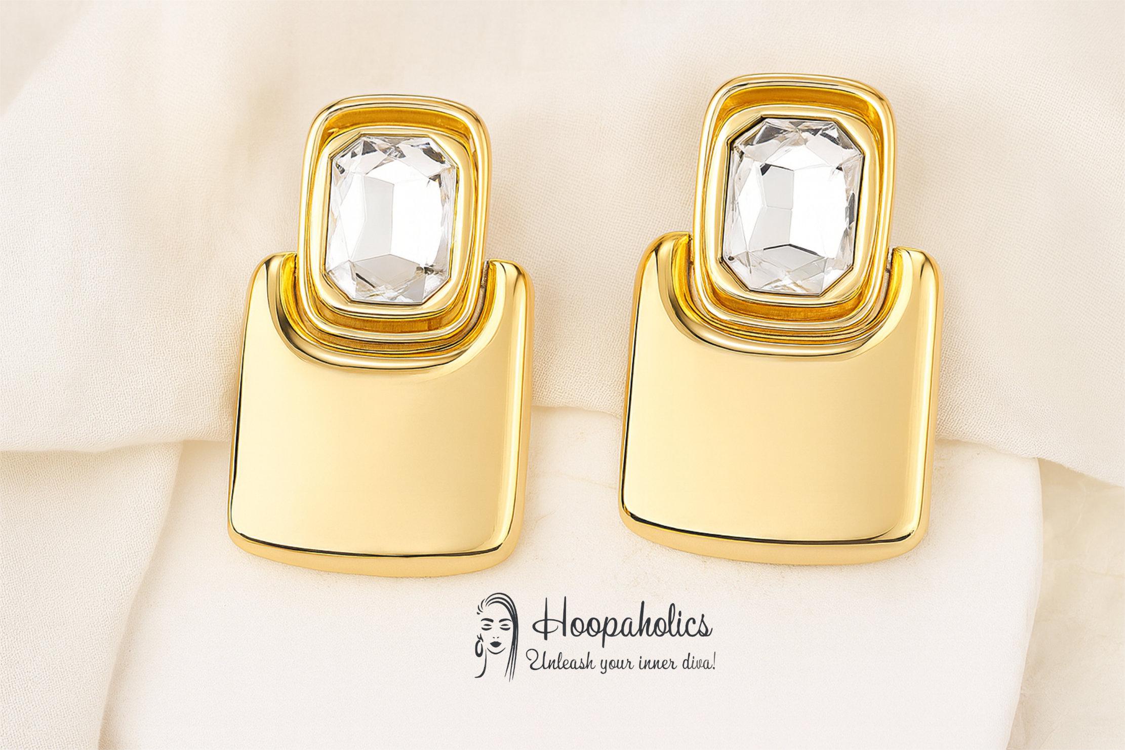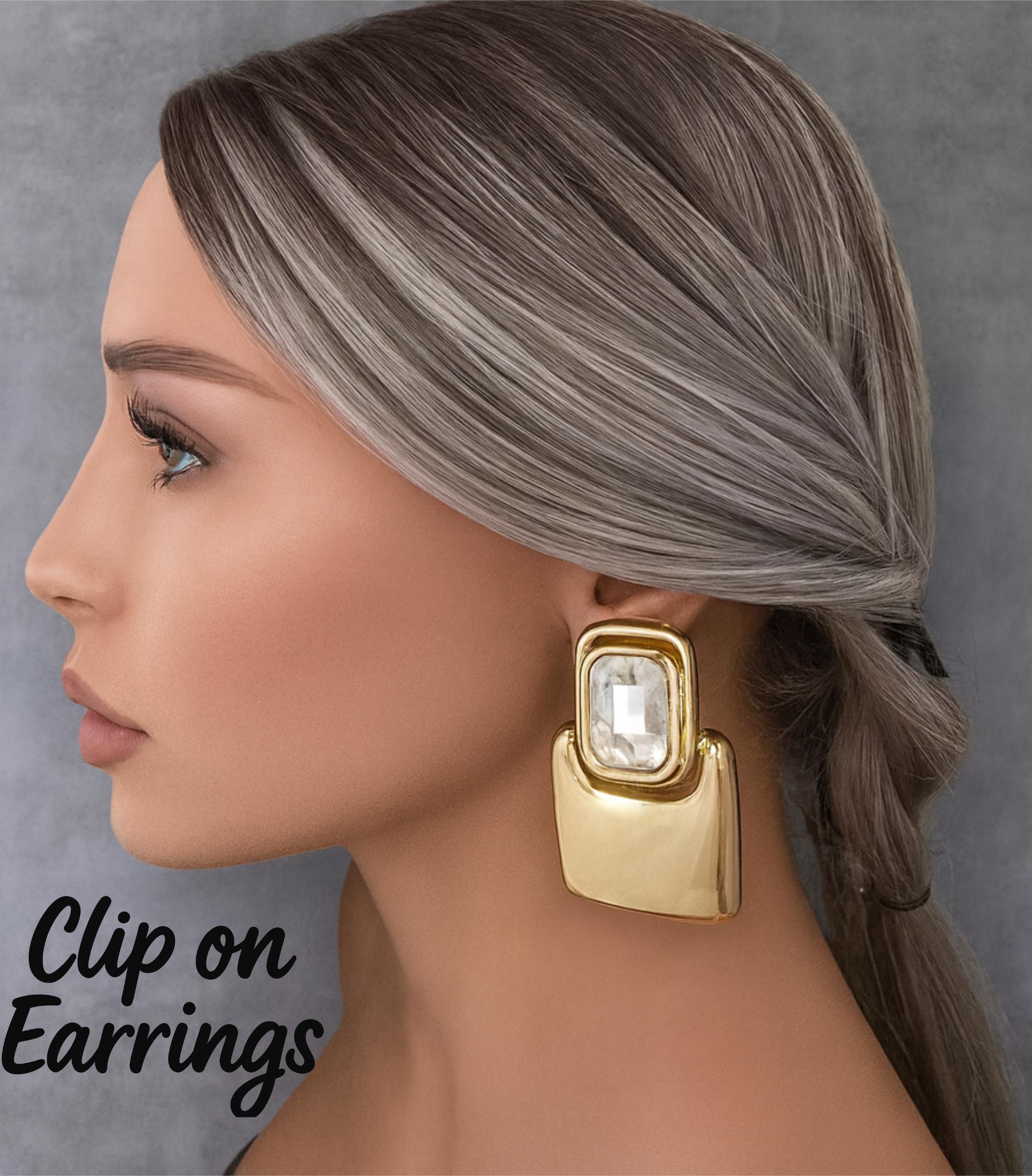 Turn heads with these bold statement clip-on earrings featuring a smooth, high-shine gold-tone finish and a sparkling clear crystal top giving a luxurious, retro-glam look. Perfect for nights out, parties, weddings, and adding instant elegance to any outfit.
