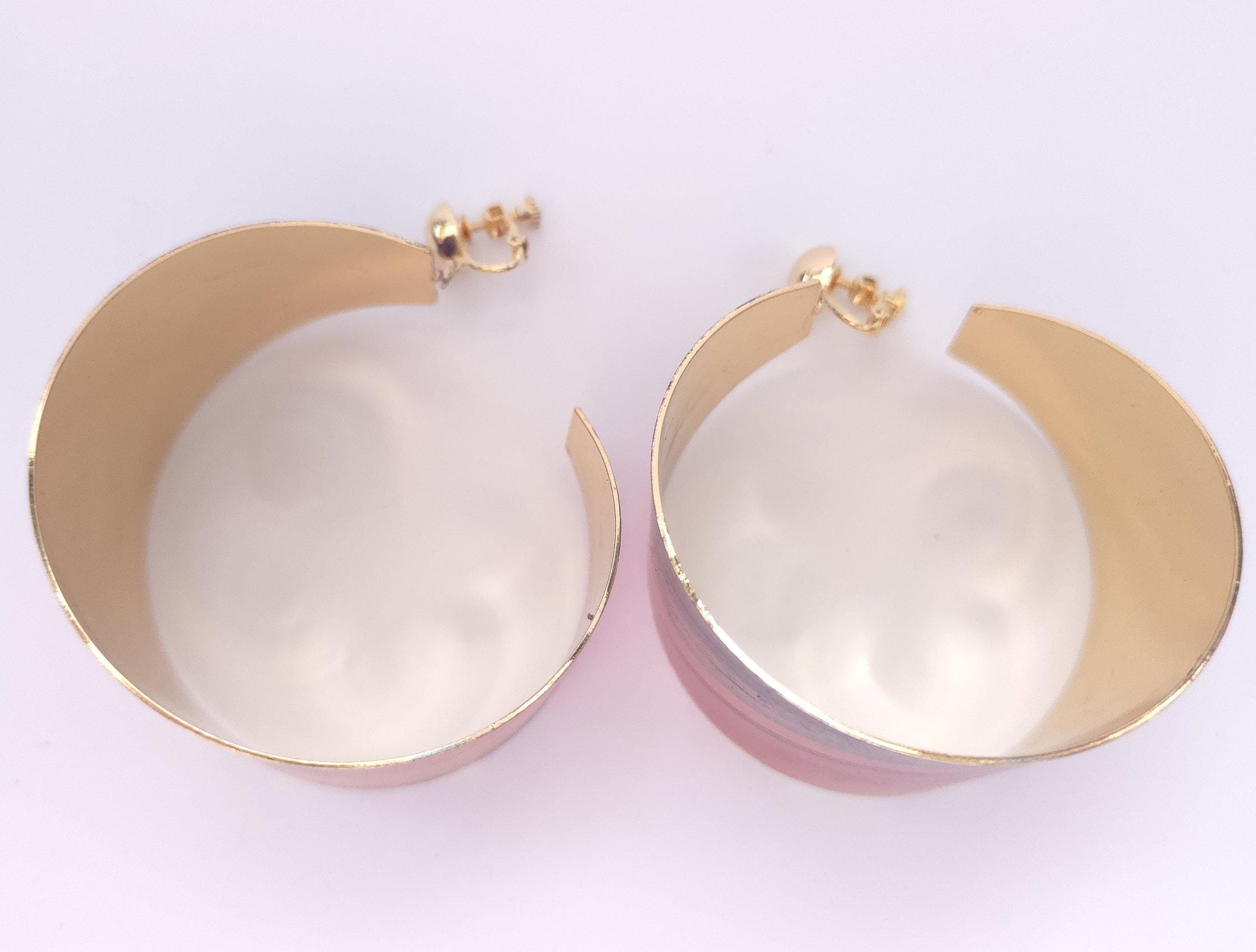 Featuring a smooth curved hoop with a striking multi-colour gradient finish and a polished gold-tone inner lining, these hoops catch the light beautifully from every angle. Their wide, chunky profile makes them perfect for dressing up a simple outfit or adding drama to an evening look.