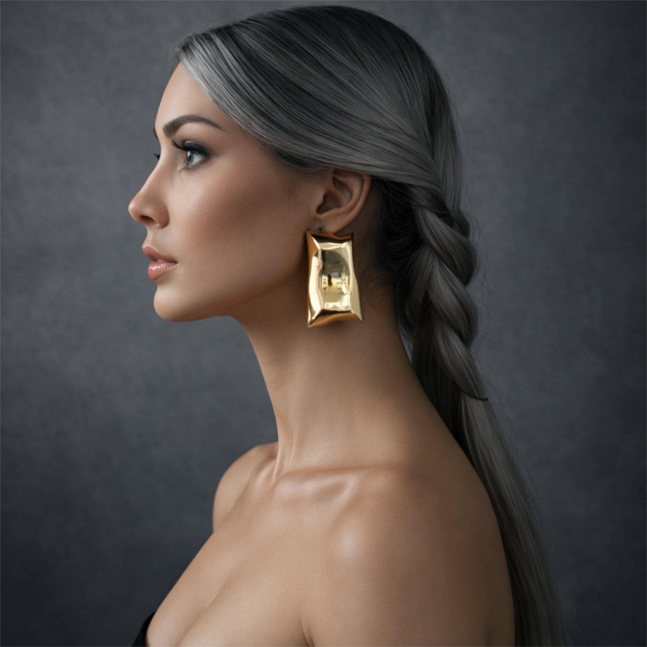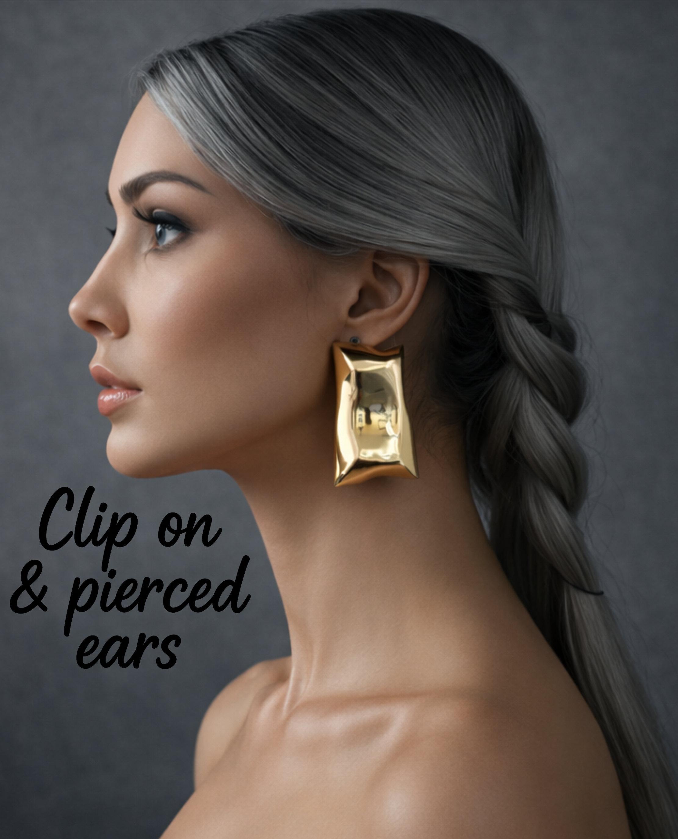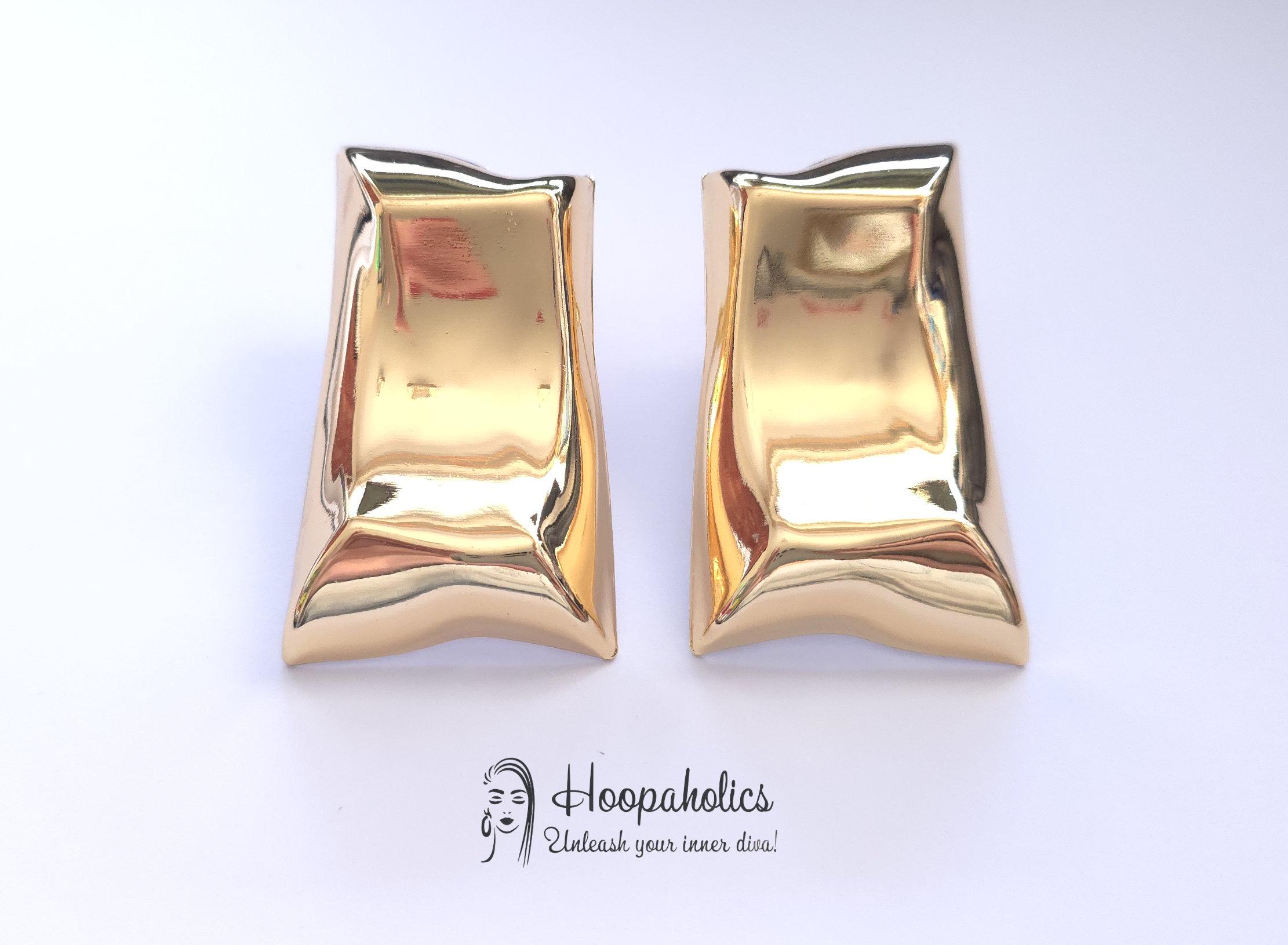 Featuring a high-shine polished finish and a sculptural rectangular drop shape, these earrings bring instant drama to any outfit — perfect for parties, events, or elevating everyday wear.