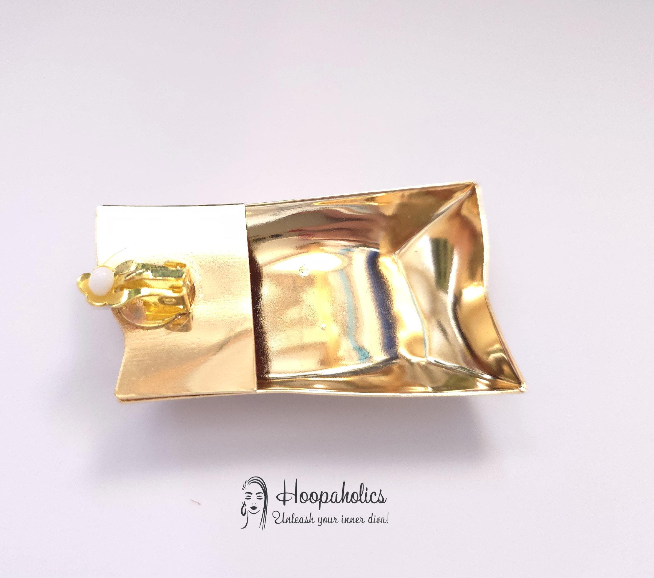 These large gold tone geometric clip-on earrings are designed for comfort and impact, offering a sleek, modern look in a striking statement size.