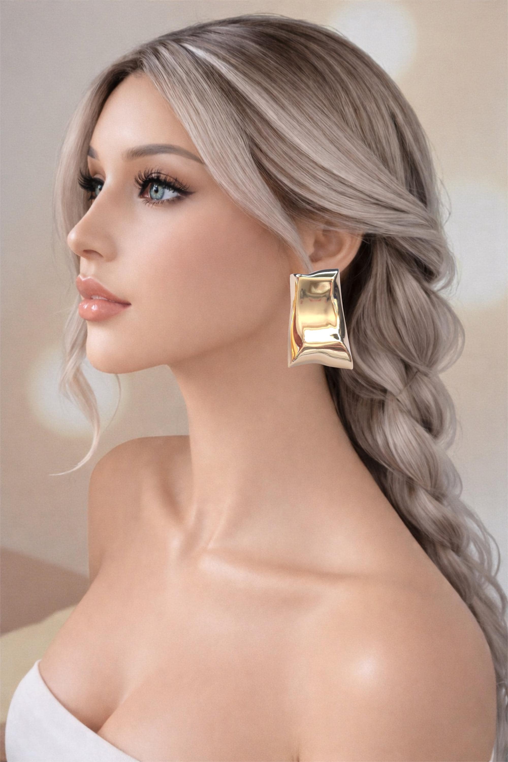 Featuring a high-shine polished finish and a sculptural rectangular drop shape, these earrings bring instant drama to any outfit — perfect for parties, events, or elevating everyday wear.