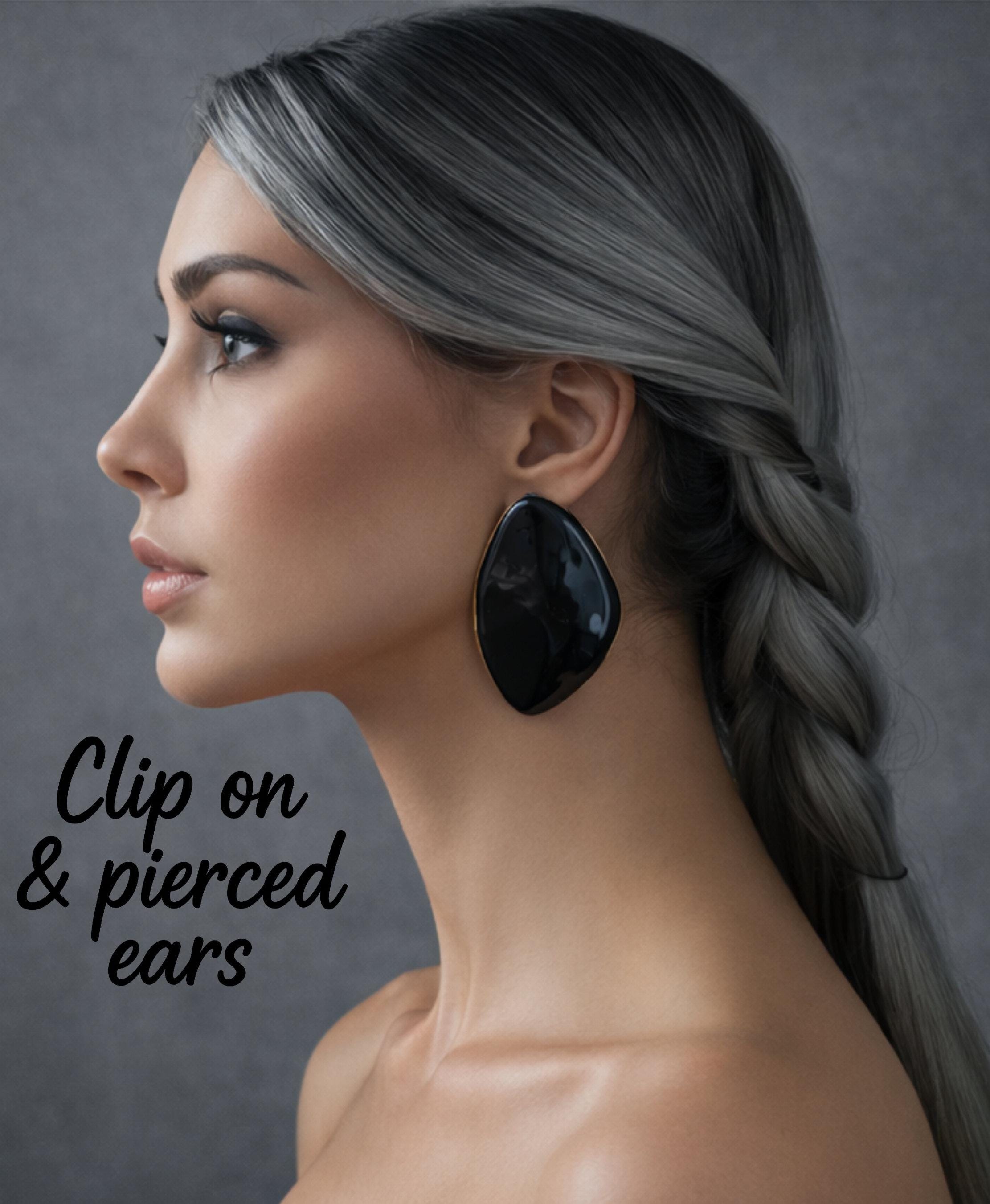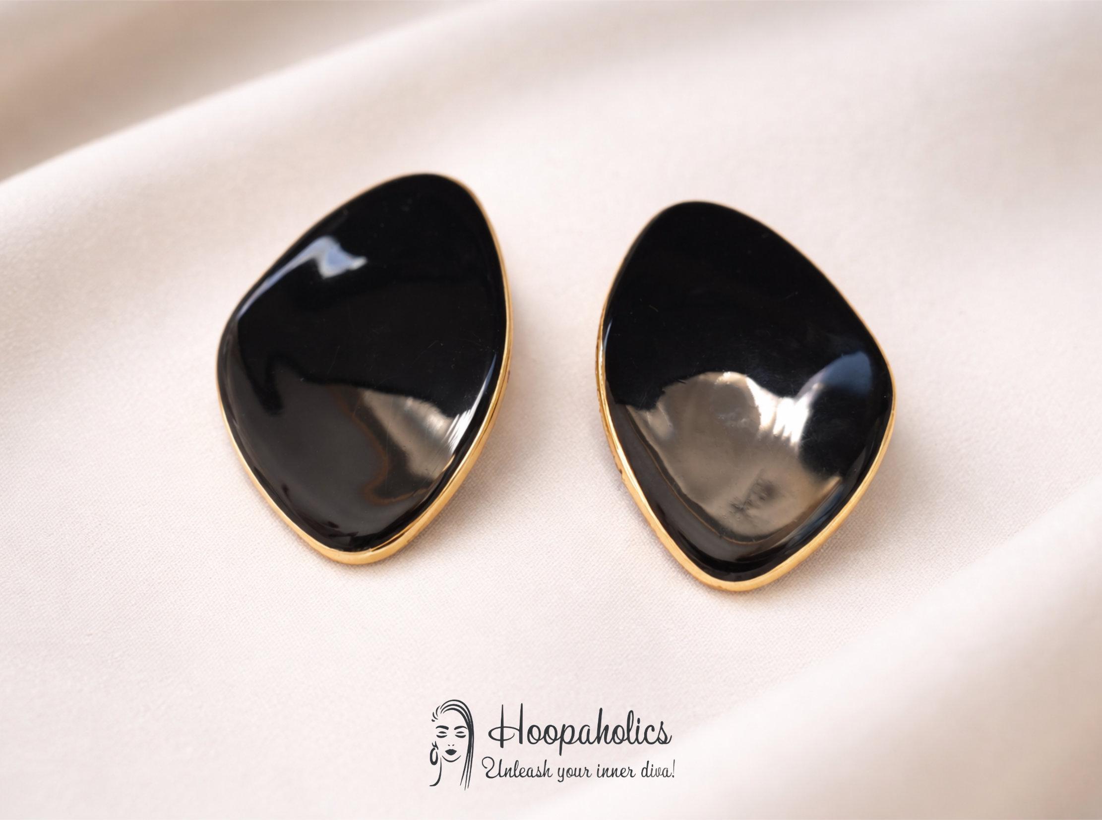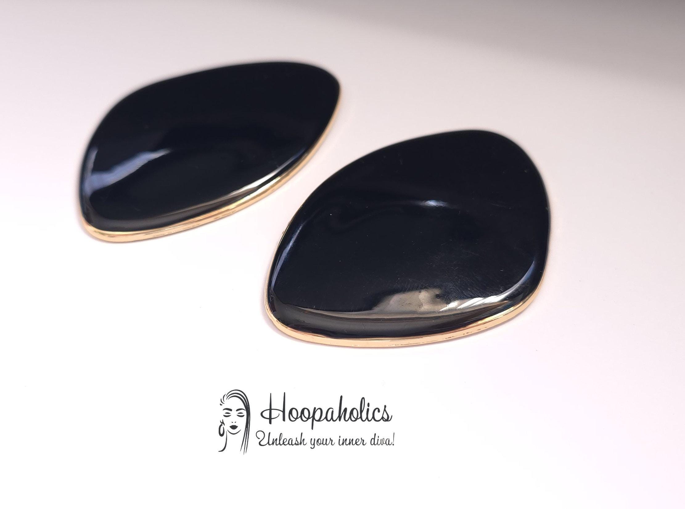 Make a bold statement with these sleek black enamel earrings, finished with a smooth gold-tone edge for a touch of understated glamour. The glossy black enamel creates a striking contrast against the warm gold trim, giving these earrings a modern yet timeless look.