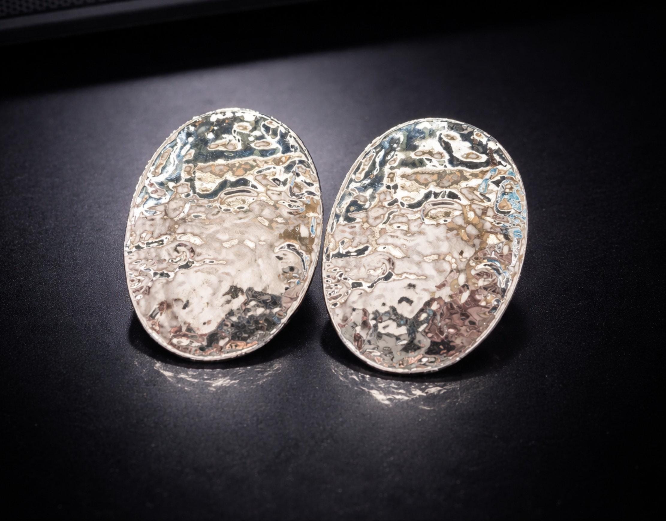Make a statement with these bold hammered oval earrings, designed to catch the light beautifully with their rich texture and organic finish.