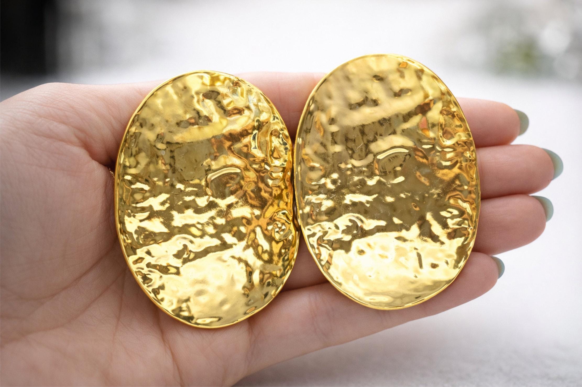 Each earring features a softly irregular, hammered surface that reflects light from every angle, giving them a luxe, high-end feel while remaining lightweight and comfortable to wear.